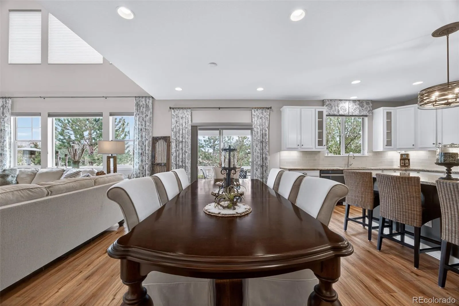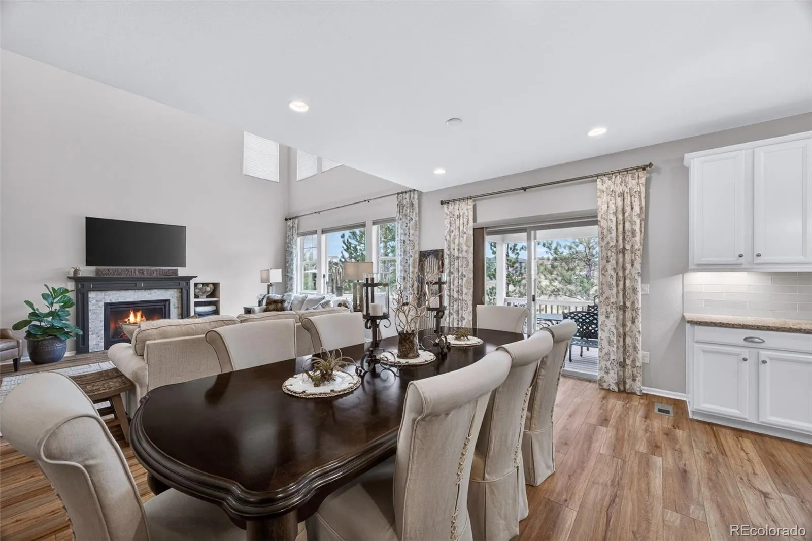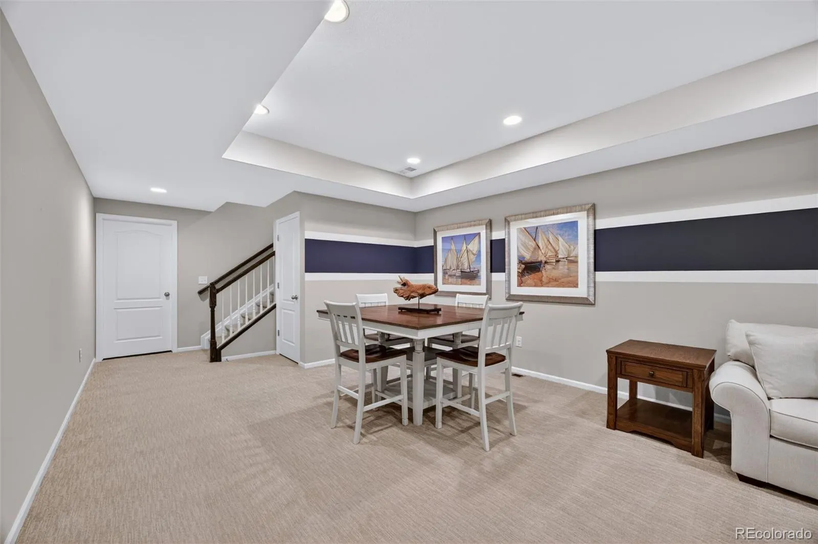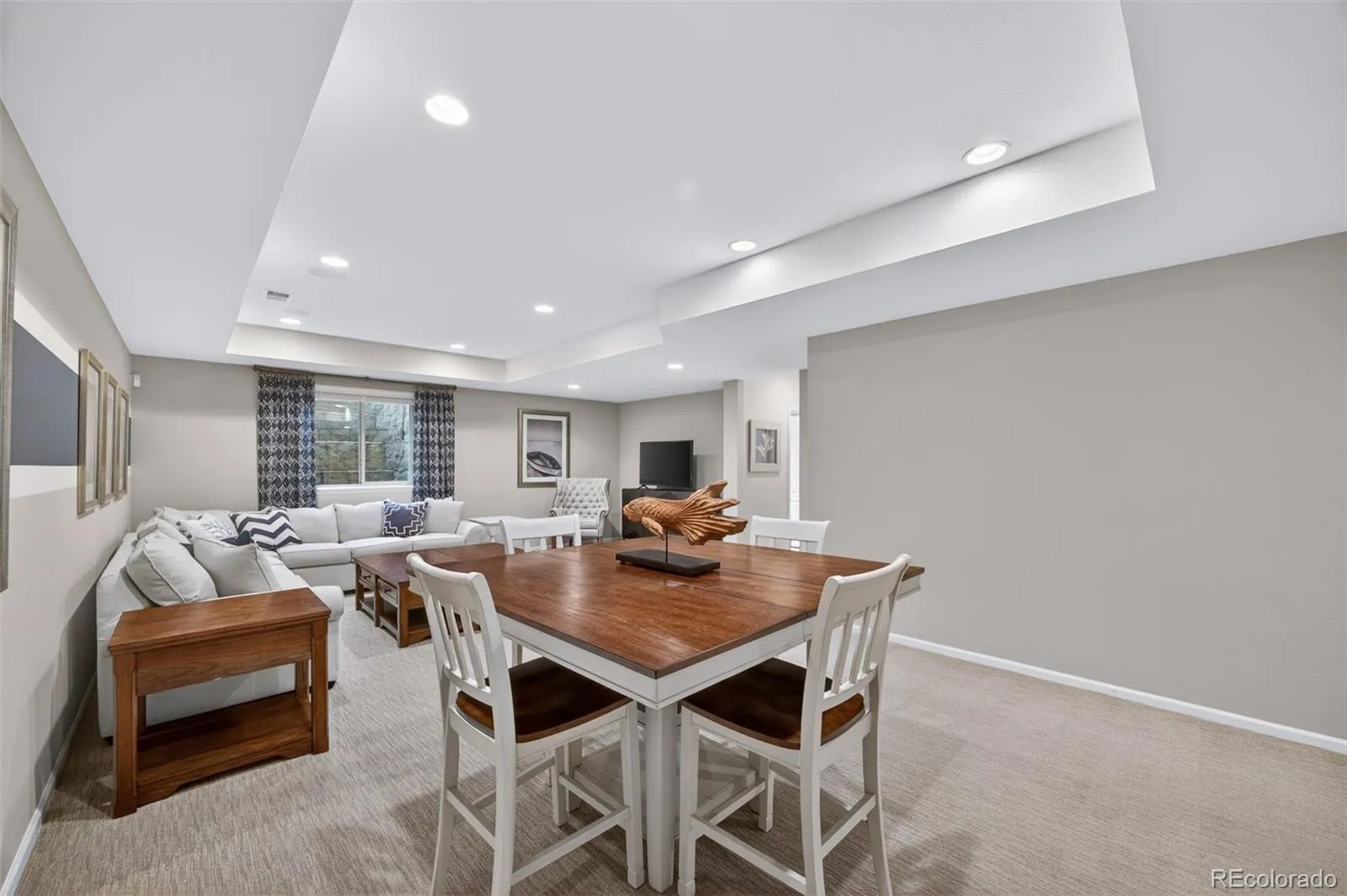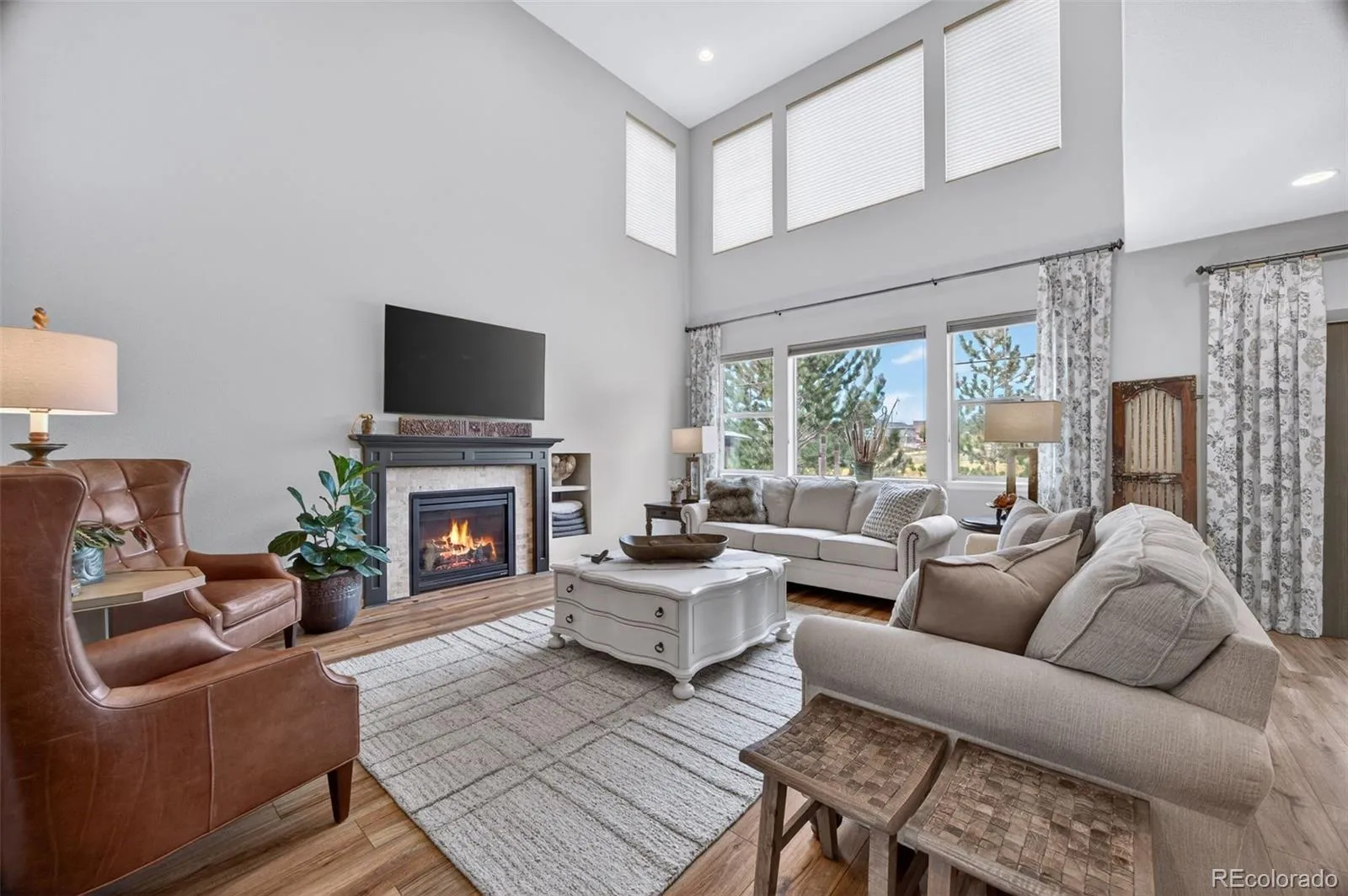 Welcome to 7045 S Robertsdale Way, a former model home in Southshore where thoughtful design, modern finishes, and everyday functionality come together in a bright, open layout. Just inside, a versatile front room offers space for a home office, sitting area, or flex space, enhanced by elegant wainscoting, along with black accent finishes and updated flooring (2022). The kitchen is a true standout featuring granite countertops, subway tile backsplash, abundant cabinetry, and a full suite of Samsung Bespoke appliances in striking navy blue stainless steel. The sleek glass front refrigerator includes an interior beverage center for both style and convenience, all flowing seamlessly into the main living and dining spaces. A mudroom just off the garage adds everyday ease, while the powder bath showcases a grasscloth wall treatment for a coastal-inspired touch. Upstairs, the spacious primary suite offers a walk-in closet and linen storage, complemented by well-appointed secondary bedrooms, including a guest room with a shiplap accent wall. A versatile loft provides space for a home office or additional living area, and the laundry room includes extra cabinetry for added function. The finished basement expands your living space with a large rec area, a guest bedroom with 8.8-foot ceilings, a full bathroom, and a 220V outlet—ideal for a home gym or workshop. Step outside to a low-maintenance backyard with turf and professionally designed landscaping, enhanced by Kichler exterior lighting controlled by an app. The home backs to open space with direct trail access to the Aurora Reservoir, nearby parks, and Southshore’s two community clubhouses—the Lakehouse and Lighthouse. With resort-style amenities, an oversized 2-car garage, and a whole-home lighting control system, this home offers a rare combination of design, convenience, and Colorado lifestyle.
