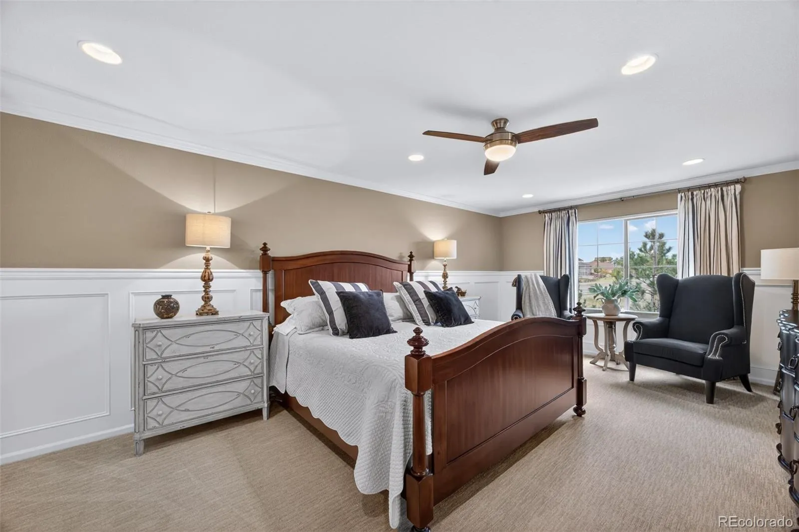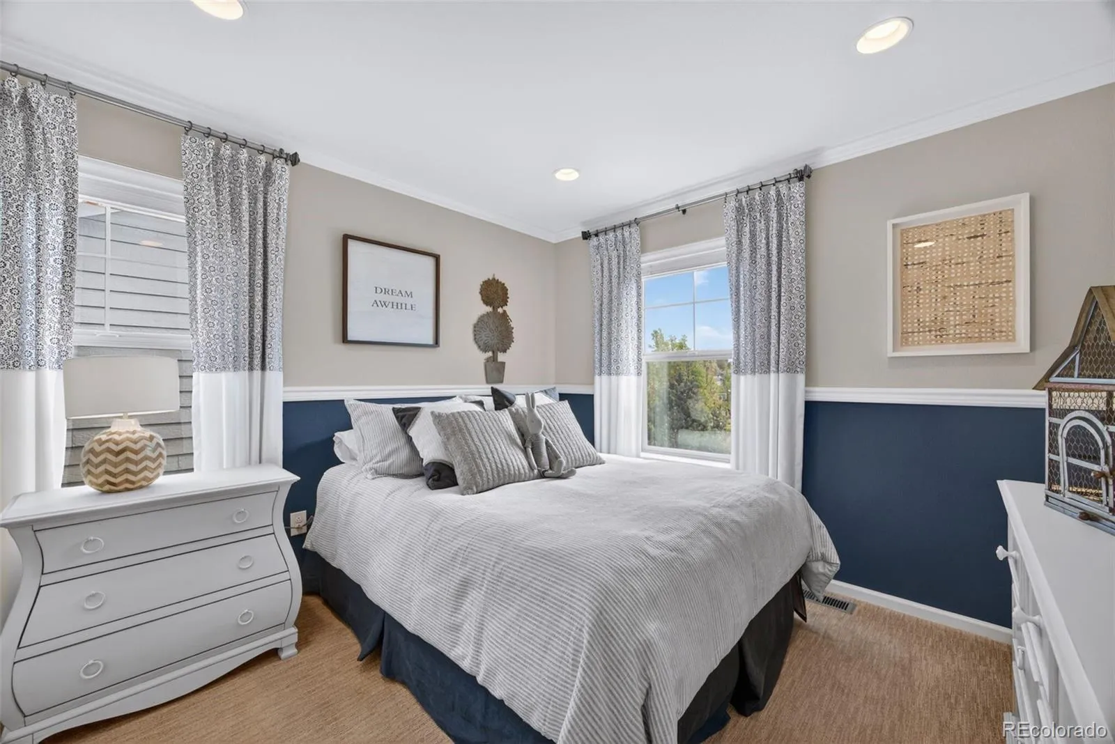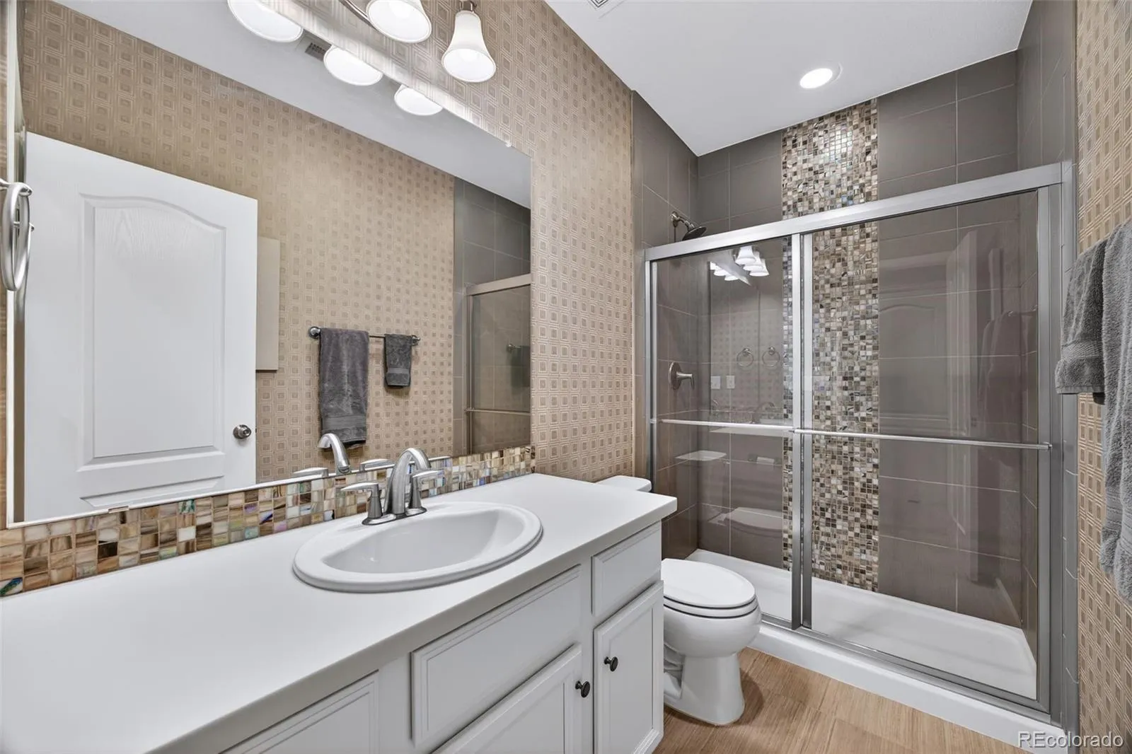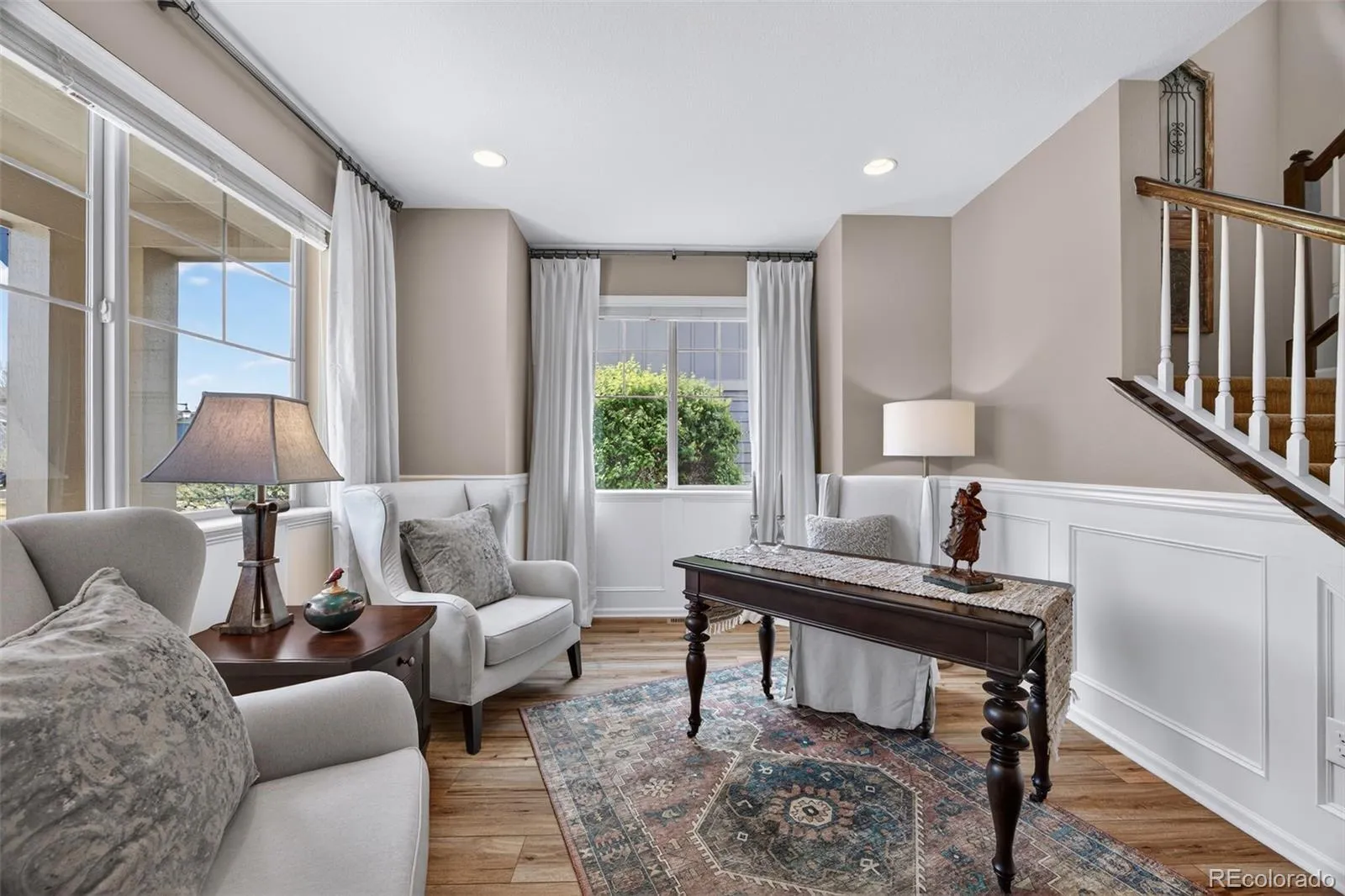 Welcome to 7045 S Robertsdale Way, a former model home in Southshore where thoughtful design, modern finishes, and everyday functionality come together in a bright, open layout. Just inside, a versatile front room offers space for a home office, sitting area, or flex space, enhanced by elegant wainscoting, along with black accent finishes and updated flooring (2022). The kitchen is a true standout featuring granite countertops, subway tile backsplash, abundant cabinetry, and a full suite of Samsung Bespoke appliances in striking navy blue stainless steel. The sleek glass front refrigerator includes an interior beverage center for both style and convenience, all flowing seamlessly into the main living and dining spaces. A mudroom just off the garage adds everyday ease, while the powder bath showcases a grasscloth wall treatment for a coastal-inspired touch. Upstairs, the spacious primary suite offers a walk-in closet and linen storage, complemented by well-appointed secondary bedrooms, including a guest room with a shiplap accent wall. A versatile loft provides space for a home office or additional living area, and the laundry room includes extra cabinetry for added function. The finished basement expands your living space with a large rec area, a guest bedroom with 8.8-foot ceilings, a full bathroom, and a 220V outlet—ideal for a home gym or workshop. Step outside to a low-maintenance backyard with turf and professionally designed landscaping, enhanced by Kichler exterior lighting controlled by an app. The home backs to open space with direct trail access to the Aurora Reservoir, nearby parks, and Southshore’s two community clubhouses—the Lakehouse and Lighthouse. With resort-style amenities, an oversized 2-car garage, and a whole-home lighting control system, this home offers a rare combination of design, convenience, and Colorado lifestyle.