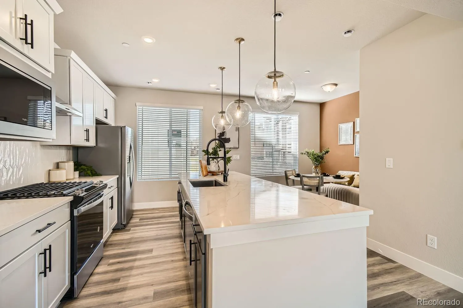 The entry level features a private bedroom with a full bath. Ideal for guests, a home office, or a peaceful retreat. On the second floor, you’ll find an open-concept living space filled with natural light, highlighted by a chef-inspired kitchen with crisp white cabinetry, a bright and inviting living area, and a dedicated dining space perfect for entertaining.