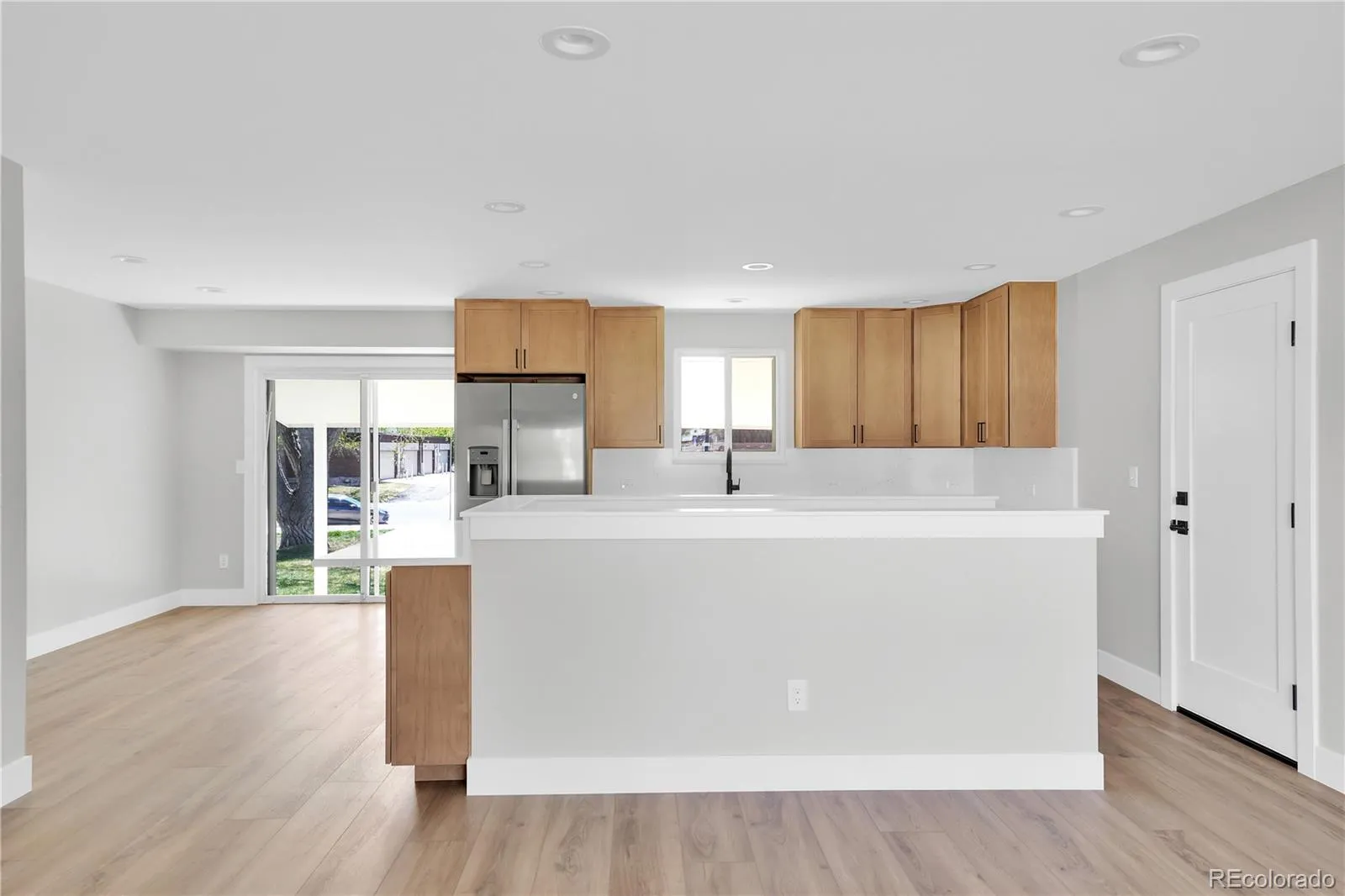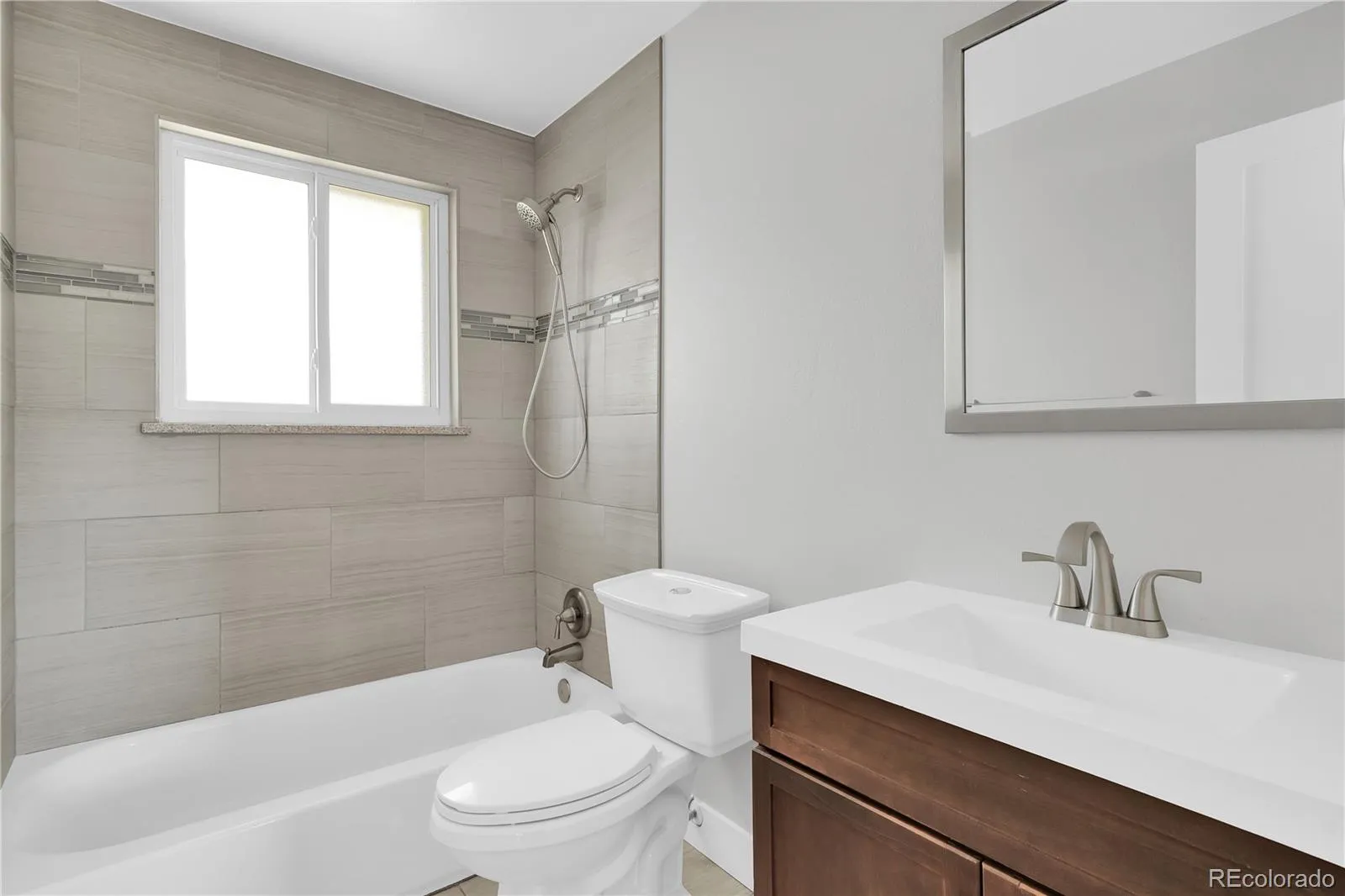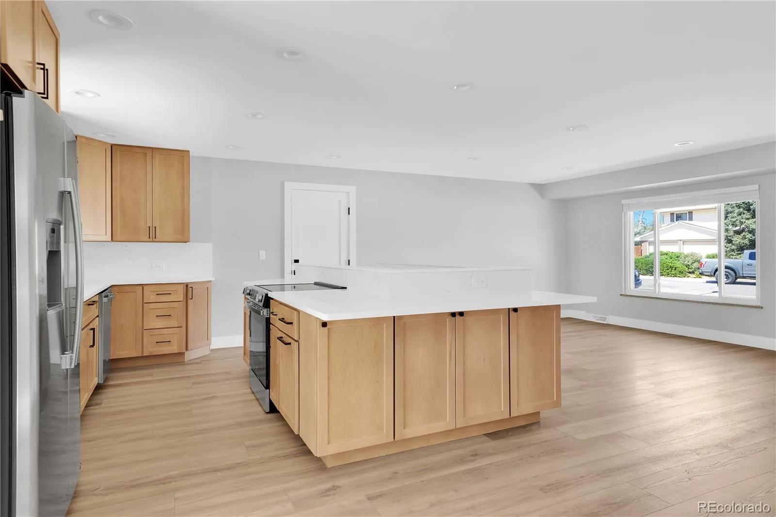 Quintessential brick ranch on a spacious corner lot, offering 4 bedrooms, 2 baths, and a 1-car attached garage – all thoughtfully updated and move-in ready. Inside, you’ll find gleaming hardwood floors in the upstairs bedrooms and brand-new luxury vinyl flooring throughout the main level. The completely renovated kitchen shines with custom maple cabinetry, striking Myora Gold quartz countertops and full backsplash, counter-height bar seating, a pantry cabinet, and all-new GE stainless steel appliances. An inviting eat-in nook features a vinyl slider that opens directly to the covered back patio – perfect for indoor/outdoor living. The main level has been elevated with brand new single-panel solid core doors, matte black hardware, contemporary base trim and door casings. Vinyl windows with new faux wood blinds throughout and new recessed lighting bring in abundant natural light while enhancing the home’s modern feel. Downstairs, the full, finished basement is light, bright, and open, featuring a legal bedroom with egress window and a large closet, plus a recently updated ¾ bath with a new vanity, fixtures, and faucets. An additional storage room, a laundry area with washer and dryer and fresh upgraded carpet and pad complete the lower level. Enjoy peace of mind for years to come with fresh interior and exterior paint along with newly refreshed landscaping including stepping stones, cobble accents, and mature bushes. The expansive ~15,000 sq ft yard offers incredible space, shaded by mature trees – ideal for pets, relaxing or entertaining. Perfectly located just steps from Jewell Park and Kendrick Lake Park, and a short distance to the 379-acre Bear Creek Greenbelt. With convenient access to the foothills, DTC, and Downtown Denver, this home blends classic charm with modern updates in an unbeatable location. You won’t find an updated, move-in ready home on a large lot like this very often. Don’t miss your opportunity! Seller is conducting a 1031 tax deferred exchange.