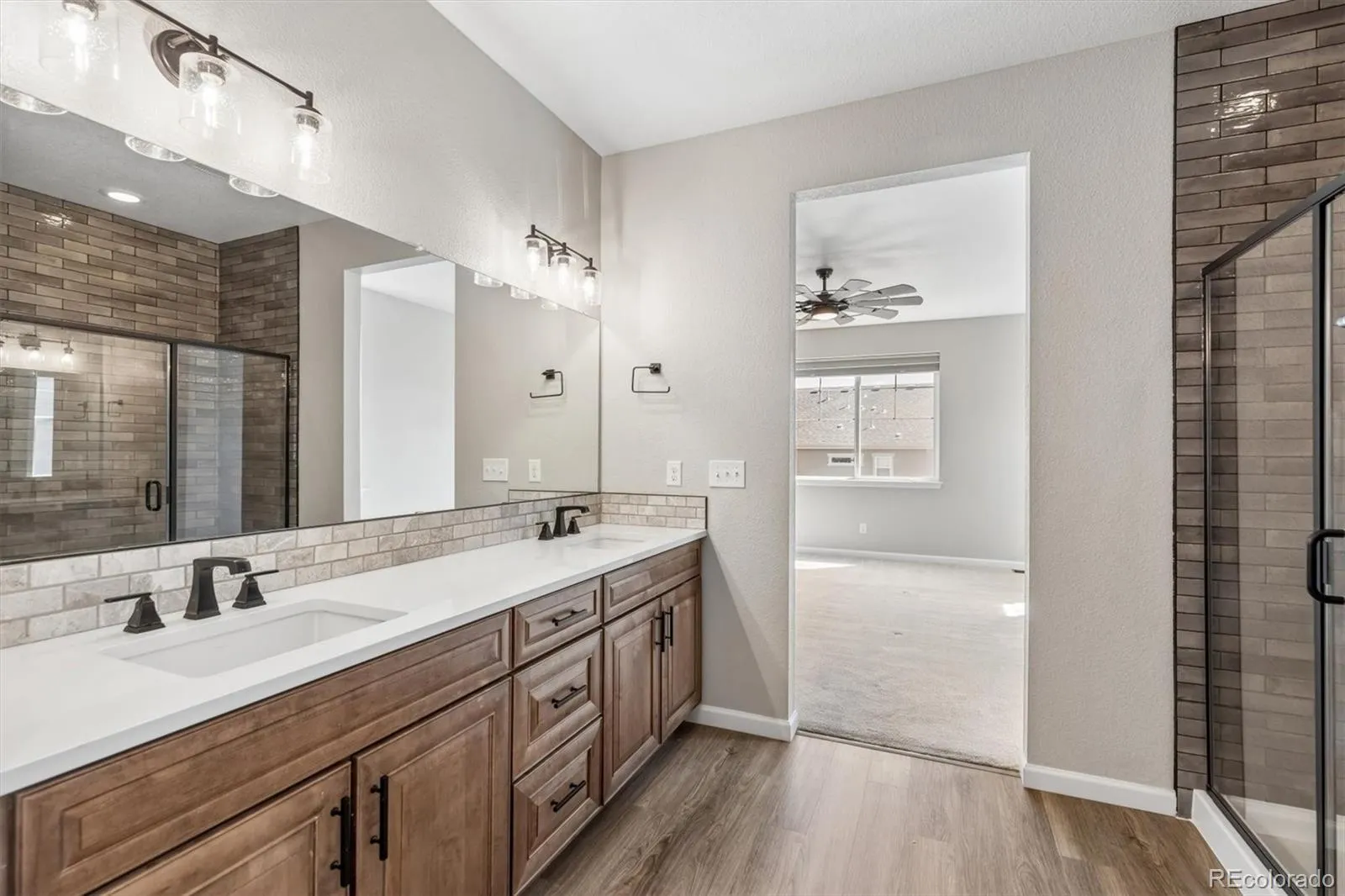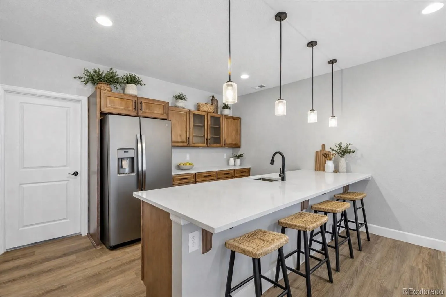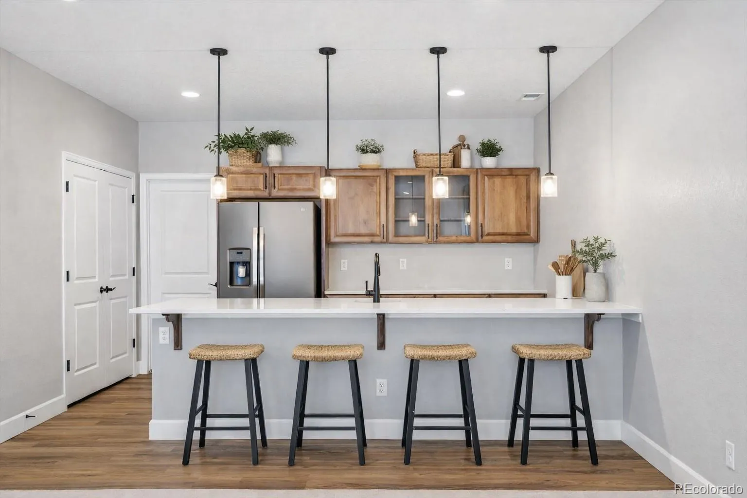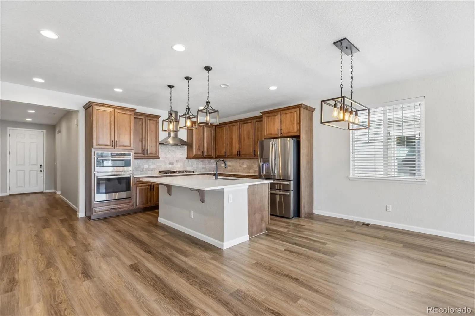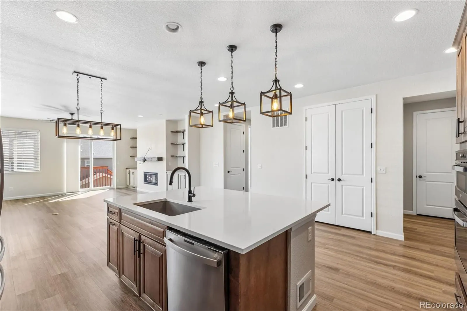 Set within Crystal Valley Ranch, this nearly new ranch delivers a level of finish, space, and livability that’s rarely found at this price point. Built in 2021 and meticulously maintained, the home blends modern design with a layout that feels both elevated and effortless. The main level makes an immediate impression with heightened ceilings, wide-plank flooring, and a light-filled living space anchored by a gas fireplace with custom built-in shelving. At the center of it all, the kitchen is both striking and functional! With gorgeous natural wood cabinetry, quartz countertops, a designer hood, stainless appliances, and an oversized island designed for gathering and entertaining! The primary suite is a true retreat! It’s generous in scale, private in feel, and complemented by a four-piece bath and an expansive walk-in closet. Two additional main-level rooms provide flexibility for bedrooms or a refined home office (one currently staged as a workspace, but can be non-conforming bedroom). A well-designed laundry room w/utility sink and an oversized two-car garage add to the home’s overall convenience. Downstairs, the beautifully finished walkout basement transforms the home into something exceptional. Thoughtfully designed for multi-generational living or extended stays, this “in-law suite” features a second kitchen/bar area, two spacious bedrooms with walk-in closets, a 3/4 bath, and additional unfinished space ready for a theater, gym, or future customization. The outdoor living is equally considered, w/ an extended walkout patio, low-maintenance turf yard, and xeriscaped front landscaping; creating a clean, modern aesthetic without the upkeep. Look around, notice the upgraded light fixtures, the custom accent tile in the bathrooms, the built-in shelving.. all features that make this home stand out. Its so warm & inviting! Homes with this level of finish, flexibility, and presence simply don’t come along often. Truly a standout opportunity & ready to be called home