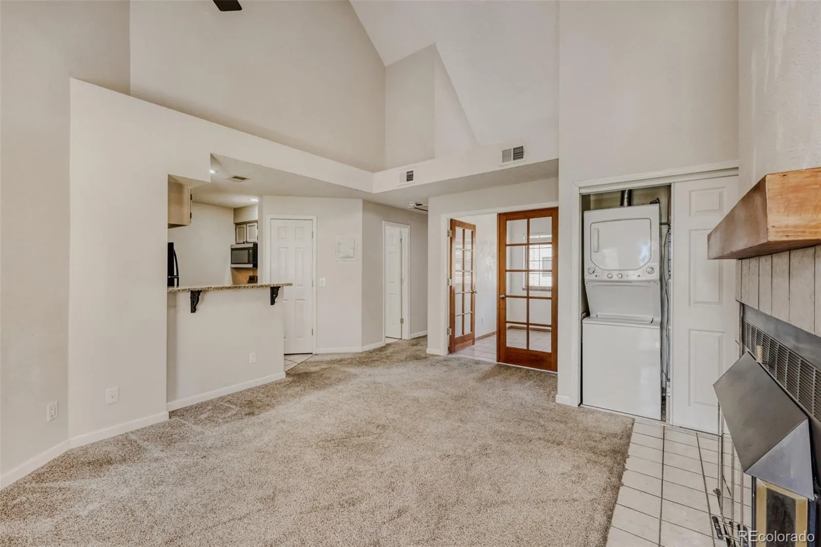 Welcome to this stunning 2-bedroom, 1-bath penthouse condo, where the vaulted clerestory ceilings create an exceptional sense of space, light, and architectural interest. Expansive windows and a skylight fill the main living area with natural light, making this home truly stand out. The spacious family room features a centrally focused, wood-burning fireplace and integrates perfectly into the beautifully updated kitchen, complete with newer granite countertops, a deep sink, microwave, ample cabinetry, and a convenient pantry for added storage. Just off the kitchen, French doors open to a versatile flex space—ideal as a second bedroom, home office, or den—offering flexibility to fit your lifestyle. The generously sized primary bedroom includes custom built-ins that maximize closet storage, while the updated bathroom showcases full tile, a newer vanity, and an elegant glass tile backsplash. Step outside to your private covered porch and enjoy peaceful mornings enjoying a nice cup of coffee, or relaxing evenings in the shade having a cool beverage with a view from above.