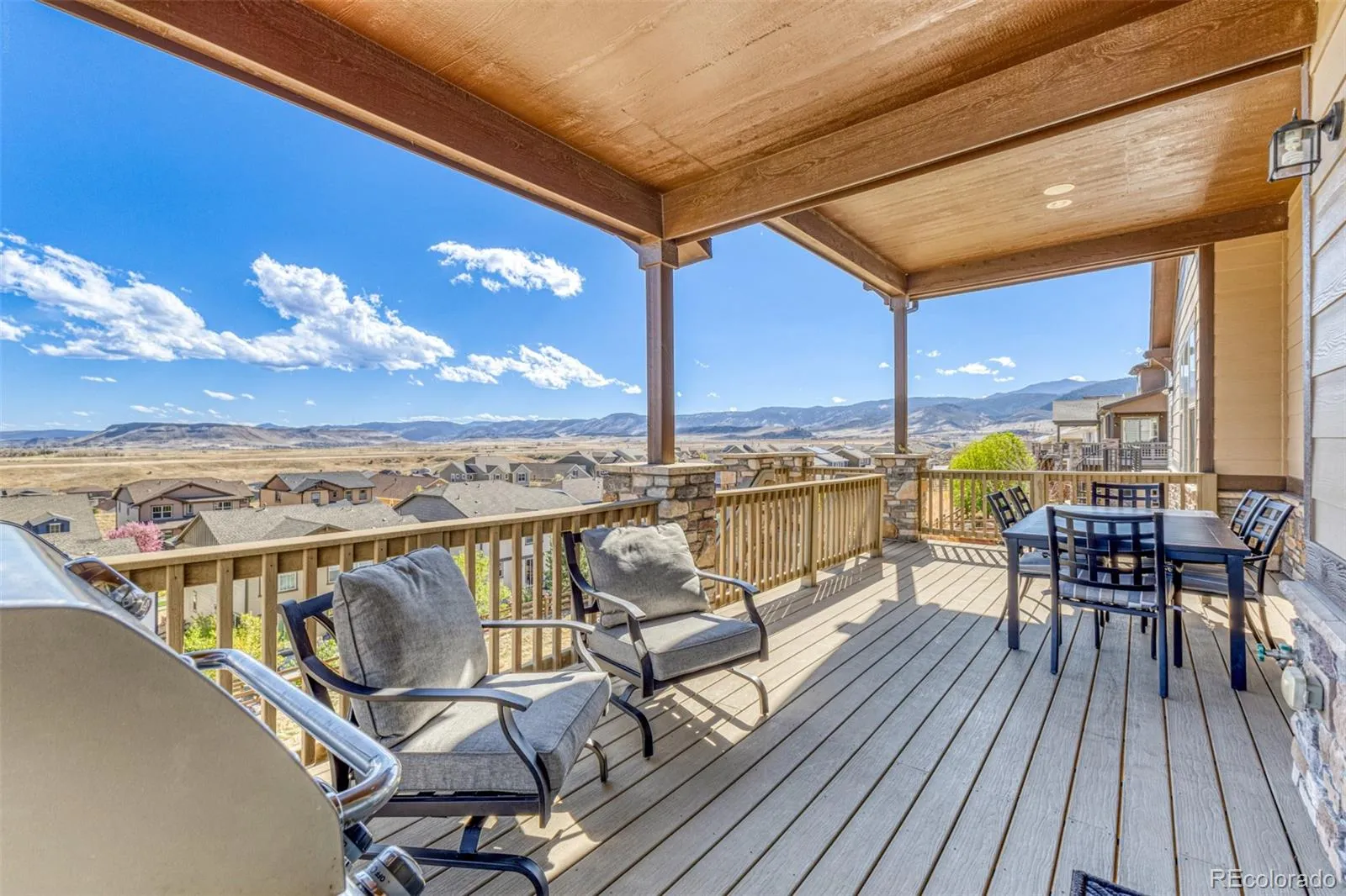 Look no further! This gorgeous 3 bed, 4 bath ranch style home in the popular Leyden Rock community boasts a beautiful facade with stone accents, a welcoming front porch, and oversized 2 car garage. The location provides stunning views sweeping across the front range to the city. Inside you will find an open floor plan with dining and living areas with wood floors and a gas fireplace. High ceilings (11′), solid wooden doors, soothing palette throughout, plantation shutters, and dazzling light fixtures. Double french doors open to an office that can also be used as a den or easily converted to an additional bedroom. The large gourmet kitchen with a spacious island offers ample cabinetry with crown molding, a pantry, granite counters, stainless steel appliances including a gas cooktop and double ovens. The sunny eat-in kitchen overlooking the large covered deck provides amazing views to start your day. Enjoy a good night’s sleep in the primary suite with two walk-in closets and a lavish en-suite with dual vanities, large tub and shower. Downstairs, the large family room is perfect for entertaining with a wet bar, additional cabinets, and walk-out access to the covered patio with a newer hot tub, landscaped yard, and irrigated garden boxes. Off the family room is the third large bedroom and a full bath. The additional unfinished basement area has plentiful storage that can be converted to additional living space. This house has been well maintained with solar panels(owned), a brand new HVAC system, hot water heater, and newer carpeting in the bedrooms and family room. The Leyden Rock community has multiple parks, trails, a community pool and many planned events. This home has it all, act now before it’s gone!