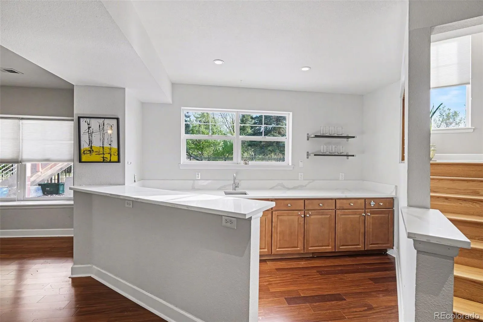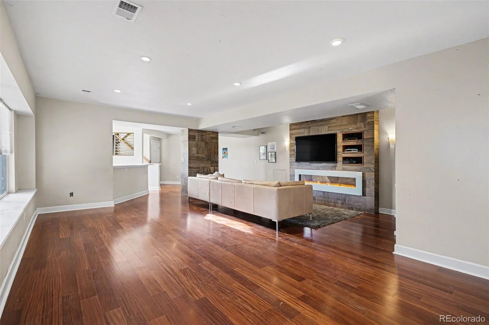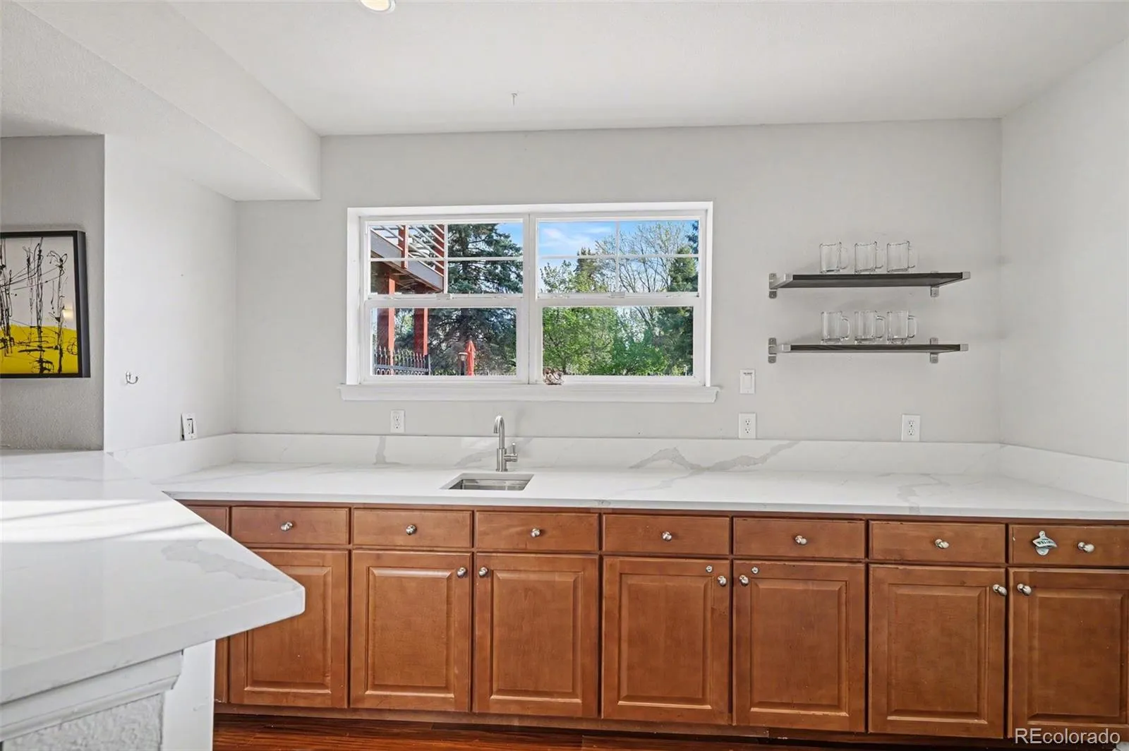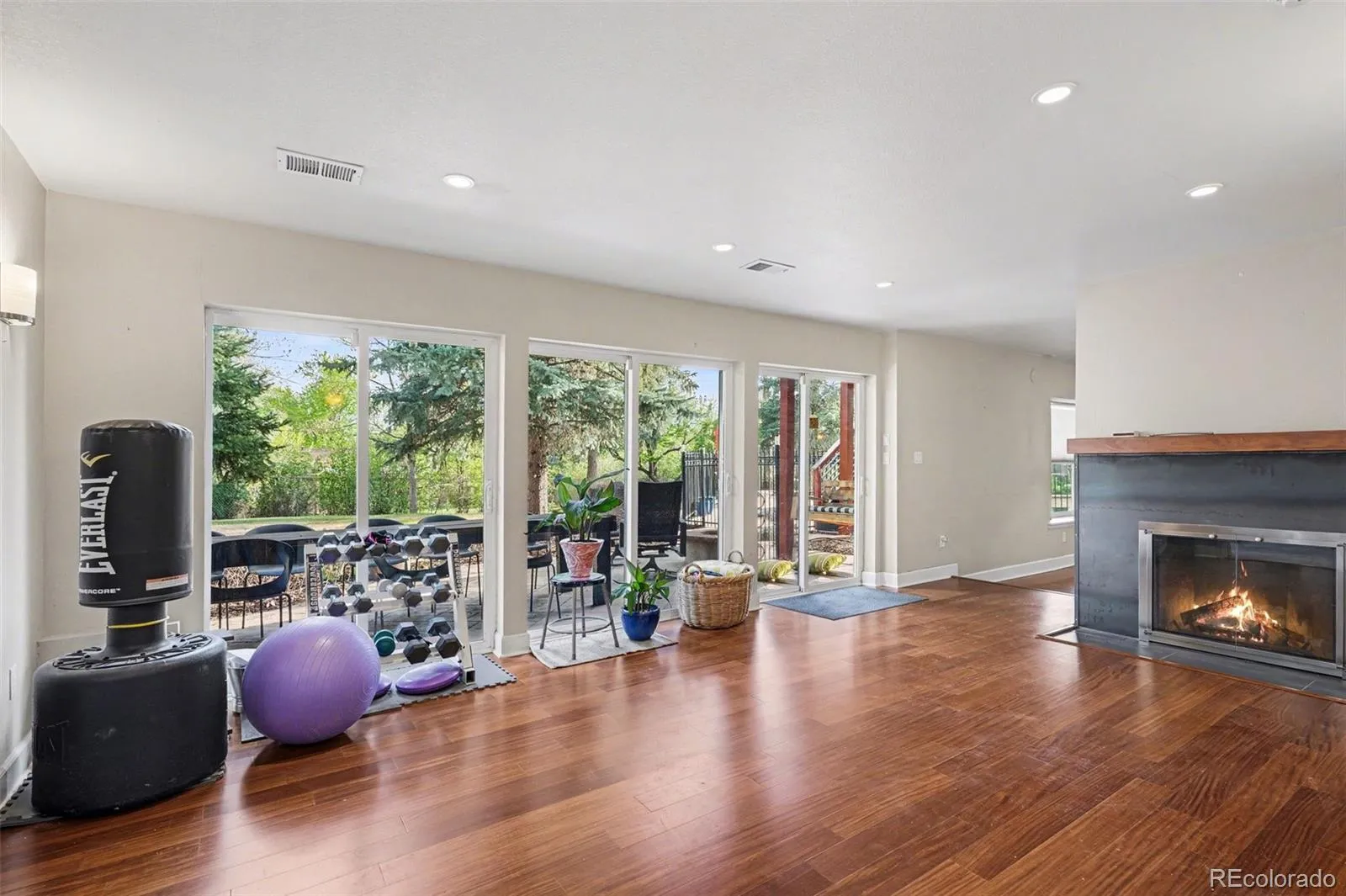 The light-filled walkout basement features a custom wet bar, large rec space, bedroom, full bath, workshop, and multiple access points to the backyard, creating seamless indoor-outdoor living and ideal entertaining space.
