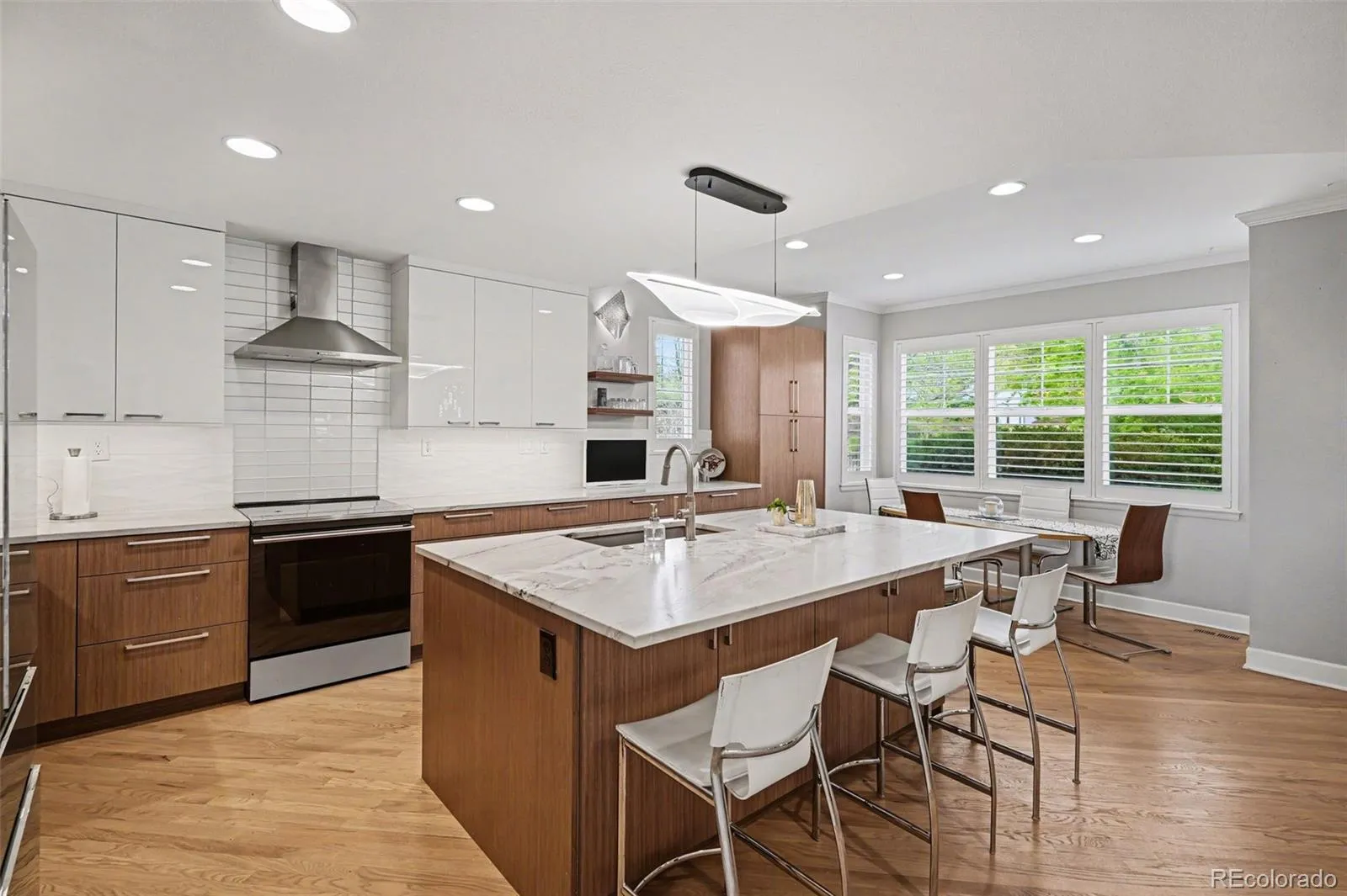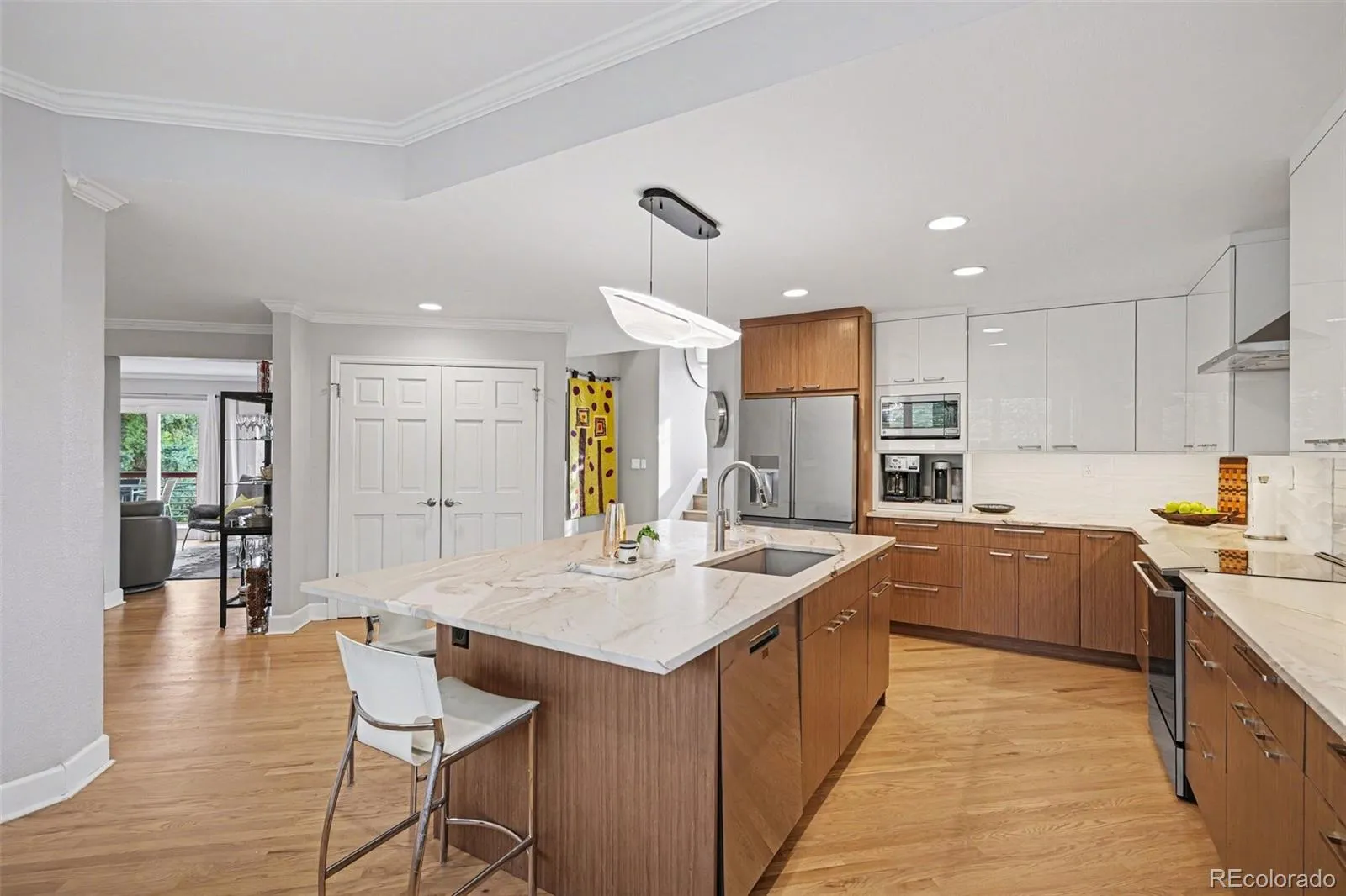 The renovated kitchen showcases quartzite countertops, an oversized island with storage, new appliances, induction cooktop (gas line available), cabinet pullouts, under-cabinet lighting, and two pantries—perfect for everyday living and entertaining.