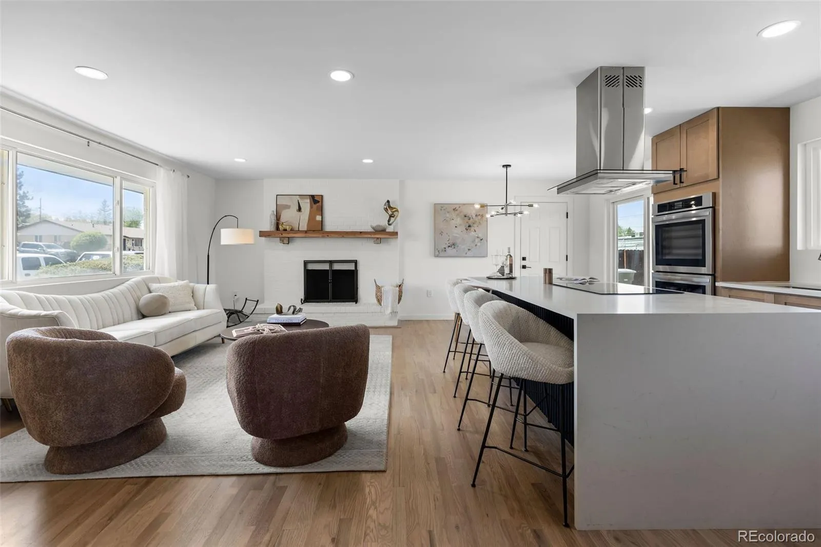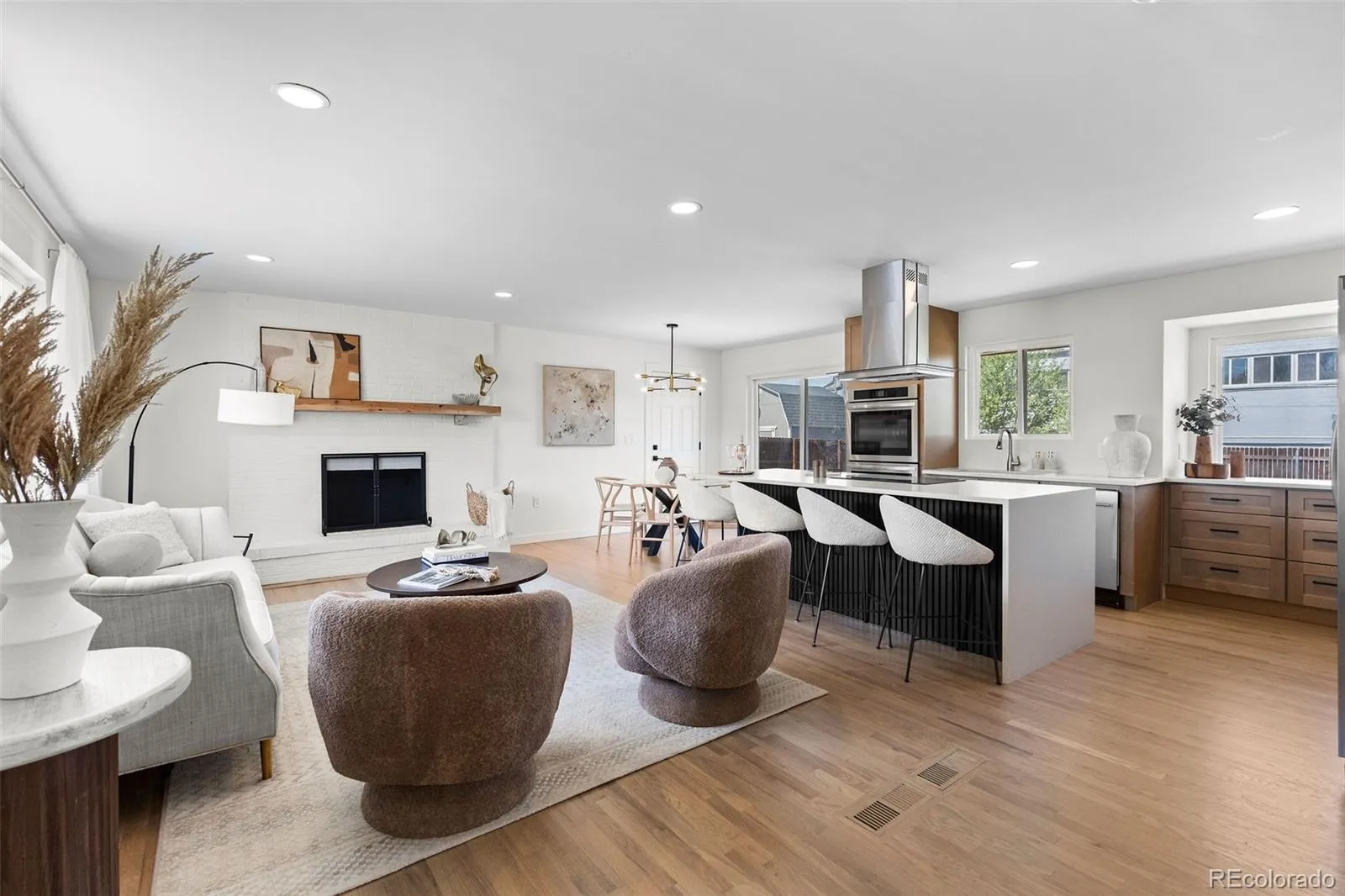 Beautifully updated home in Northglenn featuring an open-concept layout, natural wood flooring, and a cozy fireplace. The remodeled kitchen showcases quartz countertops, a large island, stylish new cabinetry, and brand-new appliances with modern Level 5 finishes.