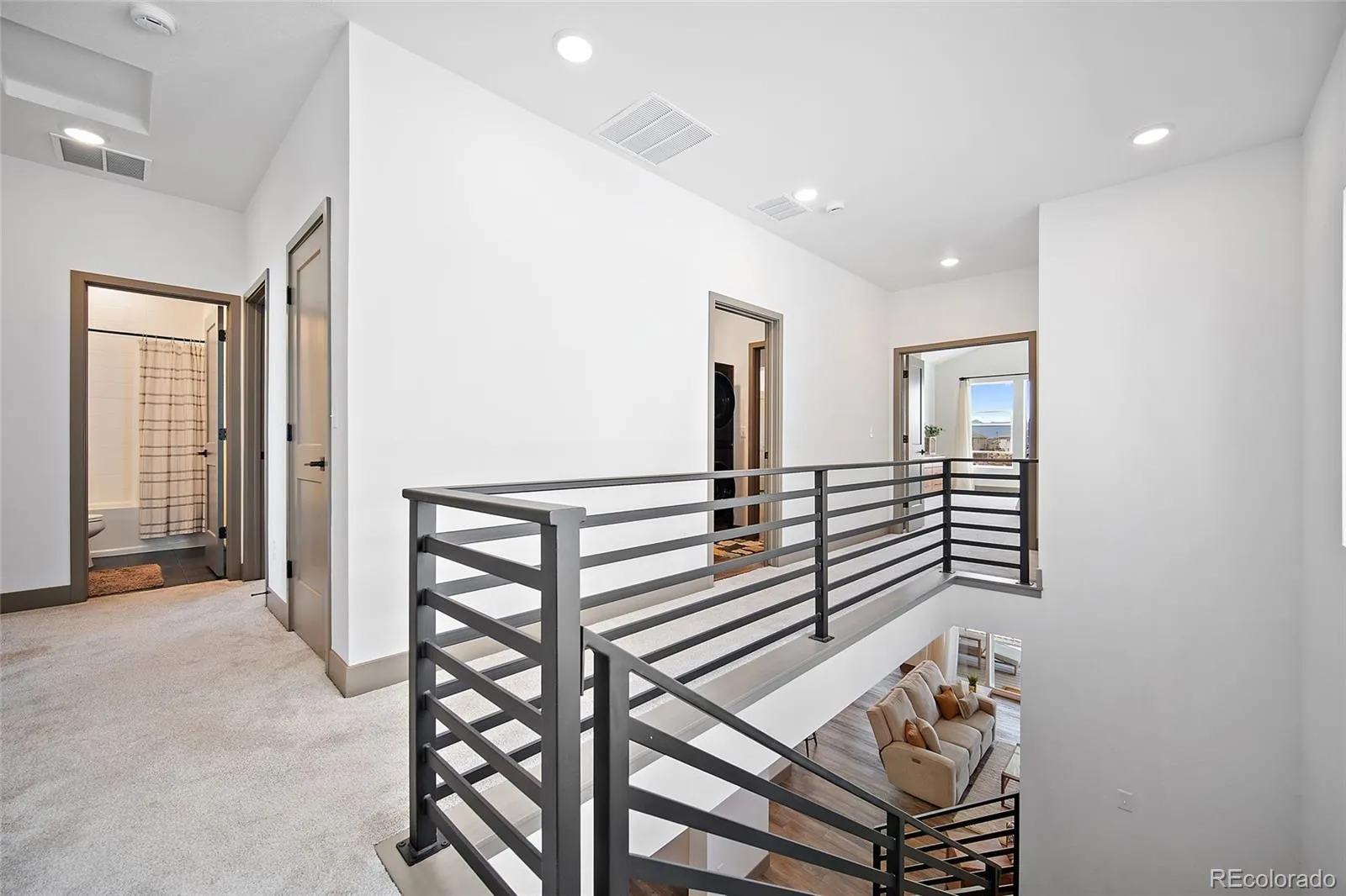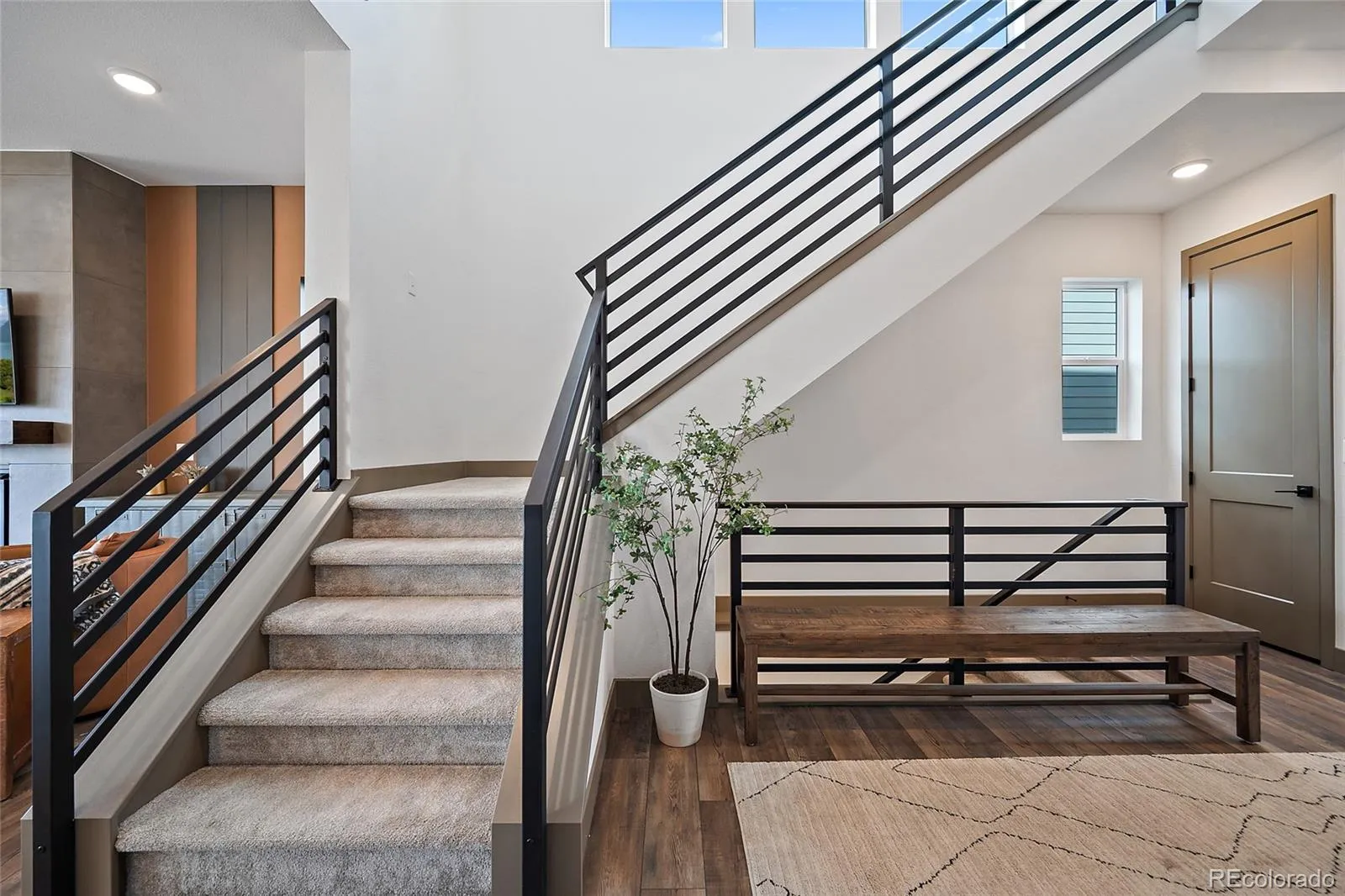 you’ll find tall ceilings, designer finishes, metal horizontal railings, custom accent walls, and a light, open layout that feels