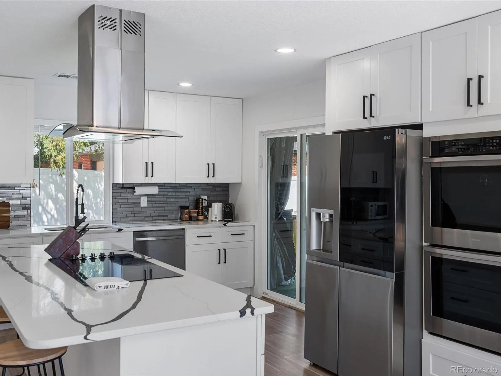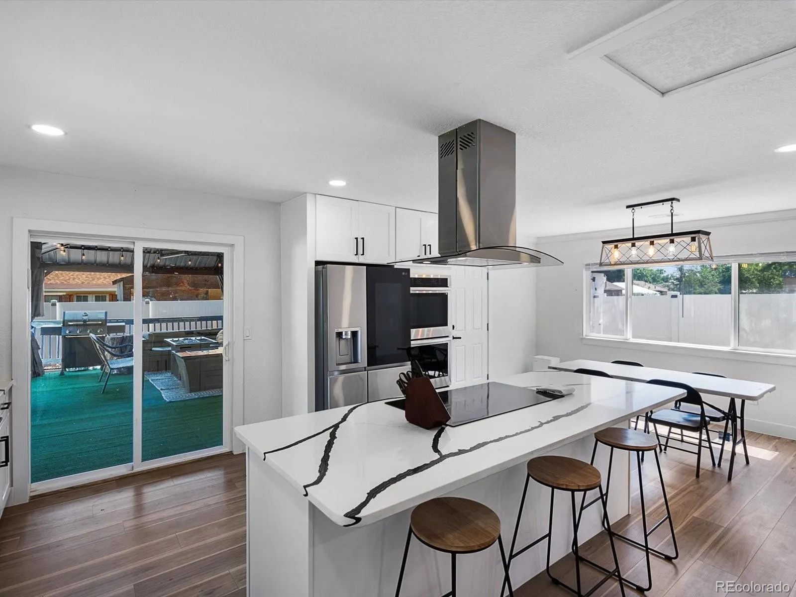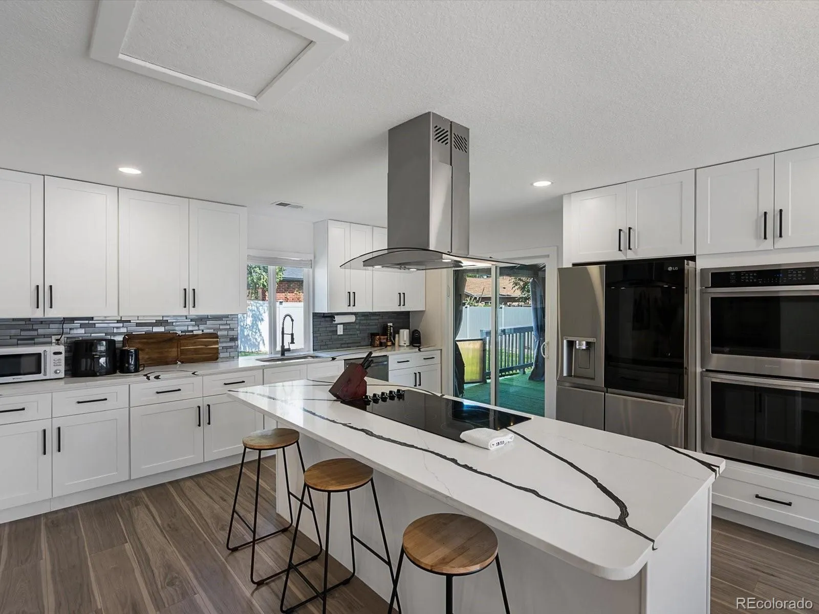 The stunning kitchen is the centerpiece of the home with a large 8-foot island, quartz countertops, soft-close cabinetry, and newer stainless steel appliances including a double wall oven and smart refrigerator. The open concept design flows seamlessly into the living and dining areas, making it perfect for entertaining or everyday living.