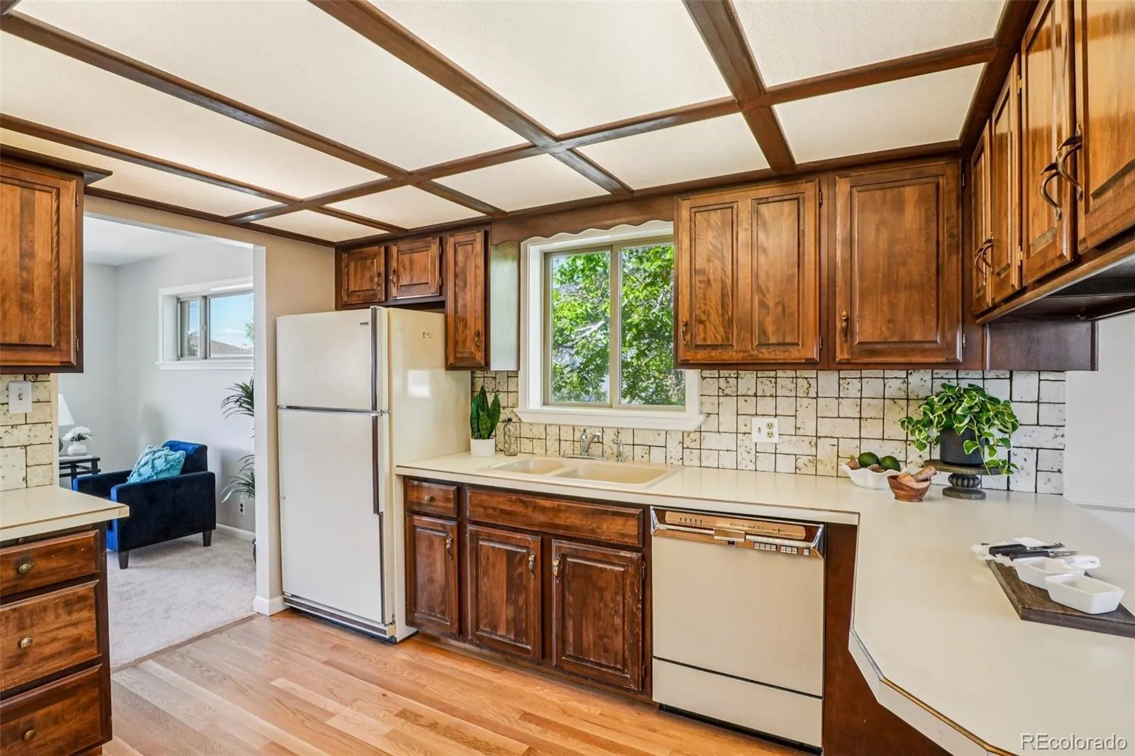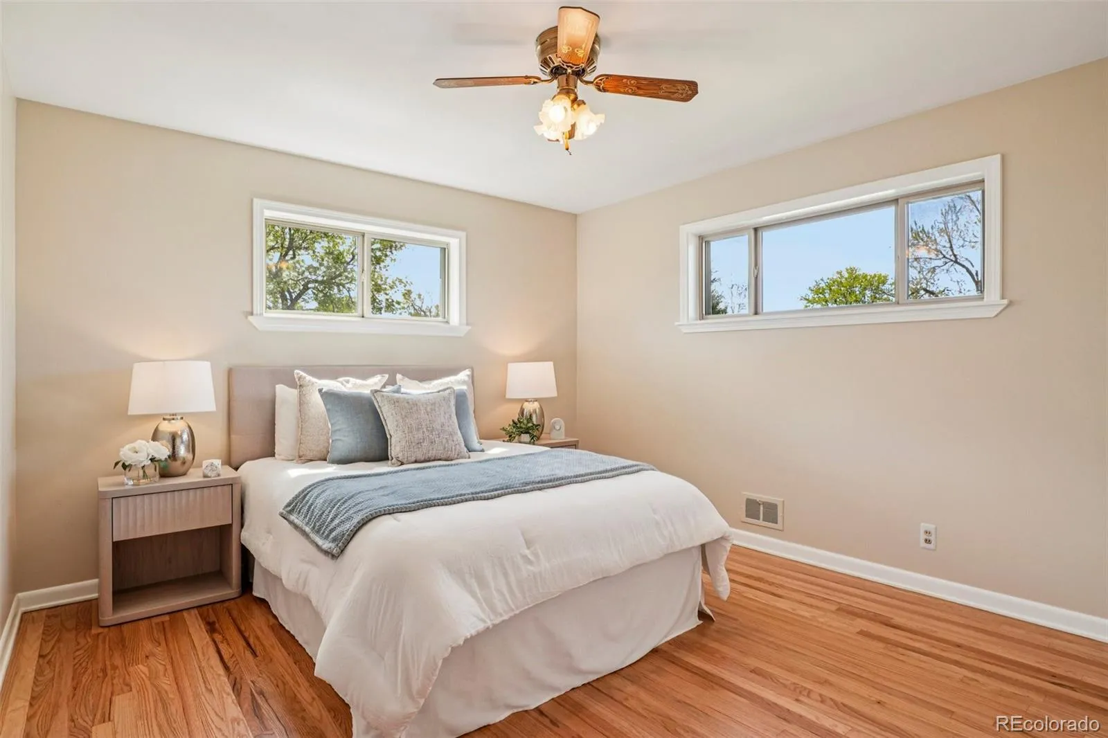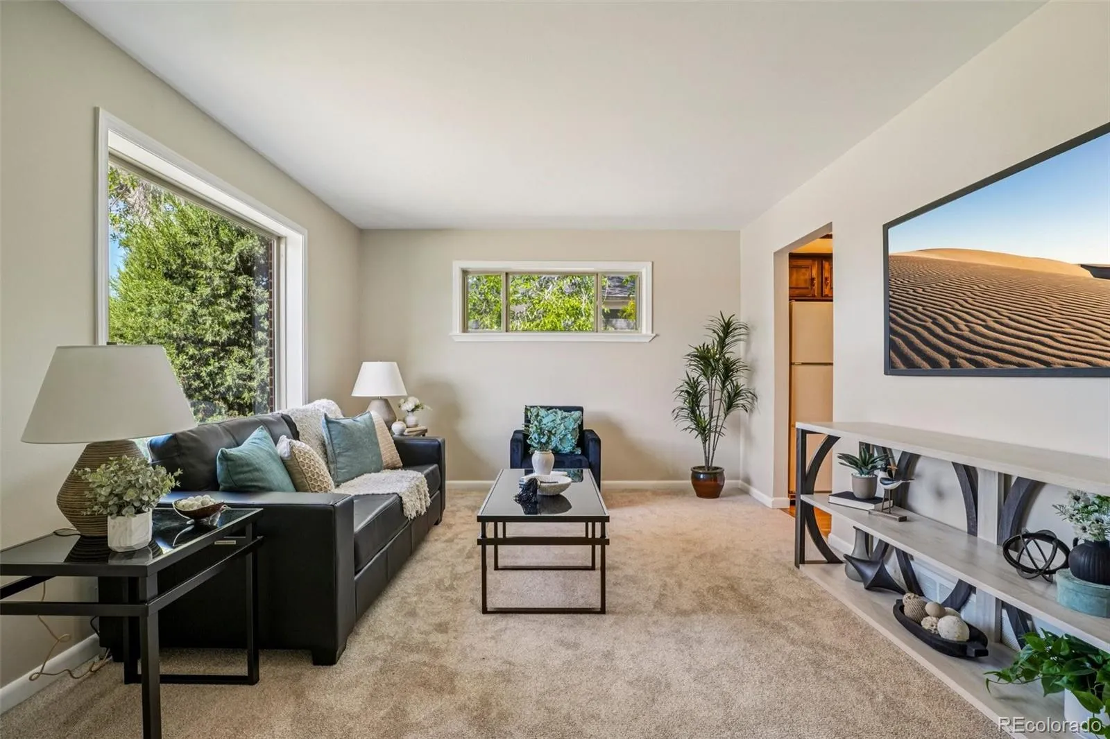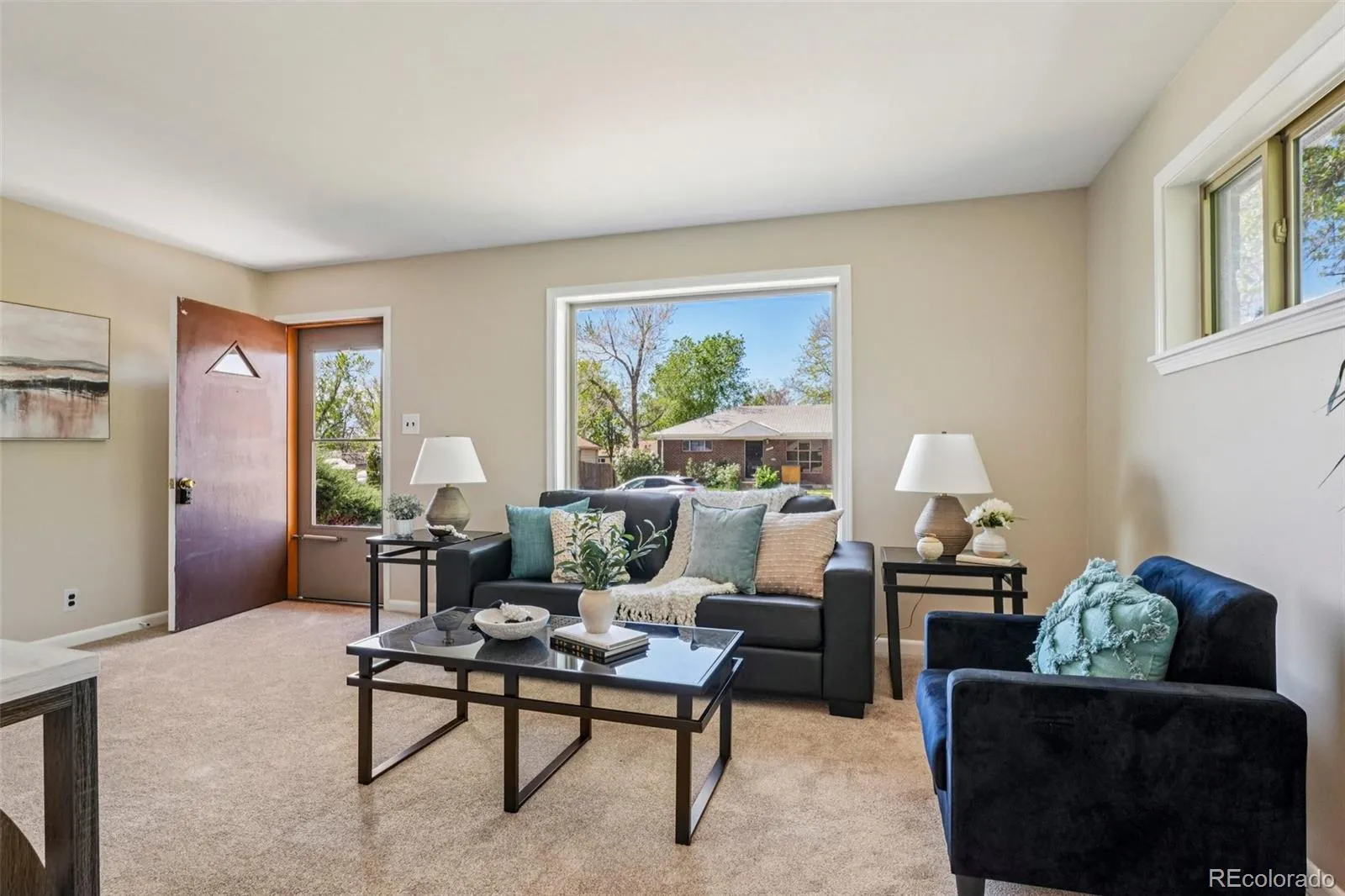 Quaint, charming, and full of character—this classic brick ranch in Northglenn is ready to welcome you home. Offering 4 bedrooms and 2 bathrooms, this well-cared-for property blends timeless features with thoughtful updates. Step inside to a spacious living room filled with natural light from a large south-facing picture window. Fresh interior paint and brand-new carpet create a crisp, inviting feel, while beautifully refinished hardwood floors add warmth and style throughout the main level. The original owner expanded the home to include a dedicated dining room just off the kitchen, providing the perfect space for everyday meals or entertaining. The kitchen offers solid wood cabinetry, laminate countertops, and a tile backsplash, along with a smooth-top range/self-cleaning oven, range hood, and refrigerator—all included. Two main-floor bedrooms showcase stunning refinished hardwoods, and the updated ¾ bath features a low, easy-entry shower for added convenience. Downstairs, the finished basement expands your living space with a large family room, two additional bedrooms, and a second ¾ bath—ideal for guests, hobbies, or a home office. The laundry area includes a washer, dryer, and utility sink, while the unfinished section provides excellent storage with built-in shelving and even a stand-up freezer. Outside, you’ll find an oversized detached two-car brick garage and an extended driveway offering abundant off-street parking. Enjoy Colorado evenings under the spacious covered patio, surrounded by a yard equipped with a new automatic sprinkler system (2024). As a unique bonus, local historians note that the backyard is home to the largest hackberry tree in Northglenn—a special piece of local history right in your own yard. With its solid construction, flexible living space, and inviting charm, this home is one you won’t want to miss.