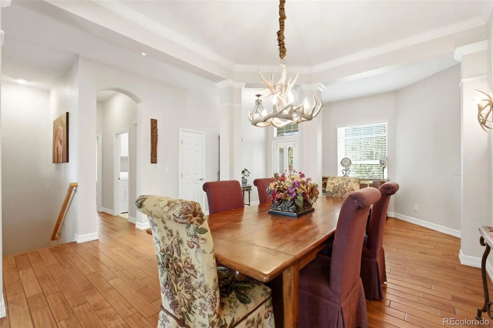 Backing to open space with beautiful mountain views and located on a cul de sac, this home features thoughtful architectural details including crown molding and arched columns, complemented by hand-scraped birch wood floors, granite surfaces, and plantation shutters throughout.