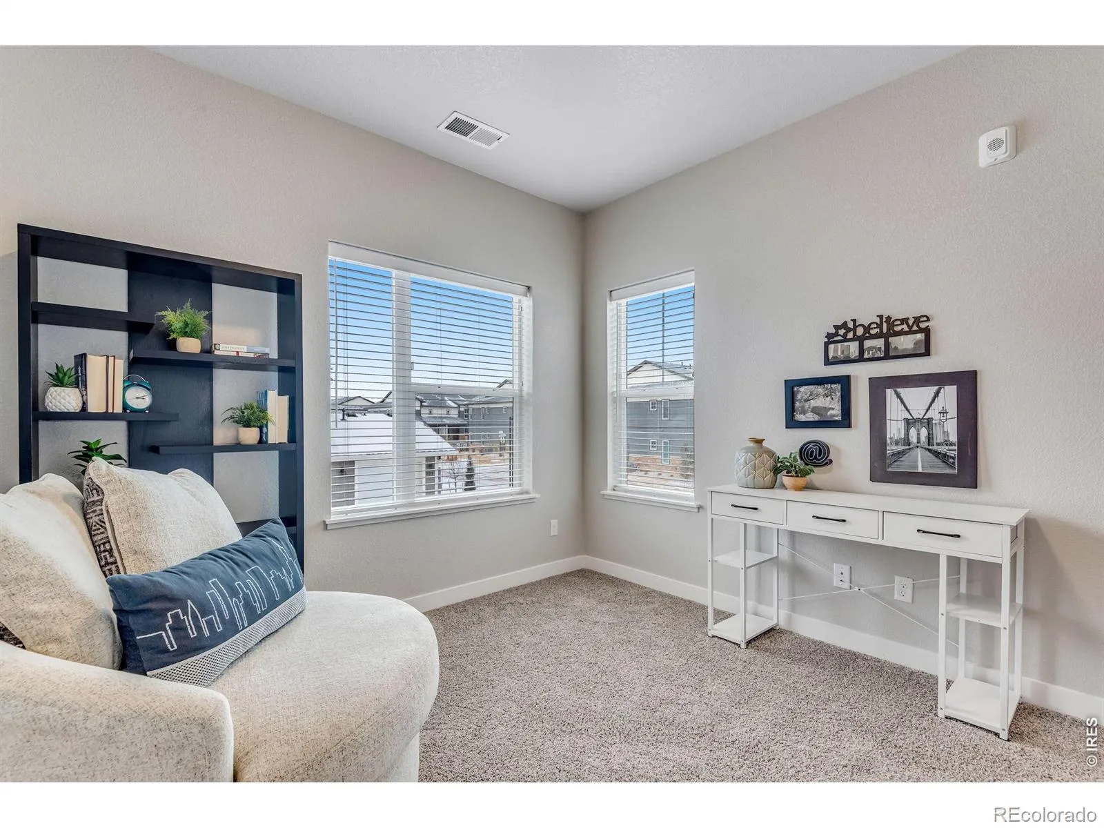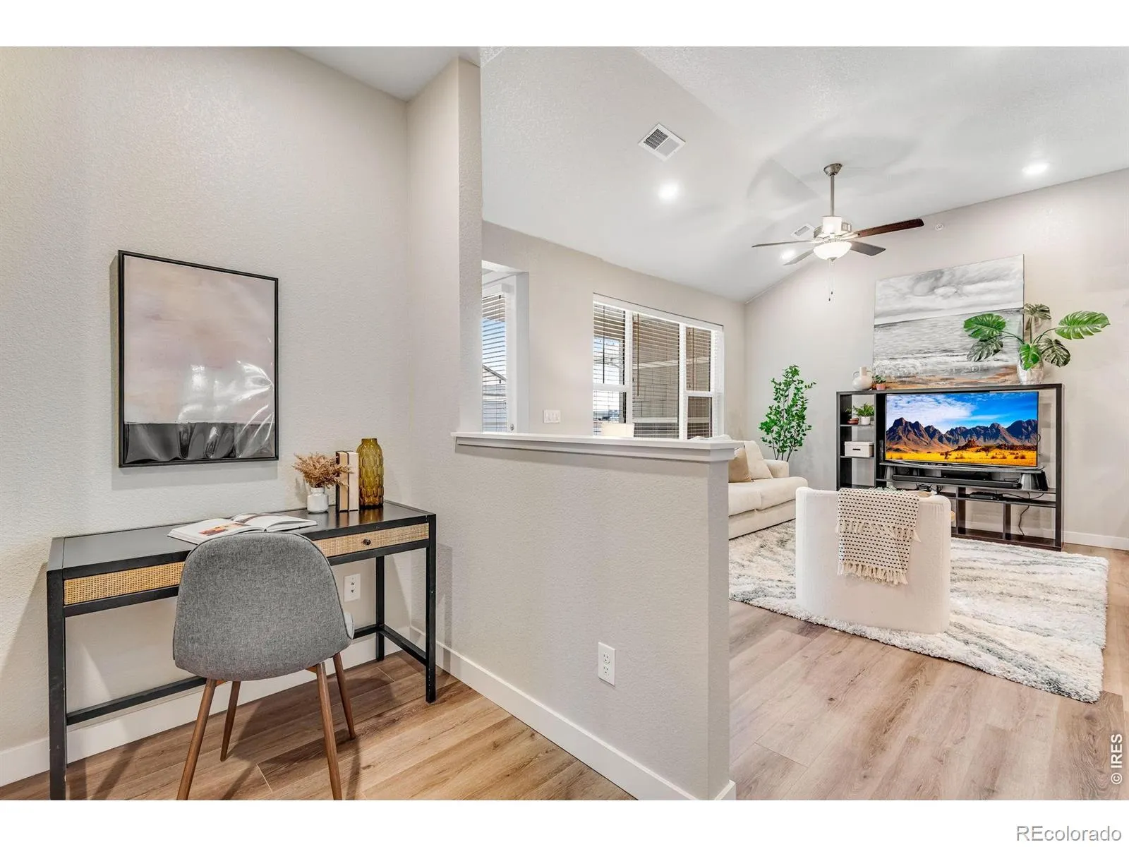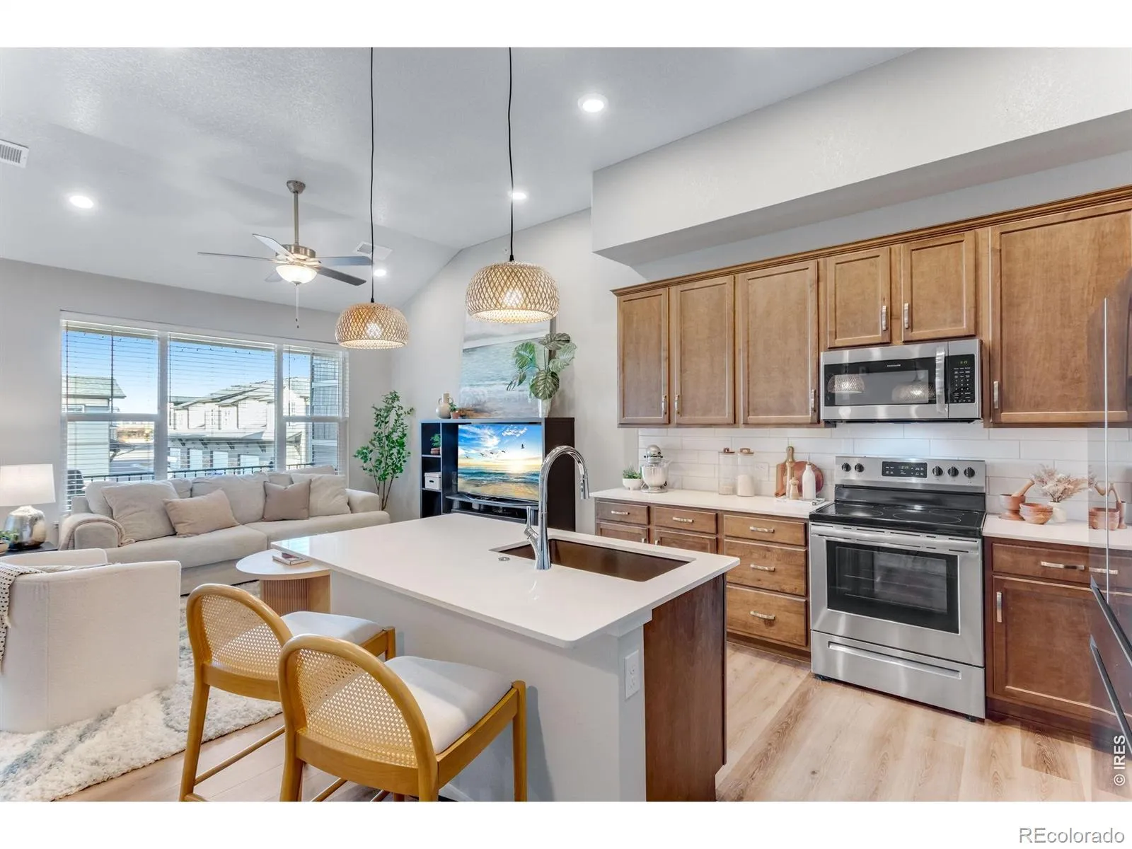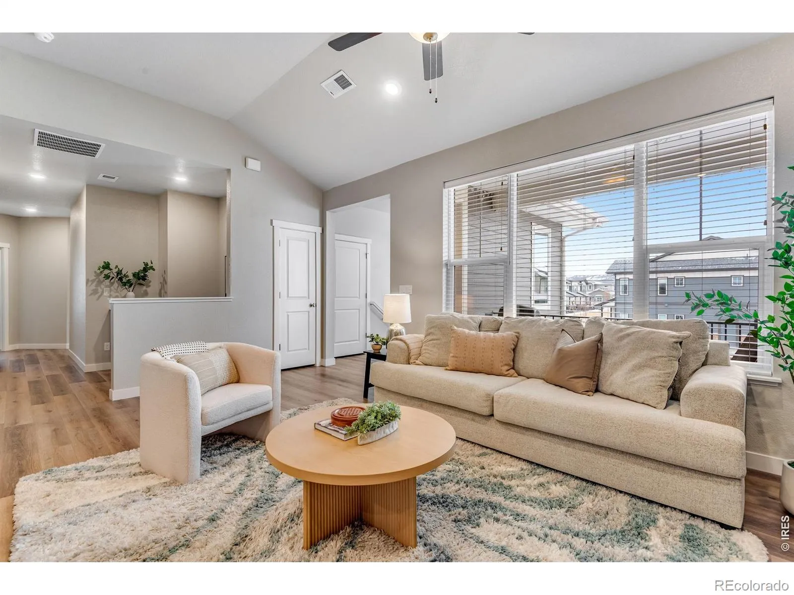 Move-in Ready + loaded with upgrades! An exceptionally sunny corner end-residence, townhome-style condo in the coveted Lakes at Centerra, ideally positioned moments from I-25 and Highway 34 with effortless access to Centerra’s premier amenities! Adorable Raised Ranch lightly lived-in & inviting open-concept layout. 1,653 finished SQFT with 1,535 SQFT on one level living, thoughtfully designed with 3 Bedrooms + versatile Office Nook area, 2 Bathrooms balancing comfort, function and style. The west-facing oversized single-car garage is fully insulated and sheet-rocked with an insulated door panel, perfect for Colorado seasons-while acres of HOA-protected open space to the south create a peaceful backdrop with immediate trail access. Inside – abundant storage off foyer and adjacent to the stairwell. The generous Primary suite serves as a private retreat with a walk-in closet & separate dual vanities in a spa-inspired primary bath with cool down seat in the shower. An expansive living room, covered front porch, and comfortable balcony enhance indoor-outdoor livability. Featuring a high efficiency furnace, tankless water heater & gorgeous designer finishes: quartz counters, full kitchen subway tile splash, maple cabinetry, stainless steel appliances and stainless appliances. Just down the street from the new park & Explorer’s Club, miles of stunning trail access and along with access to Houts Reservoir & Equalizer Lake, close to the clubhouse, pool & community garden, play area, and High plains environment center. Minutes from all the Centerra shops/restaurants & Medical Center of the Rockies & the new Avenue South Centerra development/south side of 34 (HOA includes internet too/Pulse High Speed Fiber.) Easy guest parking to the north.