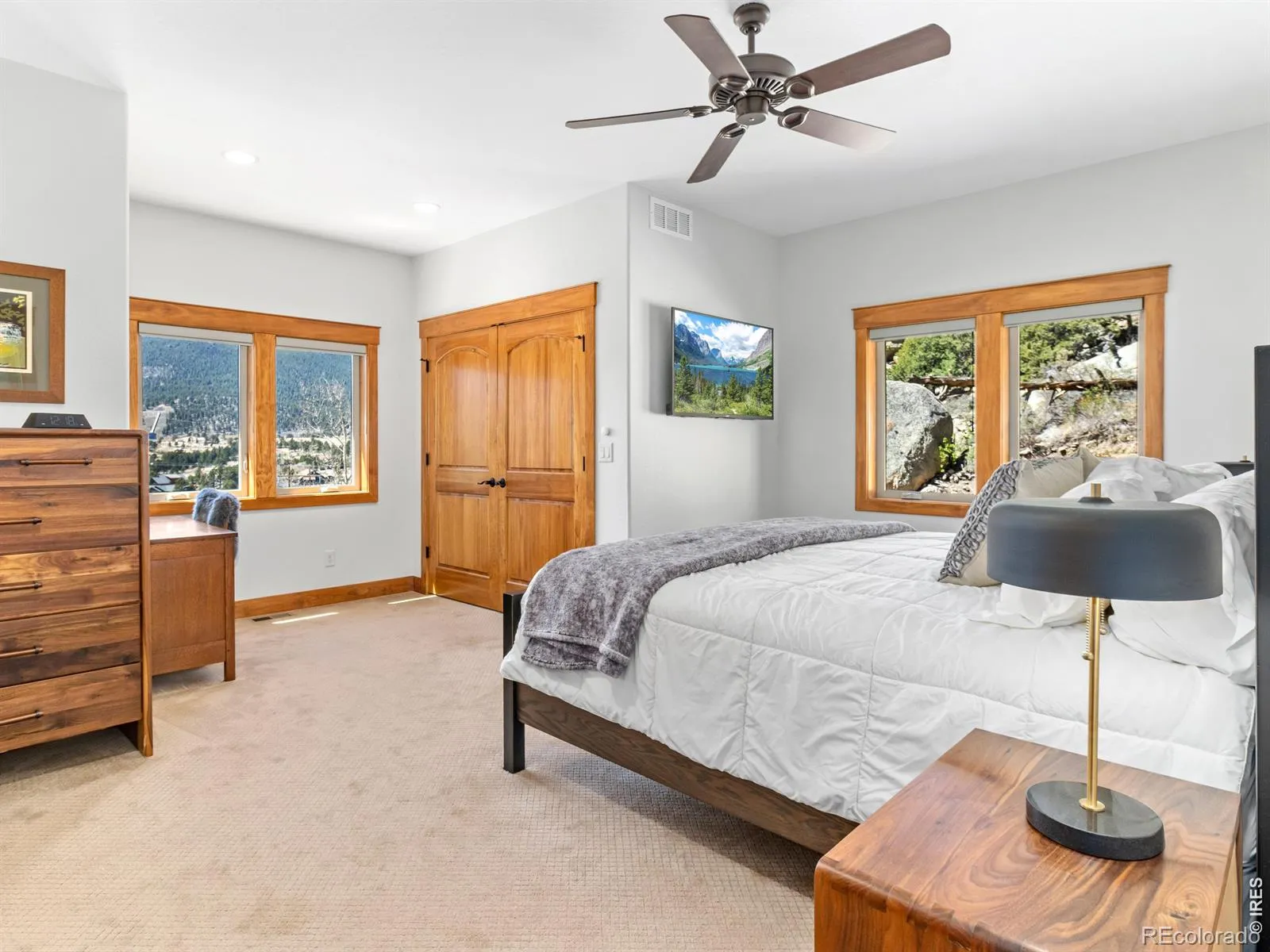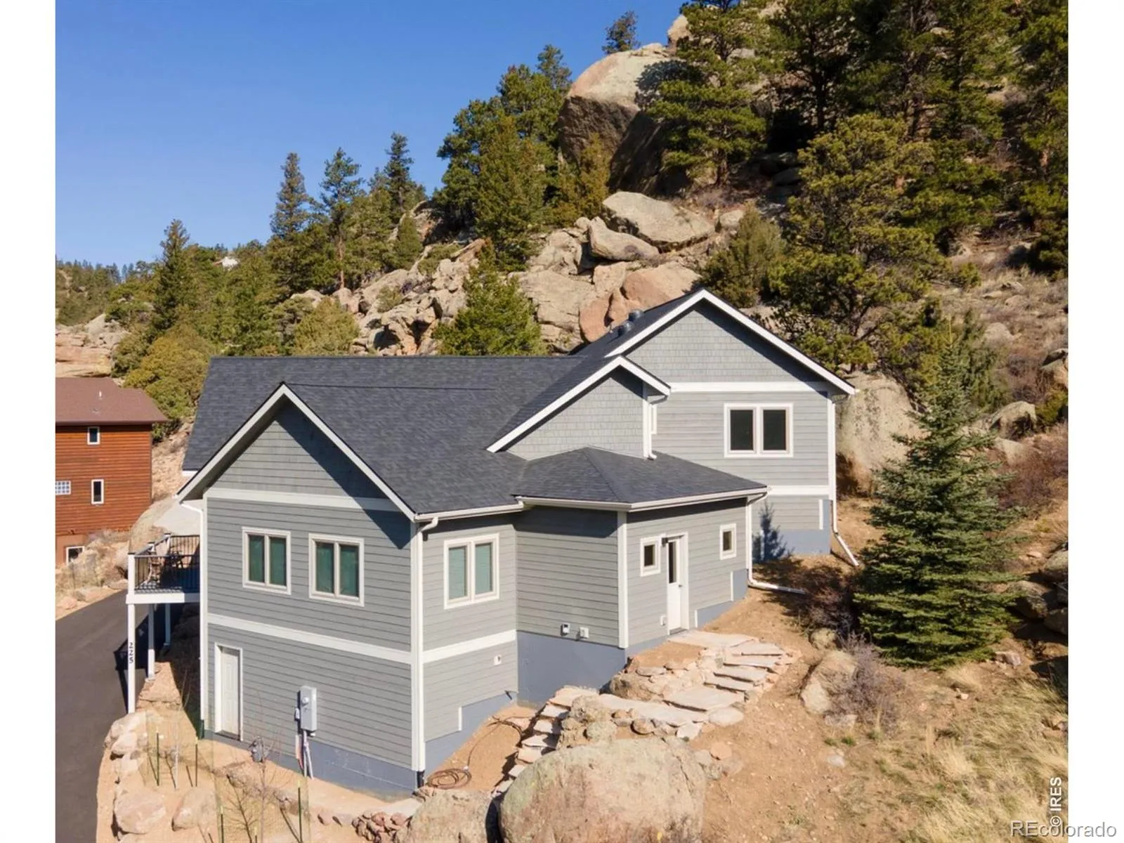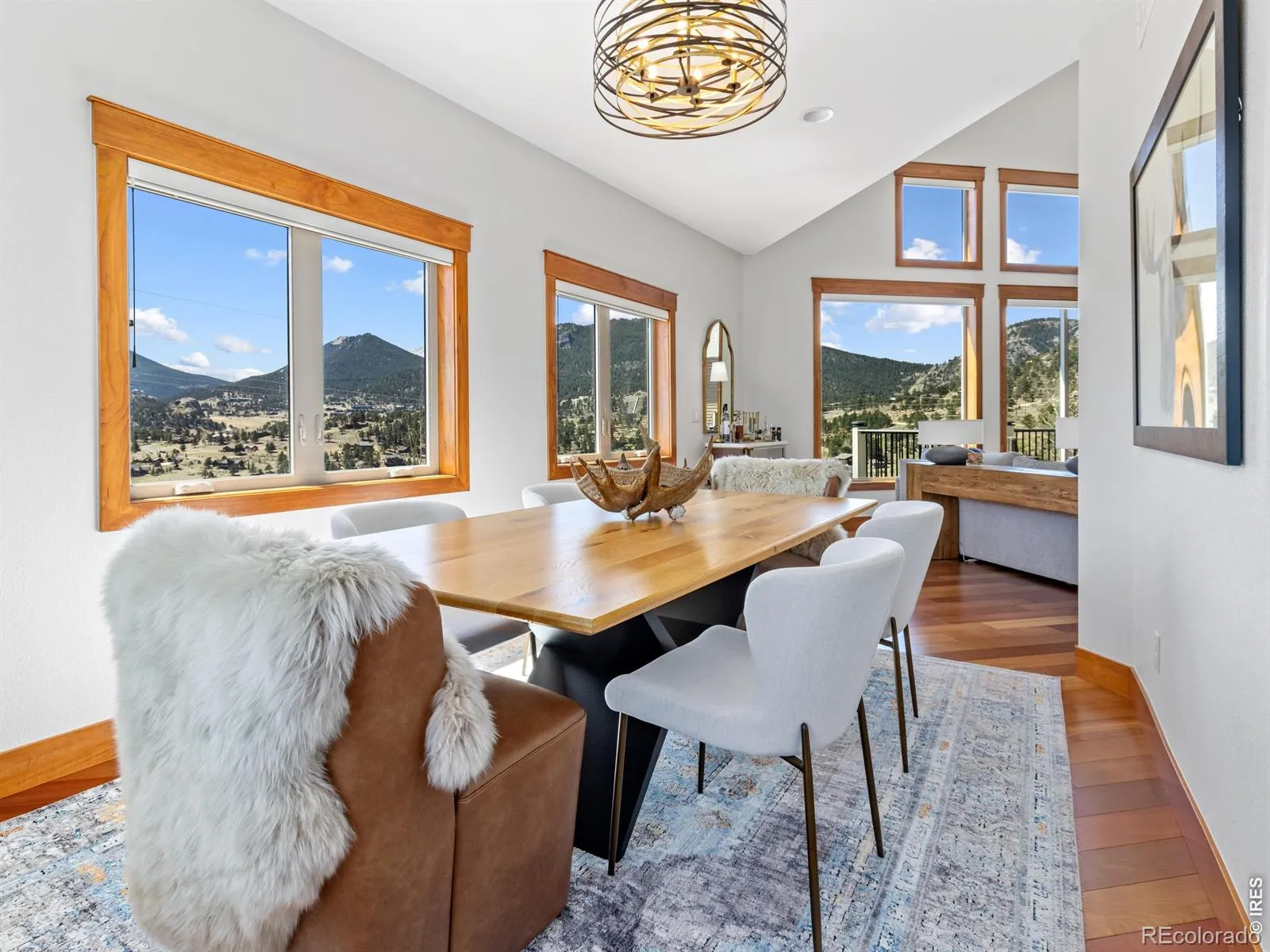 Enfolded in a hillside of big boulders & backing up to The Thumb Open Space, the stunning mountain home @ 225 Curry Dr is a true gem. Cross-Valley Views from Kruger Rock to Giant Track Mtn, w/ Twin Sisters the focal point & Twin Peaks – Longs & Meeker – crowning the scene, provide an ever-changing procession of light & shadows through the day. Located on the south slope of Prospect Mtn in the Prospect Highlands neighborhood, this beautiful, like-brand-new Estes Park home features luxurious, high-end finishes & a long list of new upgrades. Natural light floods into this beautifully crafted home, & there’s truly breath-taking views from every window. Inside, the home feels both refined & comfortable, w/ a clean, modern aesthetic, open-concept living, & nice big kitchen w/ island & pantry. The main level primary suite is positioned for privacy & convenience, & there is an office, mudroom/laundry room and exercise area rounding out the downstairs. Upstairs are add’l BRs & flexible living space. Quality finishes & smart design choices are evident throughout, from the sunshine pouring in the wall of south-facing windows – keeping the home bright-lit all day and warm w/ solar gain in the winter, perfect for relaxation & rejuvenation – to the efficient layout, to the generous storage. Recent upgrades include Central A/C, Hunter Douglas Blinds, Deck Awning. Hiking Trails are nearby & you can walk out the door & loop through the Thumb Open Space for a fantastic workout and amazing views. Homer Rouse Trail & Lily Mountain are a short drive to additional dog-friendly trails and there’s quick & easy access to downtown Estes & Rocky Mountain National Park. Outside the house, you’re immersed in classic Estes Park terrain – big rock outcroppings, mature evergreens, and open skies – yet still within city limits with paved access & utilities. Whether you’re looking for a full-time residence or a mountain getaway, this home delivers with newer construction, & truly exceptional views.
