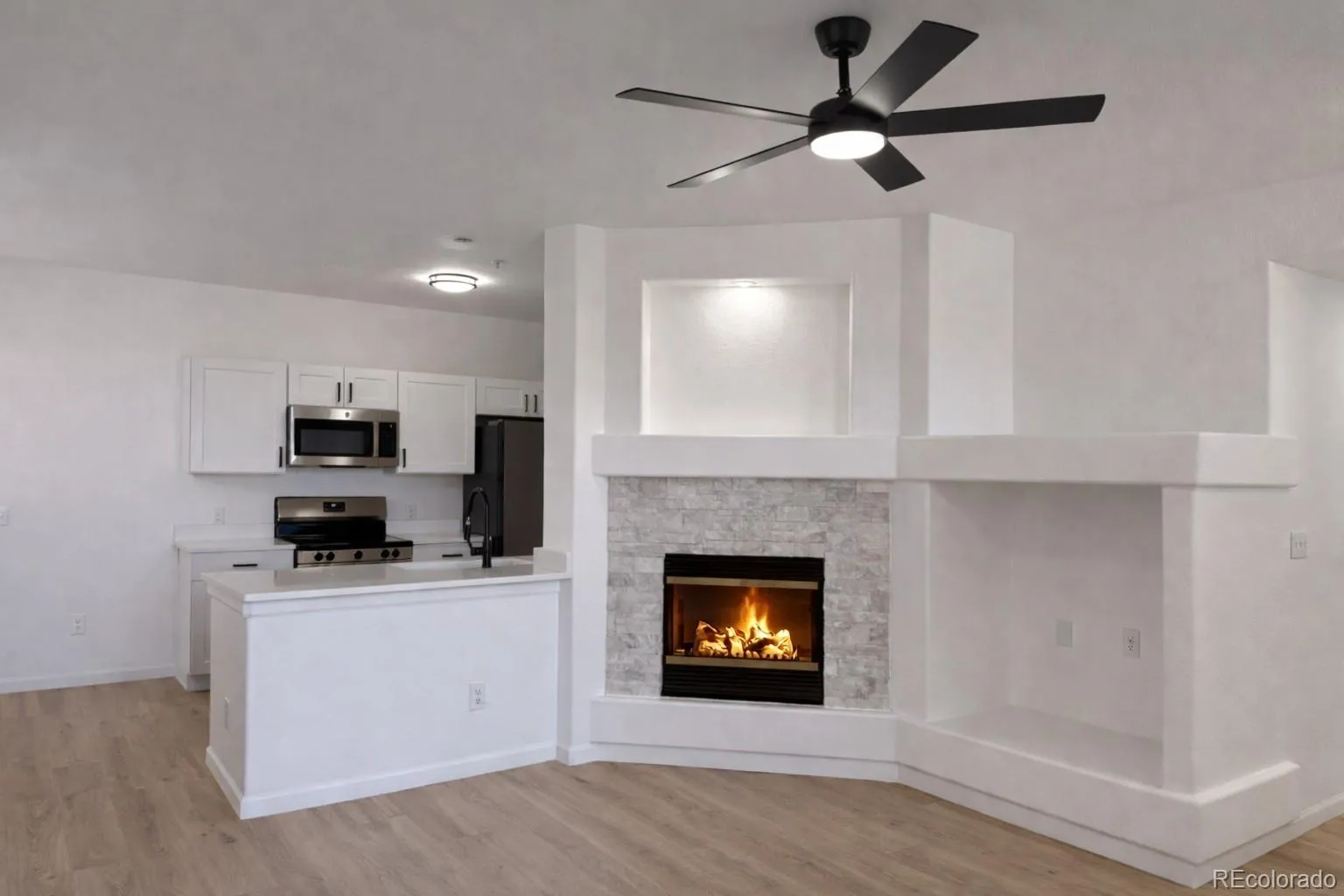 Featuring a modern contemporary style, this home offers a bright and inviting living room with a cozy electric fireplace and direct access to a charming front porch—ideal for relaxing mornings or quiet evenings. The kitchen is designed for both function and entertaining, complete with a breakfast bar, pantry, dining room storage closet, new cabinets, quartz countertops, a white kitchen sink, and stainless steel appliances, some of which are new. The entire home features newly remodeled laminate flooring, and all lighting fixtures have been updated.