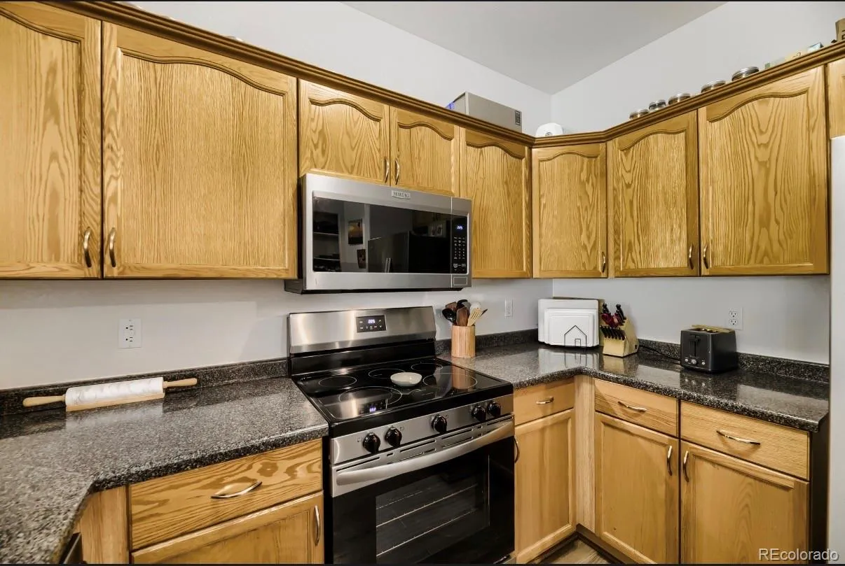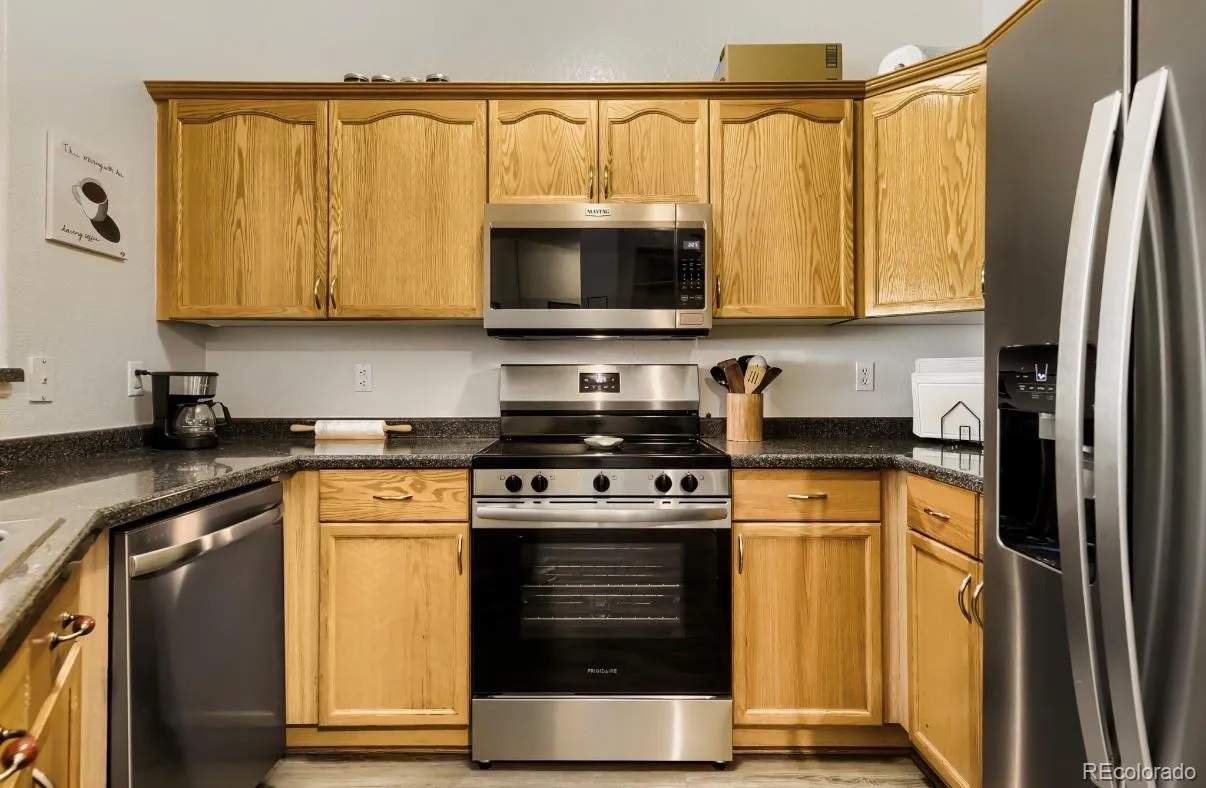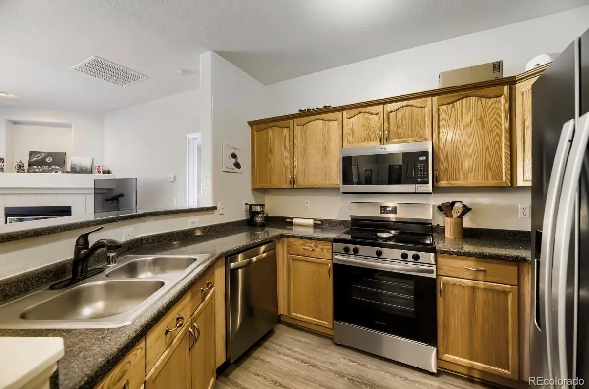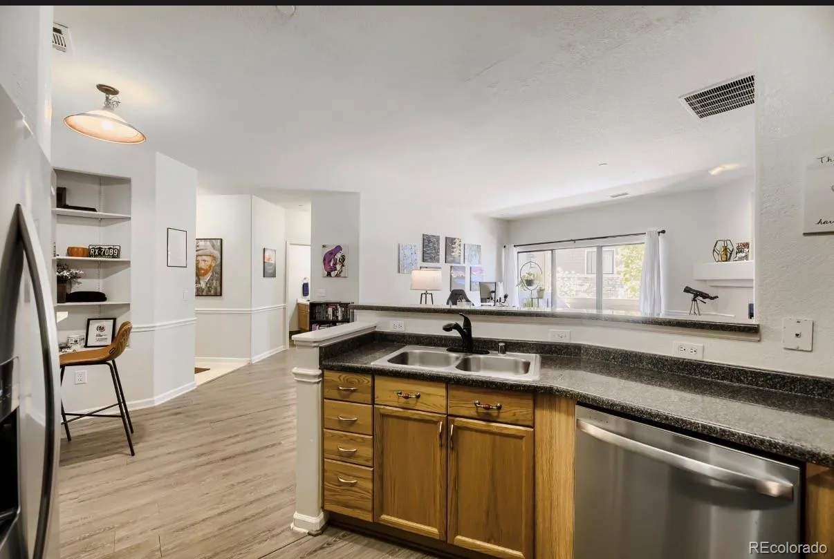 Wonderfully located next to the foothills of Kan Caryl. Location, location, location. Kitchen boasts new stainless appliances and large bar seating. This 2 bedroom with an ensuite bathroom has double sinks in master bath. Another bathroom in hallway which is a 3/4 bath for guests.. These units rarely become available. This unit faces the mountains with beautiful views off the deck unless the trees have filled in, and includes a spacious garage. The property has an open floor plan, gorgeous laminate floors and has a large fireplace. Central location to shopping, schools, parks and trails. Please check out the Ken Caryl master association for all amenities such as pools and Frisby golf. https://ken-carylranch.org/