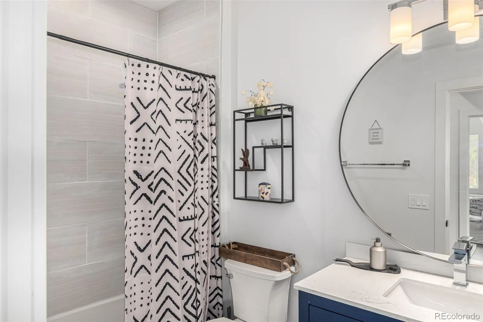 The main level features an open-concept layout with a sunlit living room anchored by a cozy gas fireplace, a dining area that opens to a covered balcony with panoramic views, a stylish sitting area, and a beautifully designed kitchen with quartz countertops and stainless steel appliances. A full bathroom and dedicated office complete the main floor.