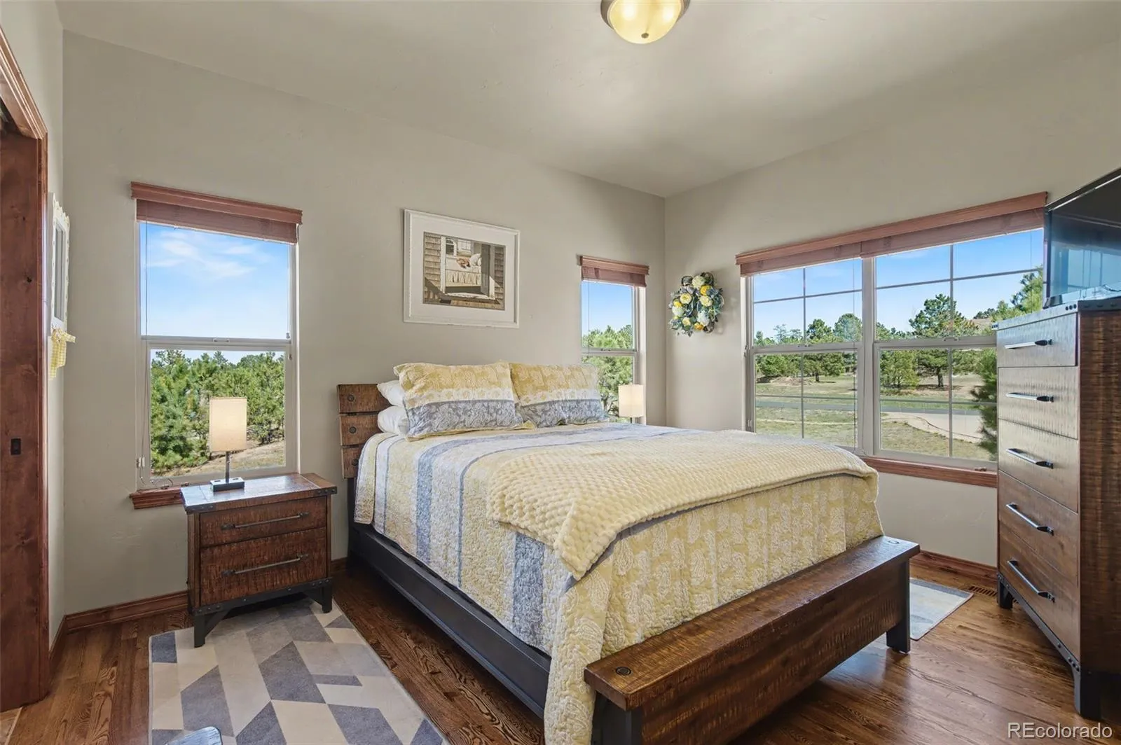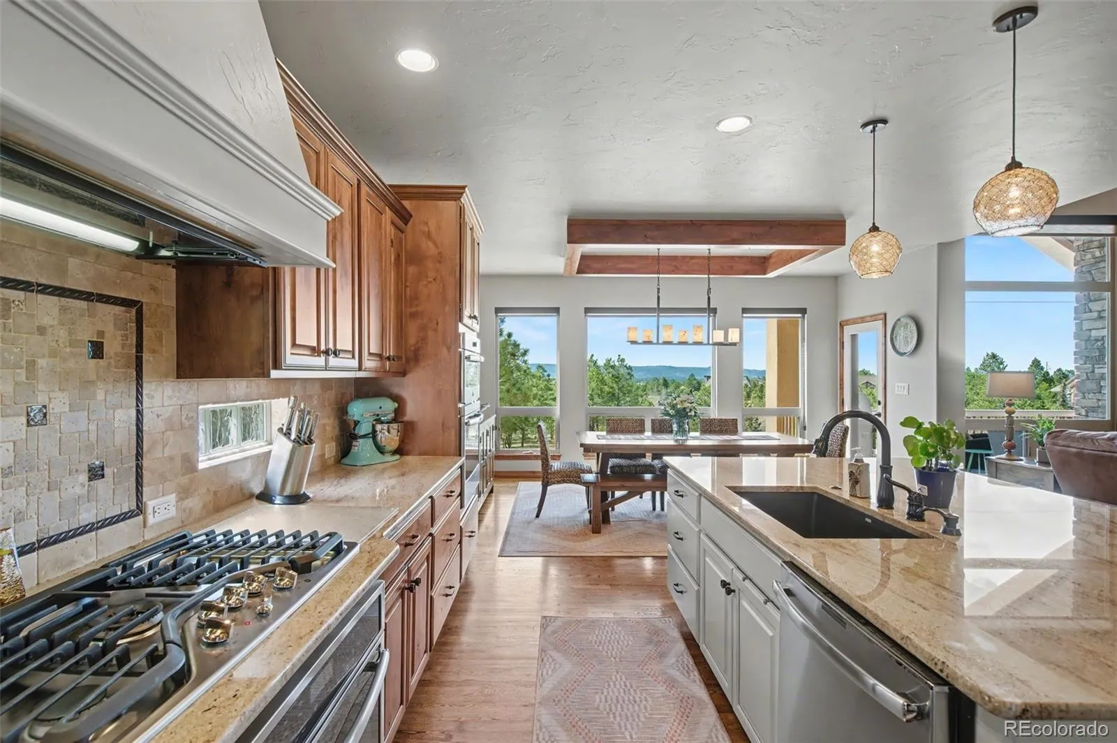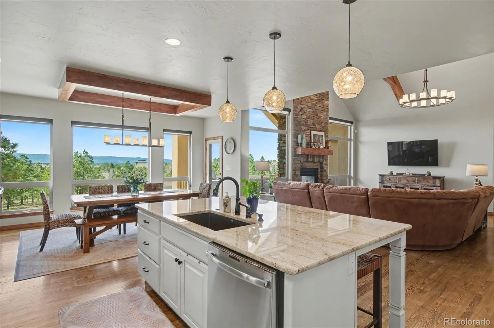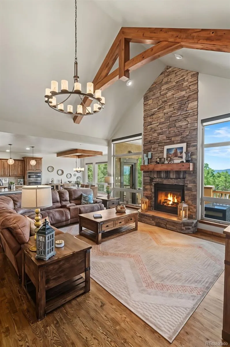 Nestled in sought-after High Forest Ranch, this luxurious ranch-style home offers breathtaking mountain views from every level, gorgeous upgrades, and wonderful amenities. Step inside and beautiful hardwood floors beckon you into the great room, featuring a vaulted, beamed ceiling, and stone indoor/outdoor fireplace. The great room seamlessly connects to the gourmet kitchen, dining area, and a walk-out to the deck- perfect for dining al fresco. Channel your inner chef with an oversized island, granite countertops, walk-in pantry, and stainless-steel appliances including a double oven and gas range with beautiful range hood. Retreat to the spacious primary suite featuring gorgeous mountain views, walk-out to the deck, and ensuite 5-piece bath with walk-in closet. The convenient laundry room and mudroom is off of the attached 3-car garage, which offers ample storage and convenience. Pass through the laundry room to access the casita, featuring a private entrance, bedroom, bathroom, well-appointed kitchen, dining area, living room, enclosed deck, and attached 2-car garage. Back in the main house, another bedroom with ensuite bath, office, and powder room round out the main level. Downstairs features an expansive family room with wet bar, cozy fireplace, and walk-out to the covered patio with hot tub, perfect for relaxing at the end of the day. Two additional bedrooms with walk-in closets, full bathroom, and a large storage space provide endless opportunities for guests, home gym, work space, craft space, and more. This impeccably cared-for home boasts central vacuum and smart home thermostat. With acreage for gardening, lawn games, and more, this backyard is a host’s dream. This picturesque, gated neighborhood offers countless amenities including parks, trails, tennis courts, and a club house with community gatherings, designed to foster lasting friendships. Enjoy luxury Colorado living at its finest- Schedule a showing to see this magnificently upgraded home today!