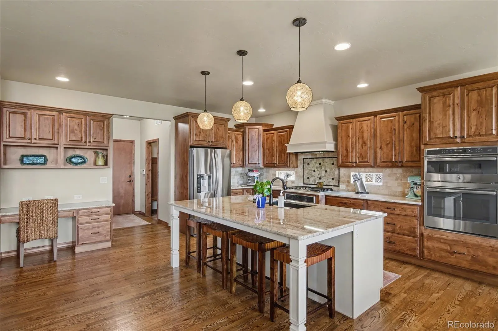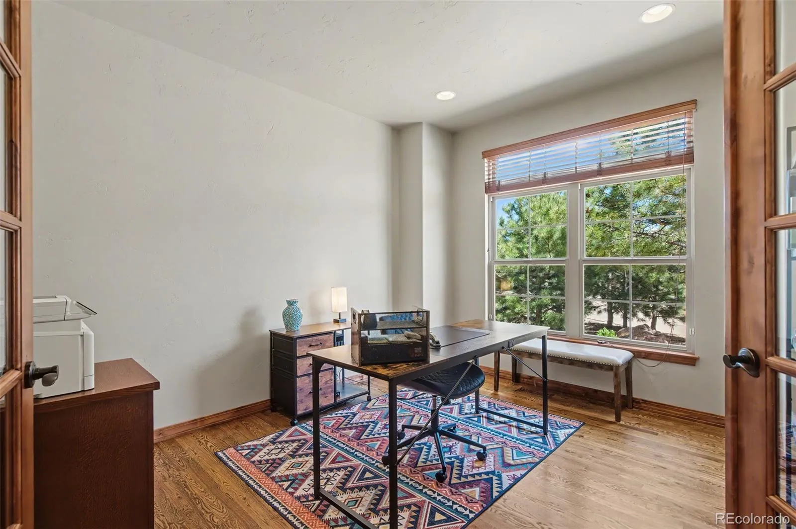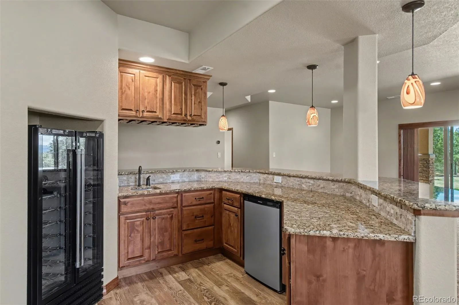 Nestled in sought-after High Forest Ranch, this luxurious ranch-style home offers breathtaking mountain views from every level, gorgeous upgrades, and wonderful amenities. Step inside and beautiful hardwood floors beckon you into the great room, featuring a vaulted, beamed ceiling, and stone indoor/outdoor fireplace. The great room seamlessly connects to the gourmet kitchen, dining area, and a walk-out to the deck- perfect for dining al fresco. Channel your inner chef with an oversized island, granite countertops, walk-in pantry, and stainless-steel appliances including a double oven and gas range with beautiful range hood. Retreat to the spacious primary suite featuring gorgeous mountain views, walk-out to the deck, and ensuite 5-piece bath with walk-in closet. The convenient laundry room and mudroom is off of the attached 3-car garage, which offers ample storage and convenience. Pass through the laundry room to access the casita, featuring a private entrance, bedroom, bathroom, well-appointed kitchen, dining area, living room, enclosed deck, and attached 2-car garage. Back in the main house, another bedroom with ensuite bath, office, and powder room round out the main level. Downstairs features an expansive family room with wet bar, cozy fireplace, and walk-out to the covered patio with hot tub, perfect for relaxing at the end of the day. Two additional bedrooms with walk-in closets, full bathroom, and a large storage space provide endless opportunities for guests, home gym, work space, craft space, and more. This impeccably cared-for home boasts central vacuum and smart home thermostat. With acreage for gardening, lawn games, and more, this backyard is a host’s dream. This picturesque, gated neighborhood offers countless amenities including parks, trails, tennis courts, and a club house with community gatherings, designed to foster lasting friendships. Enjoy luxury Colorado living at its finest- Schedule a showing to see this magnificently upgraded home today!