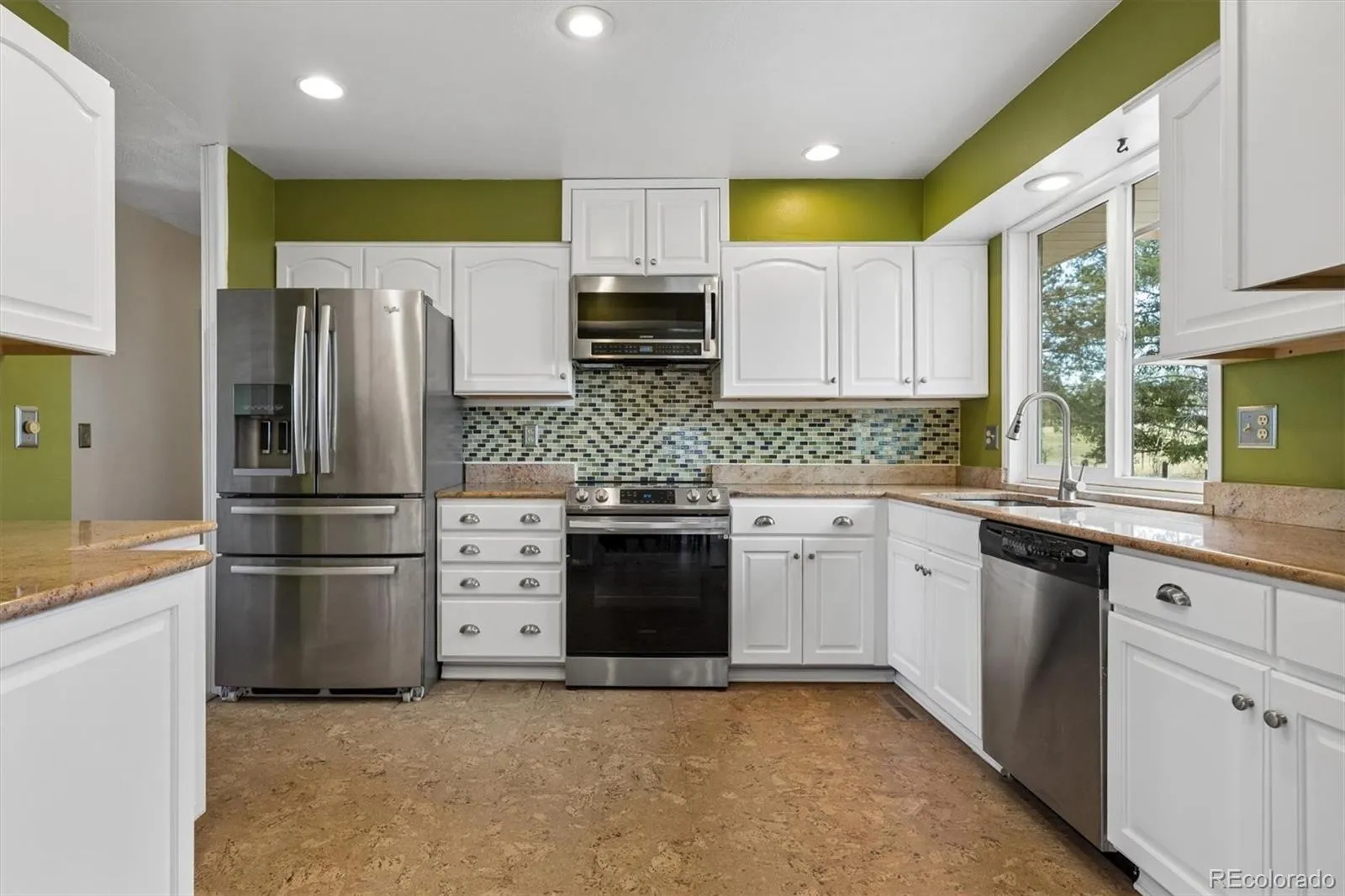Kitchen offers granite counters, cork floors, and stainless steel appliances. White cabinets. Enjoy the formal dining room connected to living room. Bonus dining nook in the additional family room. Living room offers handy deck access and a wood burning fireplace. Laminate wood ten year old floors,