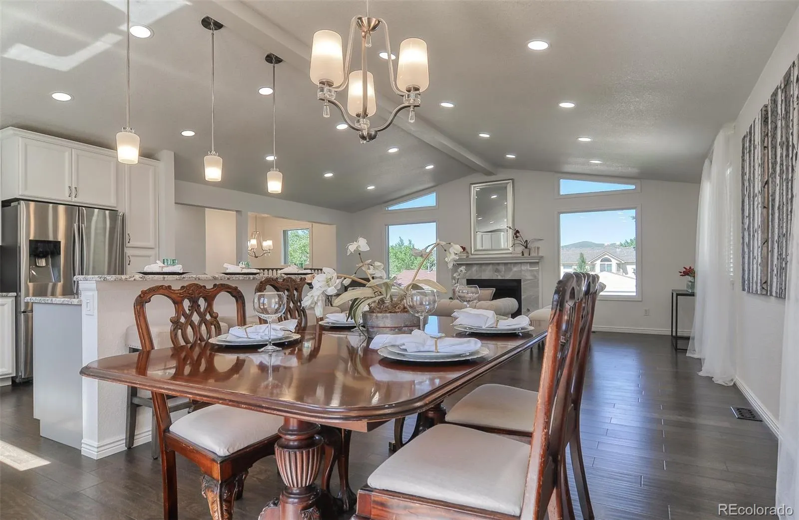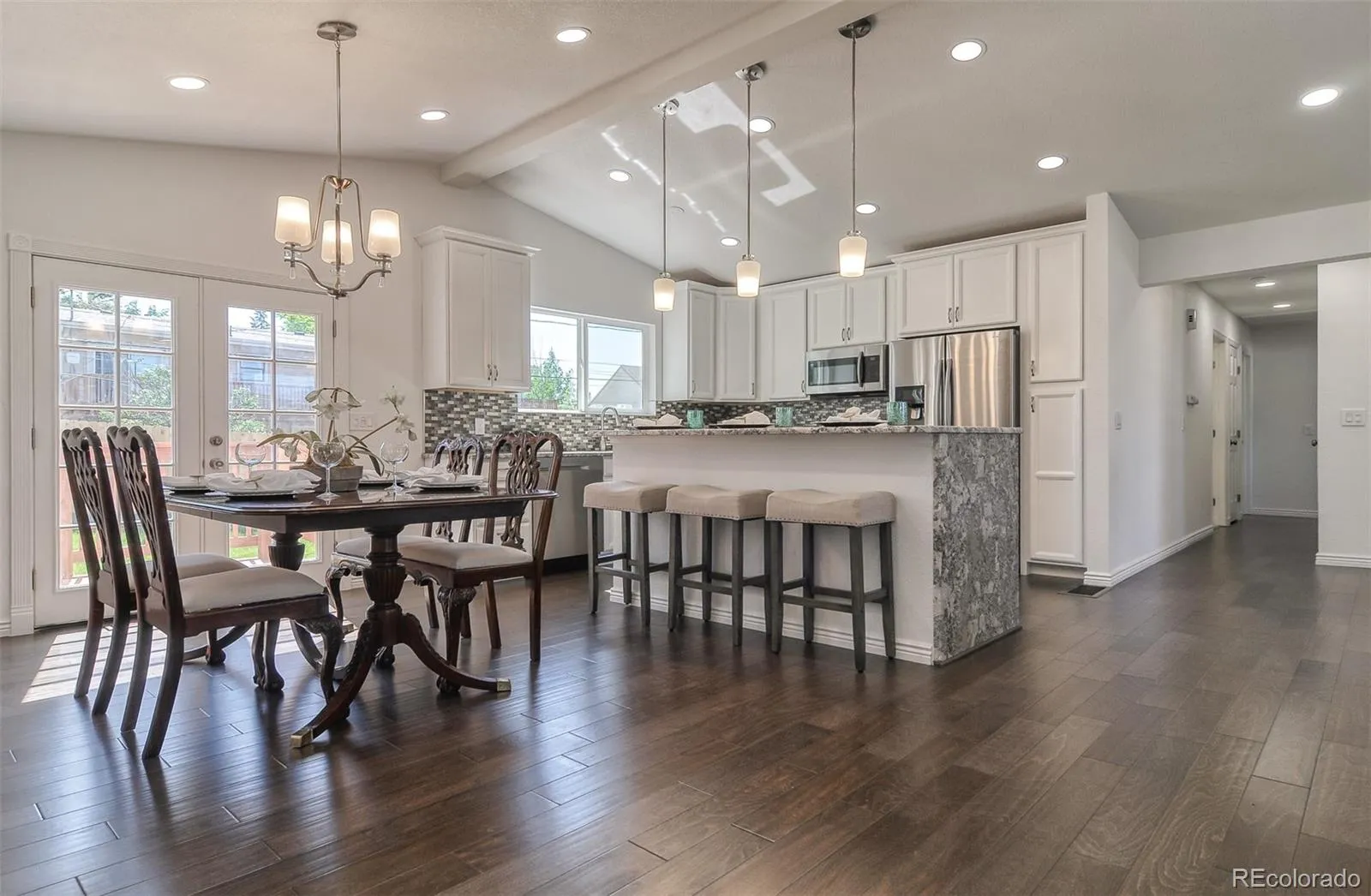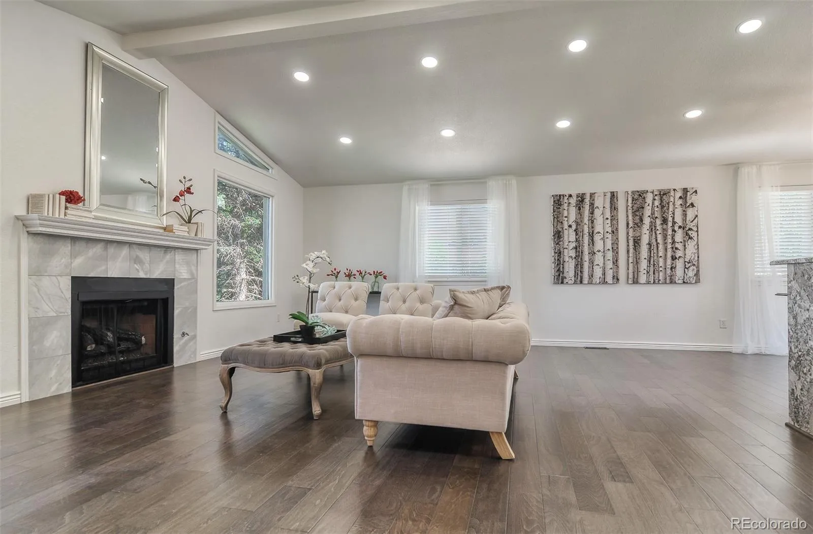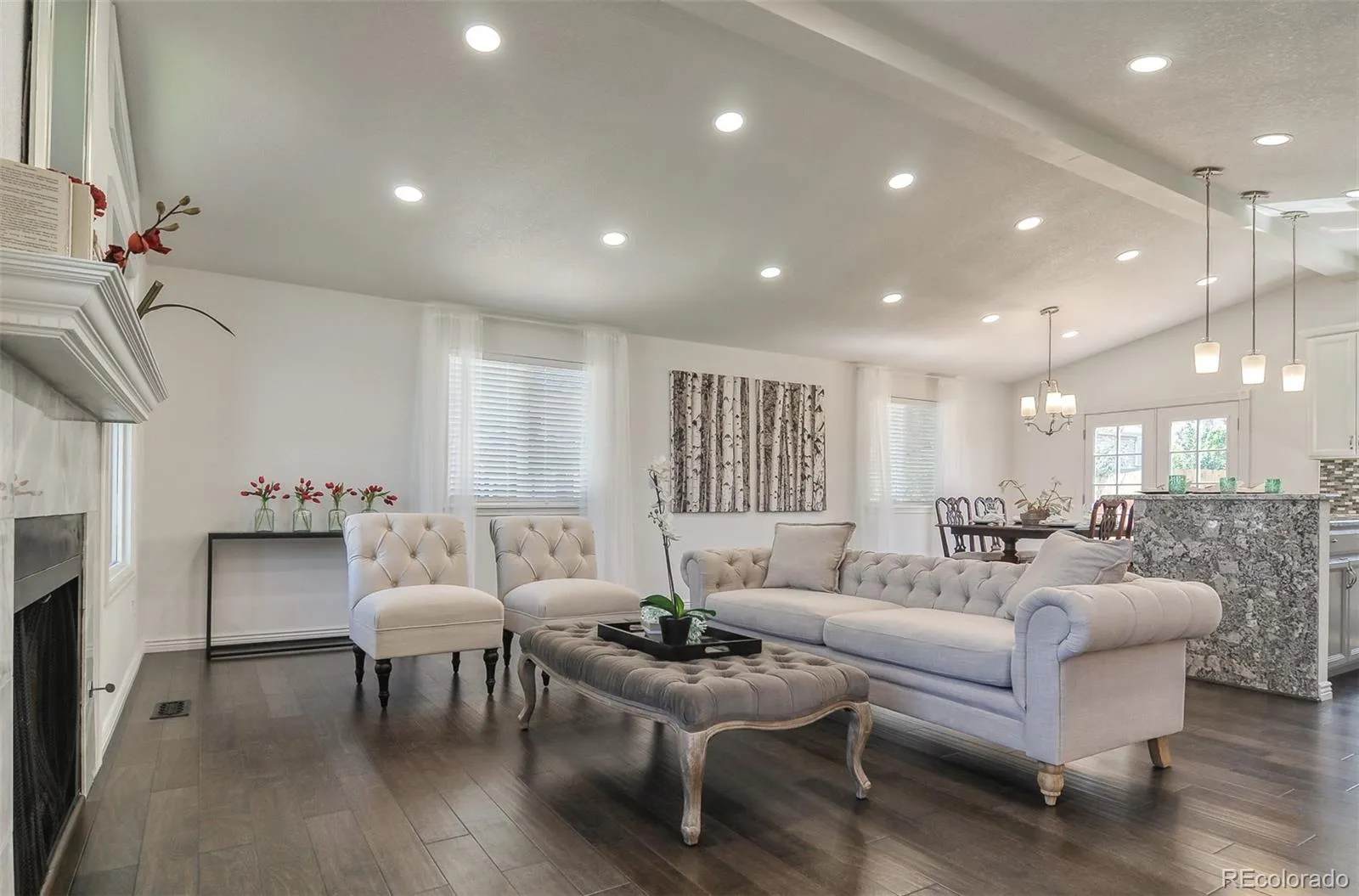 Beautifully updated Littleton home featuring 4 bedrooms, 3 full bathrooms, and over 2,300 sq ft of finished living space on over a quarter-acre lot with mountain views and no HOA. Enjoy a spacious bi-level layout with multiple living areas, abundant natural light, engineered hardwood upstairs, and new carpet downstairs. The kitchen has gas stove top, stainless steel appliances, and granite countertops including a stunning waterfall island. All full bathrooms feature custom tile and granite counters.