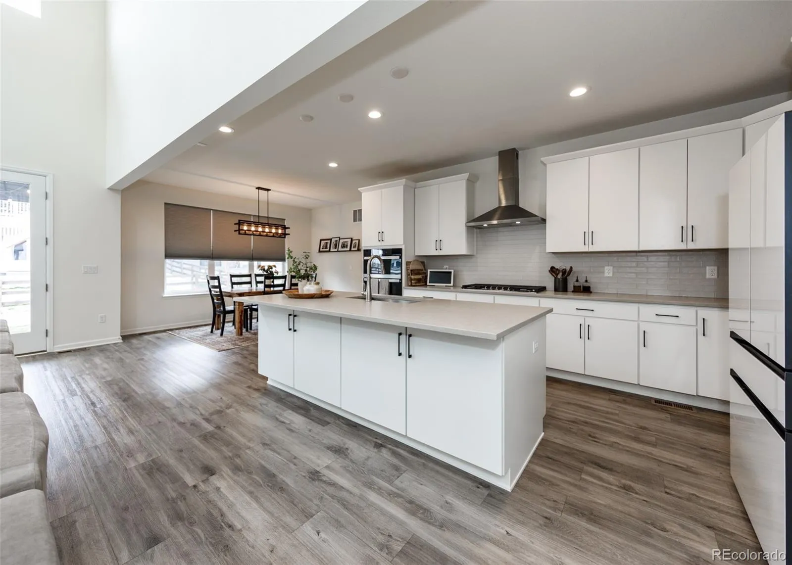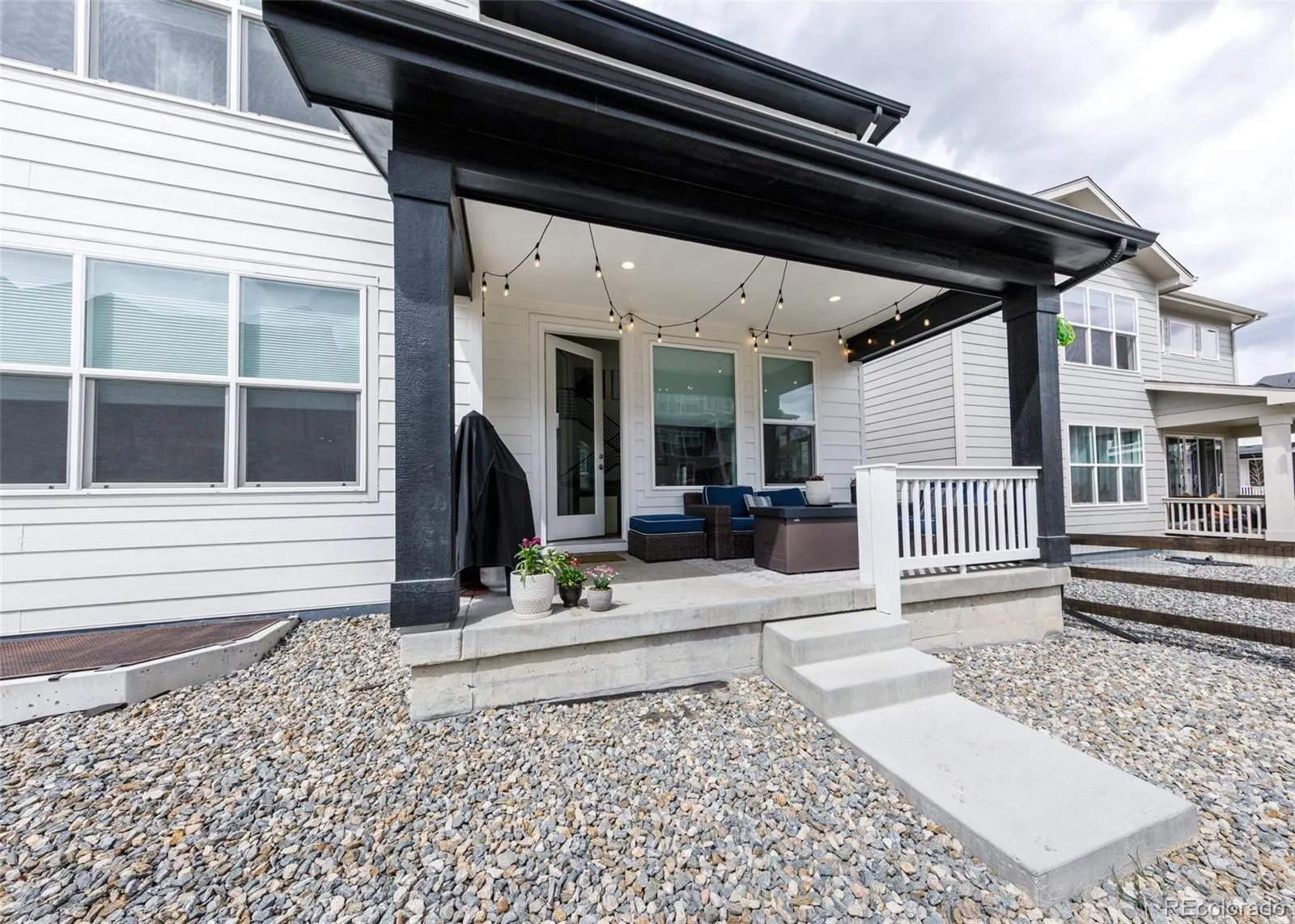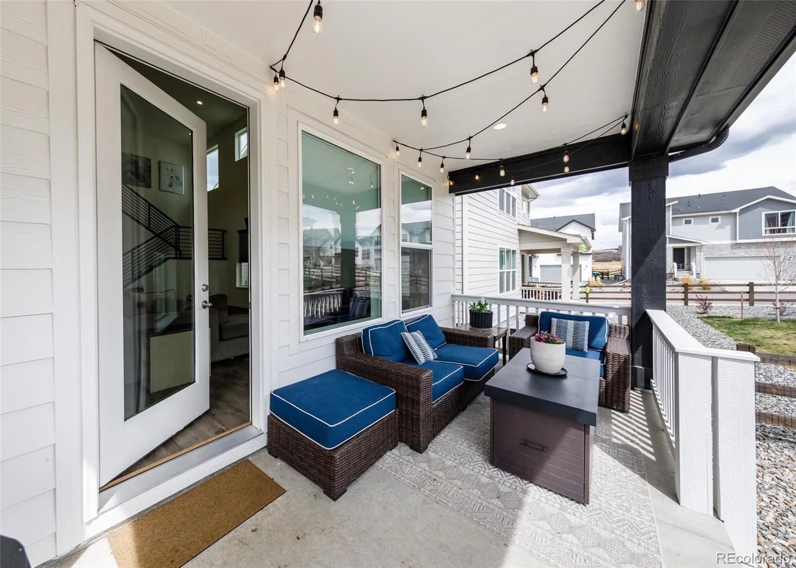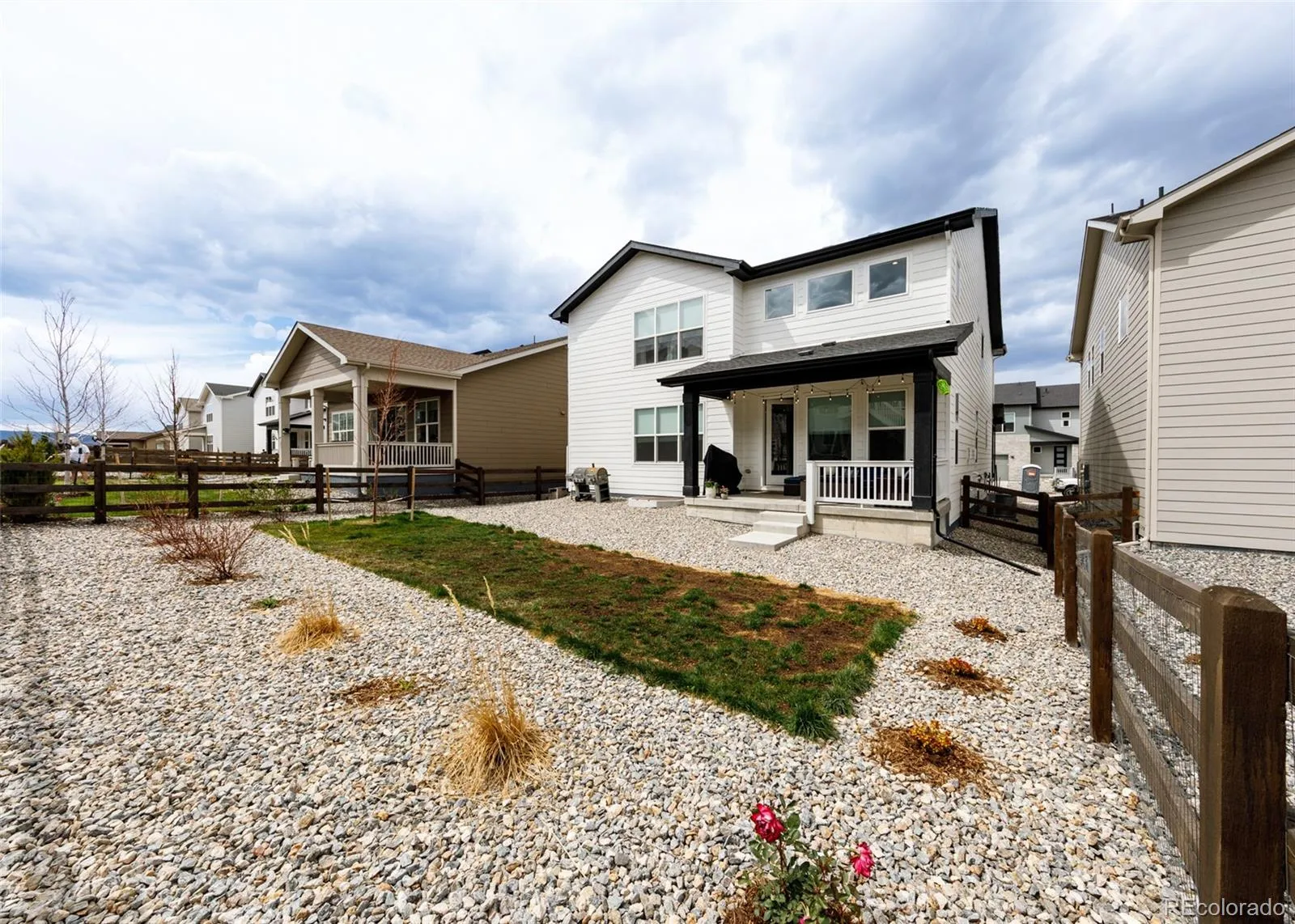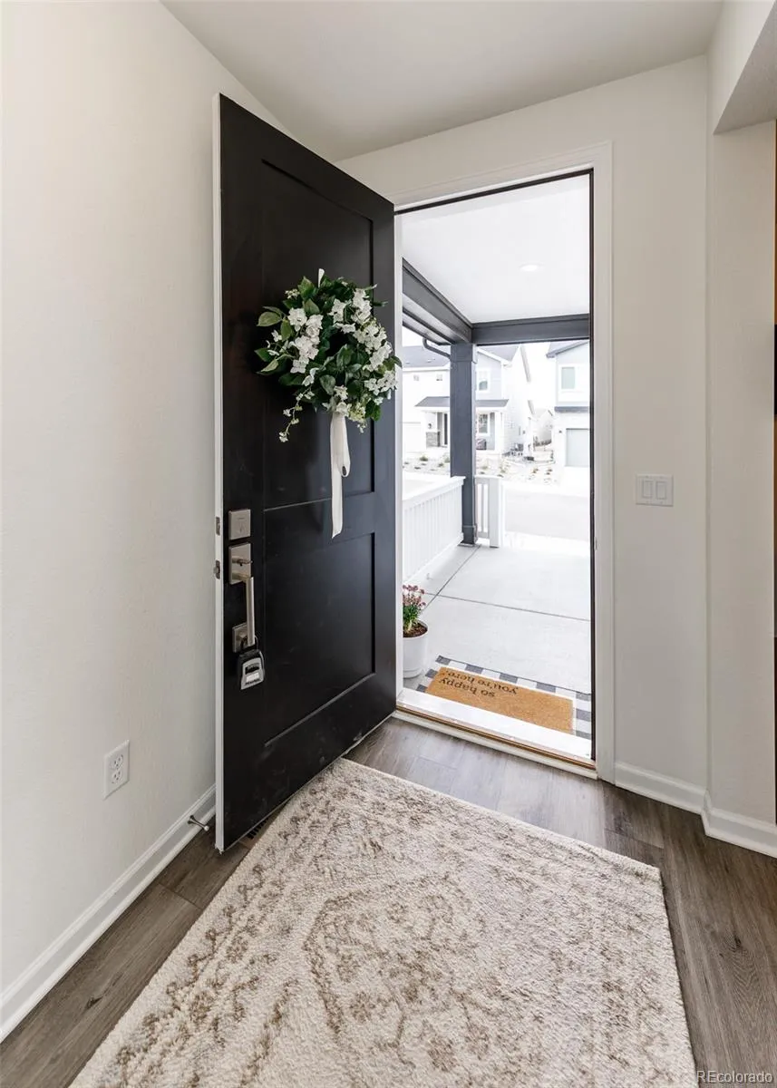 Beautifully upgraded 2-story home offering 4 bedrooms, 3.5 baths, and a 3-car tandem garage. With 2,706 finished sq ft and an additional full, unfinished basement, this home provides both comfort and room to grow. The inviting covered front porch leads into a bright, open layout featuring wood laminate flooring throughout the main level. Just off the entry is a built-in office space, perfect for remote work or other flex space. A convenient half bath is also located near the entry. The stunning great room features soaring two-story ceilings and a gas fireplace with stone surround. The kitchen is designed to impress with a large island, quartz countertops, subway tile backsplash, white cabinetry with crown molding, stainless appliances, gas cooktop with hood, wall oven, and microwave. The adjoining dining area offers ample space for a large table and is filled with natural light from windows across the back of the home, with access to a covered patio and fenced yard. There is also a spacious walk in pantry on the way to the 3 car garage. Upstairs features four large bedrooms, all with walk-in closets. The private primary suite includes its own thermostat, abundant windows, and a luxurious bath with dual vanities, quartz counters, oversized walk-in shower with floor-to-ceiling tile and bench, and a large walk-in closet. Two additional full bathrooms, a convenient laundry closet, and a large linen closet complete the upper level. The unfinished basement includes a sump pump, radon mitigation system, rough-in plumbing, and large window wells. Additional upgrades include central A/C, tankless water heater, whole house humidifier, epoxy garage floors, sprinkler system front and back, and pre-wiring for 5.1 surround sound. Washer, dryer, and brand new window coverings included. Community features – Clubhouse, Fitness Center, Pool, Parks & Trails, Tennis Court, and convenient location with quick access to all local amenities, including I-25 for an easy commute!