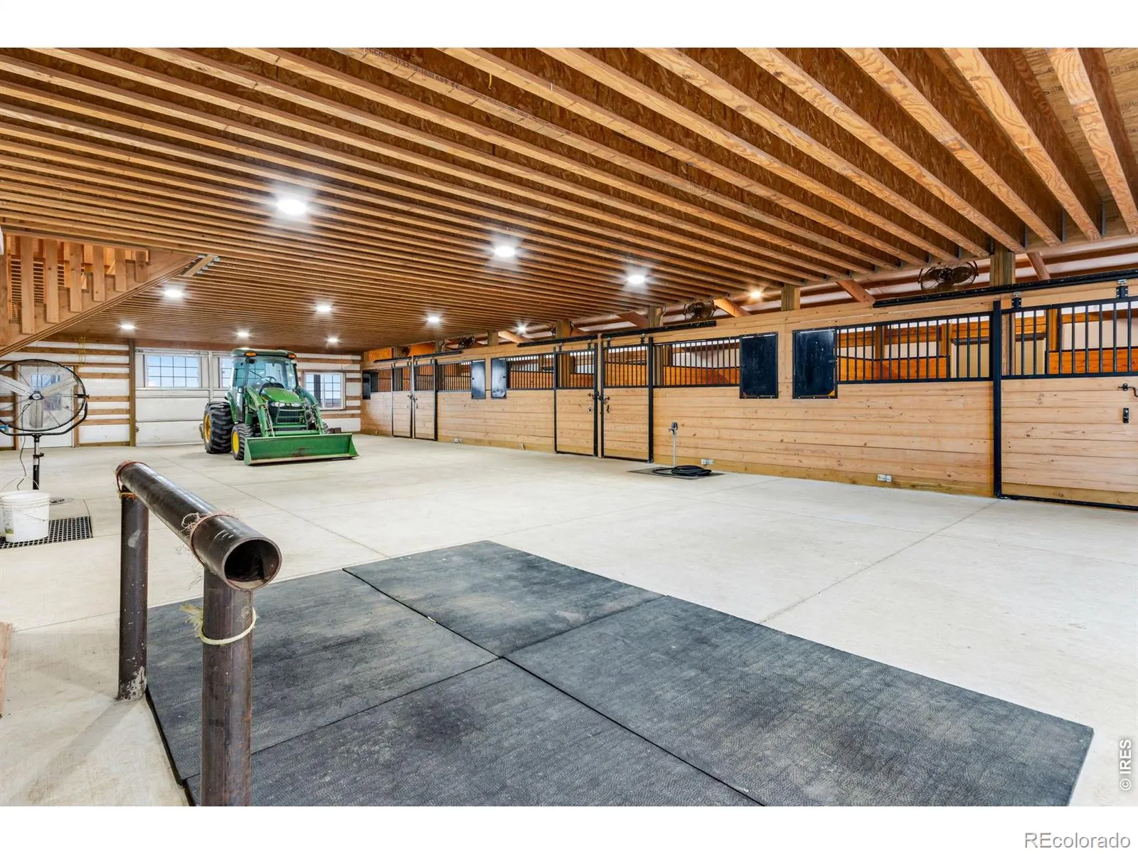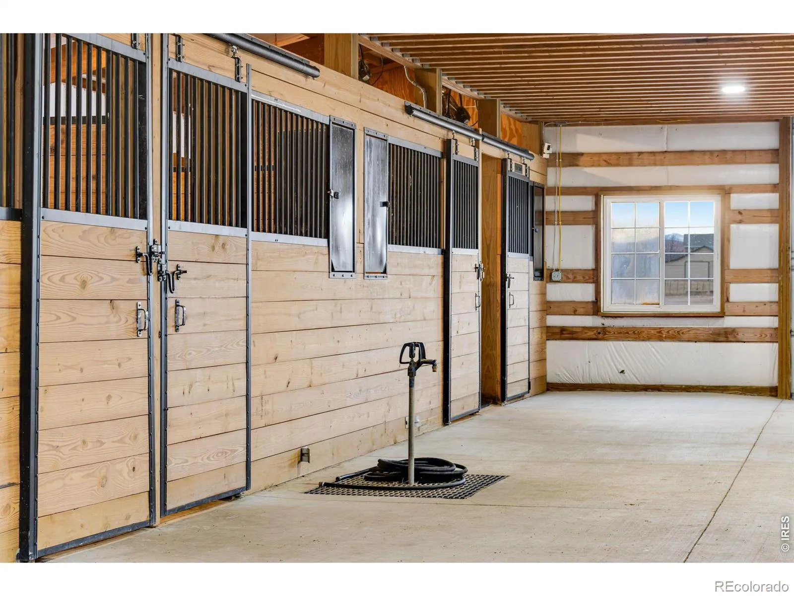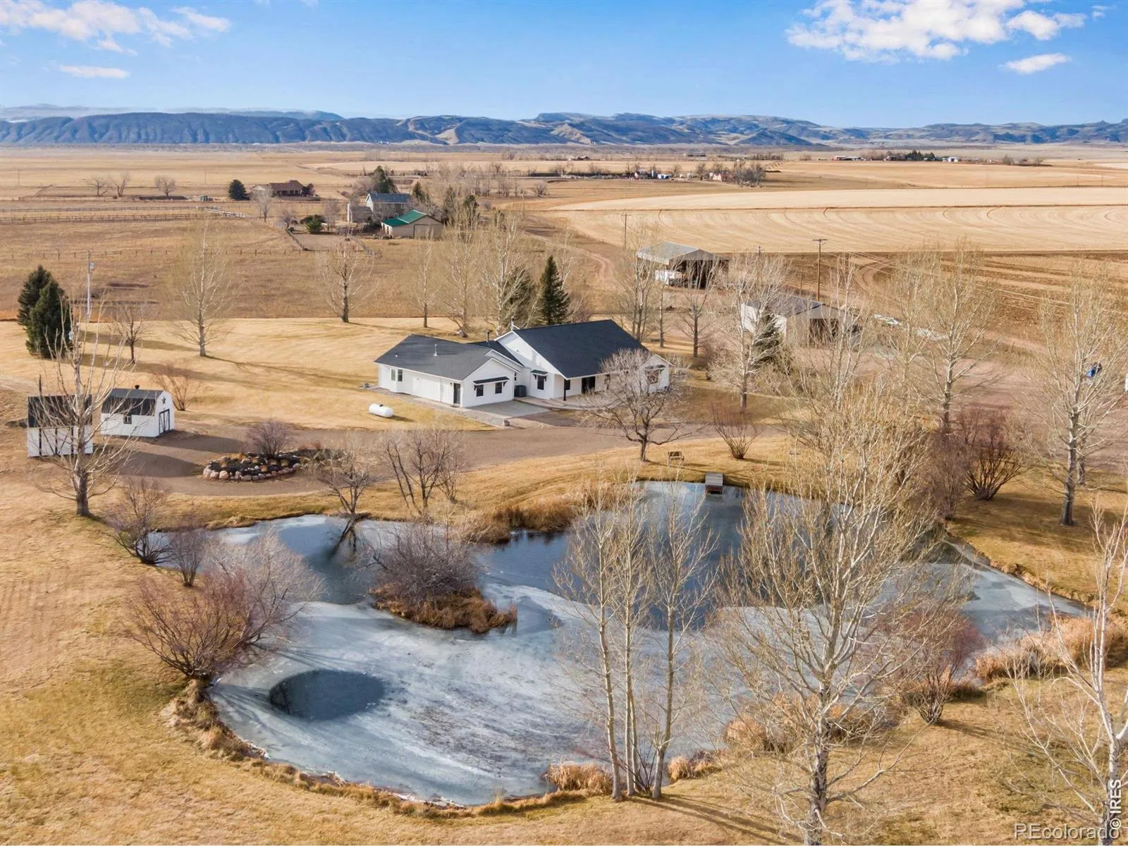 Exceptional, fully updated equestrian estate on 35.669 acres w/ NO HOA, NO METRO TAX & open zoning. Originally built in 1998 & extensively remodeled in 2023, offering privacy, functionality, & panoramic Rocky Mountain views. This rare property features a stocked pond w/ bass, dock, & sitting areas; 4 fenced pastures; 5 loafing sheds; round pen; 240′ x 137′ lite riding arena; pump shed; 3 storage sheds; & 8 exterior water hydrants, all accessed by a private driveway set back a .5 miles from the county road for privacy. Equestrian amenities are anchored by a 3,888 sq ft barn featuring 6 stalls each w/ private runs, tack room, wash bay, hay storage, a 2,232 sq ft loft, main-level concrete patio, & upper-level observation deck. A 1,545 sq ft detached drive-through RV/boat garage & shop features 220V, added electrical, air compressor, & included shelving, cabinets, & workbench. The park-like setting includes mature landscaping, sprinkler & drip systems, wood-burning fire-pit, horseshoe pits, expansive east-facing patios for sunrise views, & west-facing covered & uncovered patios w/ ceiling fan overlooking nightly Rocky Mountain sunsets. The primary residence showcases a split floor plan, front office, formal dining, white trim, new windows & doors, upgraded lighting, new paint & carpet. The chef’s kitchen features a large island, quartz countertops, SS appliances, 6-burner gas range, commercial hood, double ovens, warming drawer & a walk-in pantry. Living spaces include a family room w/ wood-burning fireplace, oversized bedrooms including a private guest en-suite, 2 beds w/ a Jack-and-Jill bath, & a luxurious primary bedroom w/ retreat featuring a 5-pc. bath, & two walk-in closets. Home also features a massive laundry room designed for everyday efficiency & includes a mini refrigerator & ice-maker. For a full list of features, floor plan, or to schedule a showing, please e-mail brokers