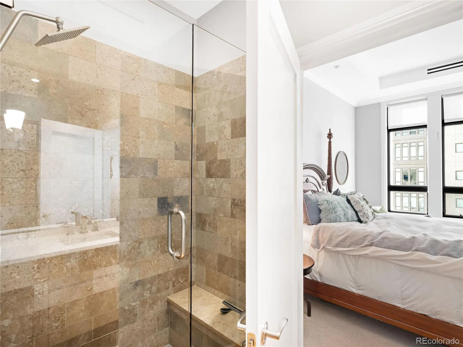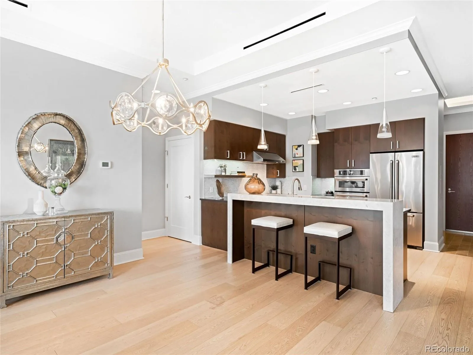 Step into this updated 2 bed plus office, 2 bath home that offers the perfect blend of elegance, comfort, and functionality. Located in the sought-after Landmark Condominiums, this home has been cherished by its original owner since it was first sold in 2015. Featuring stunning western views of the Front Range, you’ll feel like you’re living in a retreat, yet just moments away from all the conveniences you need. The home’s open floor plan seamlessly flows into a gourmet kitchen equipped with JennAir appliances, including a gas cooktop and French door refrigerator. Whether you’re preparing a meal or enjoying casual dinners, the kitchen peninsula offers a perfect place to gather, while the adjacent dining room with its modern chandelier creates an inviting space for meals with loved ones. The living room provides ample space to unwind, with an attached balcony that brings the stunning views of the mountains right into your living room. The primary suite is truly an oasis, featuring breathtaking mountain views and plenty of room for a king bed, oversized nightstands, and a dresser. The attached five-piece bath boasts a jetted tub, dual sink vanities, a frameless glass shower with a no-step entry, and a large custom walk-in closet. On the opposite side of the unit, the secondary bedroom offers its own mountain views, a 3/4 bath also accessible from the hallway adds convenience for guests, while the custom walk-in closet provides plenty of storage. An oversized custom coat closet and a spacious office with built-in shelves, ideal for working from home or hosting guests, greets you upon entry. Storage throughout the home is exceptional, with a dedicated laundry room featuring extra cabinetry and shelving, a kitchen pantry and additional linen closet space in the hallway. This home is more than just a place to live it’s a lifestyle with amenities like concierge, pools/spas, theater, gyms, guest suites and restaurants of almost every cuisine just steps outside your door.