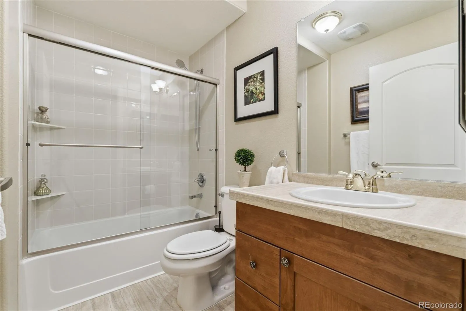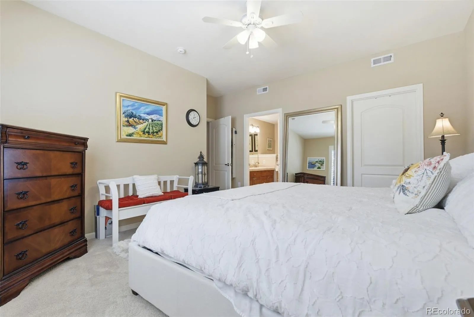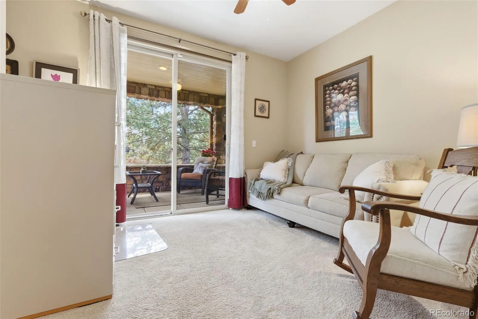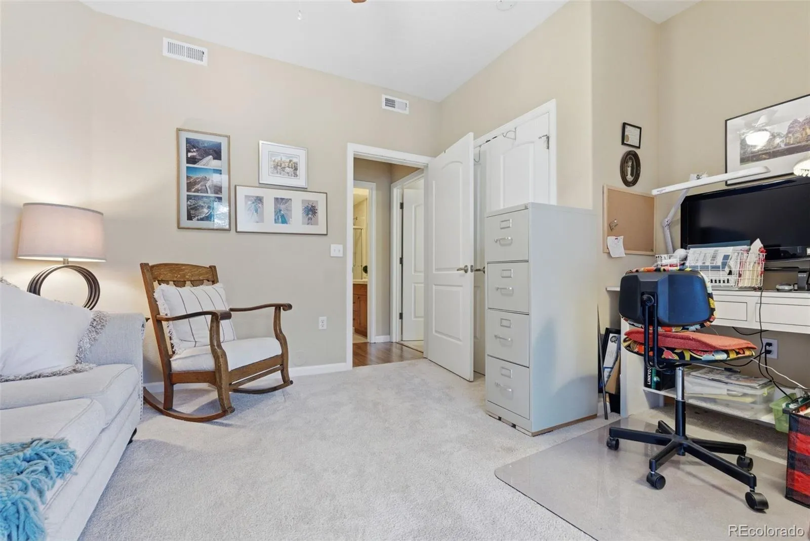The secondary bedroom provides flexibility as a guest room/ home office and is directly adjacent to a nicely appointed full bathroom. This bedroom also offers easy access to the large covered patio—perfect for entertaining or taking in the activity in the park across the street.