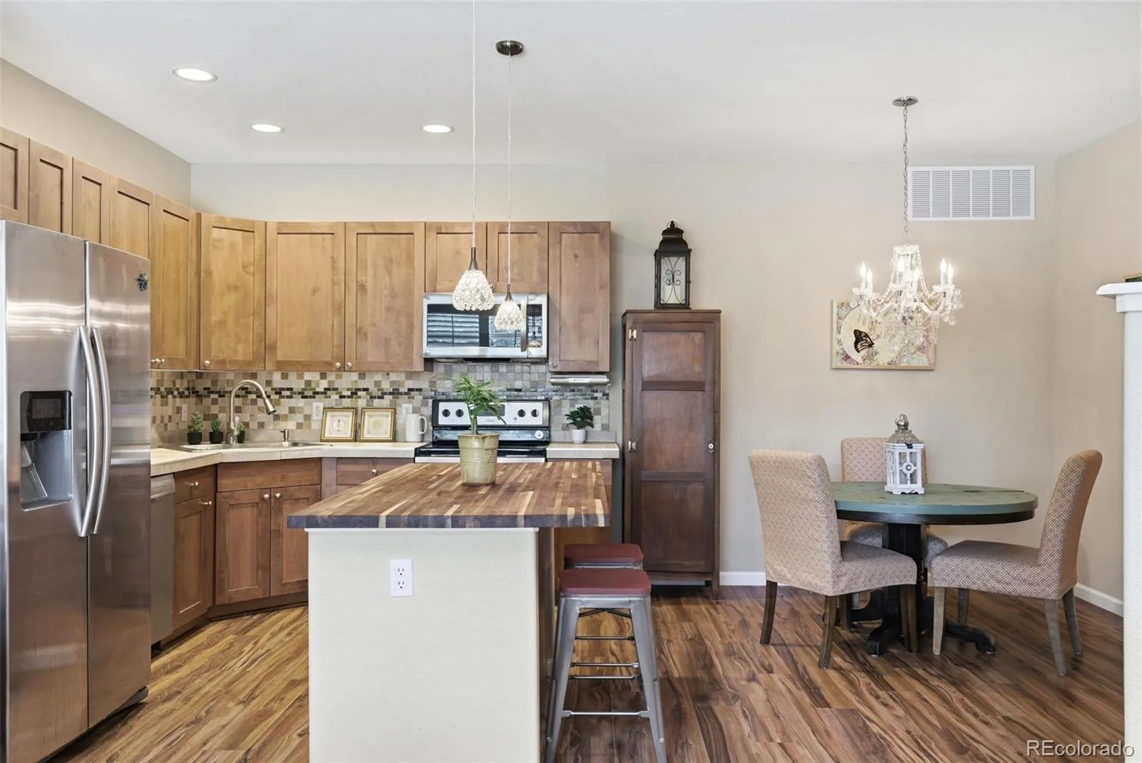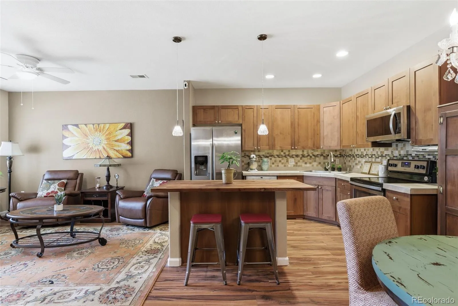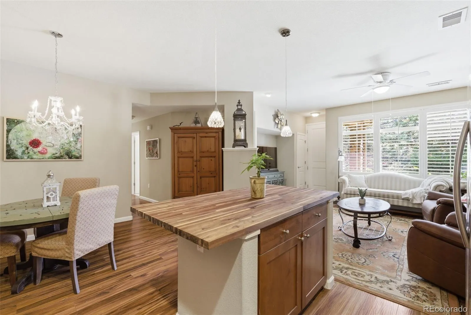 The open-concept living, dining, and kitchen areas offer great flexibility and warmth. The home features laminate wood flooring, plantation shutters, newer Pella windows, and a warm, convenient gas fireplace. The upgraded kitchen is both functional and stylish, featuring stainless appliances, abundant custom cabinetry, stone counters, and a glass tile backsplash. The kitchen also includes a large center island w/ butcher block counters, additional storage, and custom lighting—perfect for everyday living or entertaining.