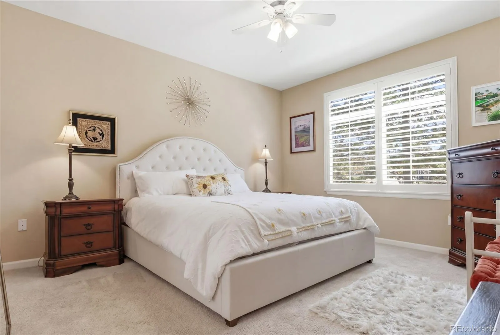 The large, sun-drenched primary suite features plantation shutters, newer windows, a massive walk-in closet, and a recently updated spa-like private en-suite bathroom with custom stone counters and flooring.