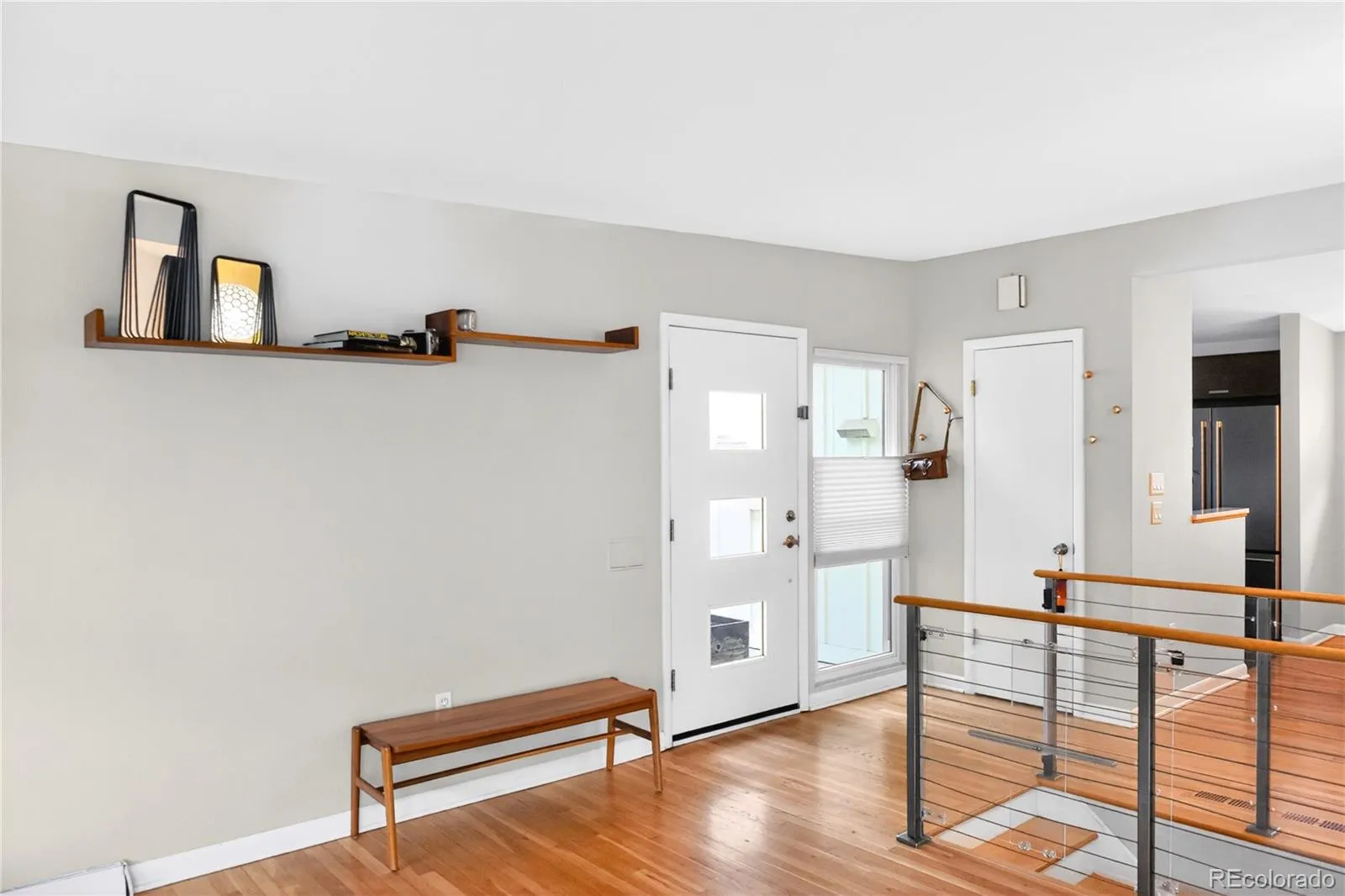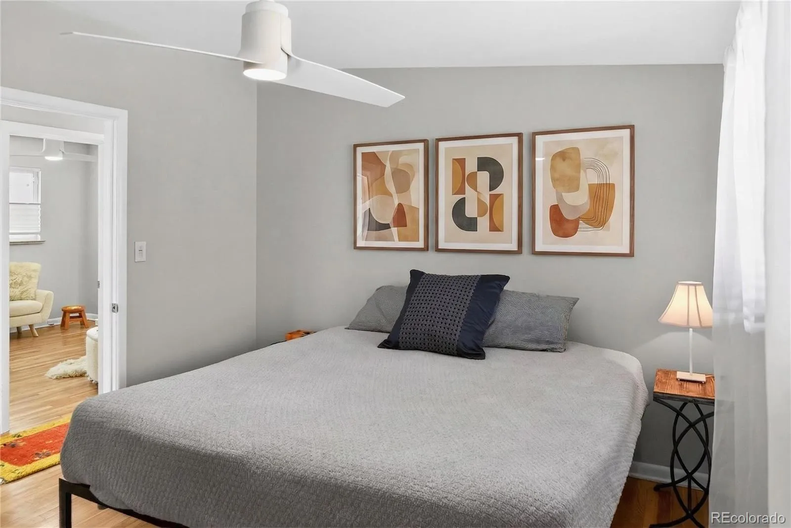 Inside, the main level features hardwood floors and three bedrooms, including a primary suite with an ensuite bath and direct access to the backyard, creating a seamless indoor-outdoor connection. Each bedroom includes upgraded lighting and ceiling fans. The living room is filled with natural light and centered around a gas fireplace, creating a warm and inviting space year-round. The kitchen features soft-close drawers, up/down blinds for ideal light and privacy, and an adjacent space currently used as a home office that easily transitions to dining.