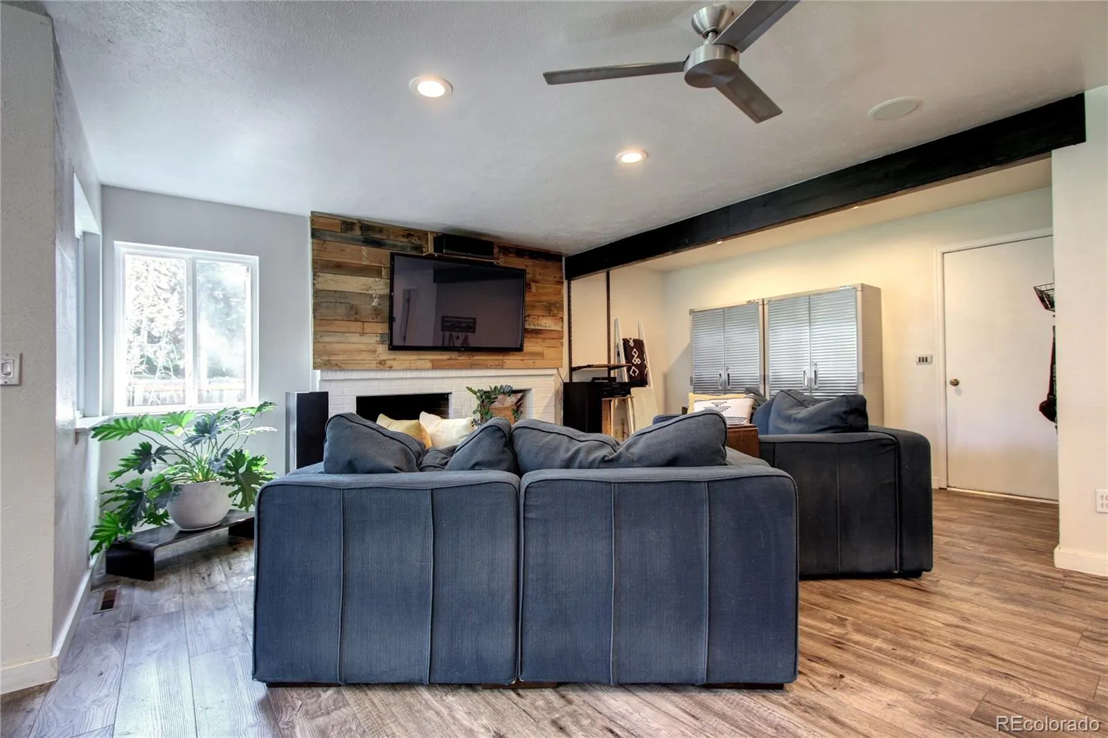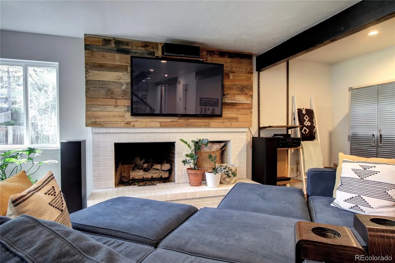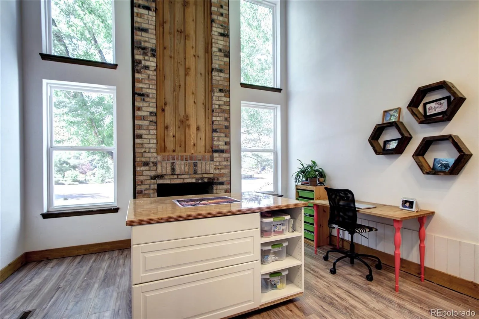 The main level also features a versatile study with exposed brick and a wood-burning fireplace, perfect for an office, creative space, or playroom, along with a convenient half bath.
