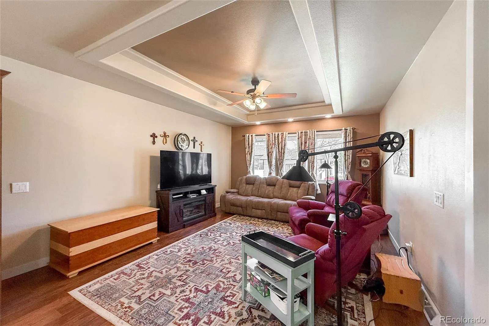 As you step into this inviting 1,380 sq ft ranch home, you are greeted by a bright, open-concept living space that flows from the living room into the kitchen and dining area, creating a warm and welcoming atmosphere. The heart of the home features rich chestnut cabinetry, elegant brushed nickel hardware, hard surface counters, black stainless steel appliances, an island, and a stylish subway tile backsplash. A laundry entry connects directly from the oversized two-car garage, while elegant tray ceilings add sophistication to the living, dining, and primary bedroom. From the dining room, a slider opens to an east-facing patio, perfect for shaded afternoons. The hall bath is bathed in natural light with a relaxing tub and shower combination. This home offers two spacious secondary bedrooms and a private primary bedroom suite, complete with a luxurious primary bath offering a double vanity and large walk-in shower. This move-in ready home sits on a quiet cul-de-sac in the desirable Prairie Greens community of Frederick. Located within walking distance to charming downtown Frederick, you can enjoy trendy restaurants, boutique shops, and cozy coffee spots. The community offers a relaxed pace with no HOA and an affordable $825/mth land lease that covers the land, road maintenance, and exclusive access to amenities, including a clubhouse with party rooms, a warming kitchen, fitness center, and an outdoor pool. With quick access to the I-25 corridor and Hwy 85, commuting is effortless whether heading north to Fort Collins or south to Denver. Explore local attractions such as the Frederick Recreation Area with its fishing pond, playgrounds, and paved trails, the Bella Rosa Golf Course, and downtown Frederick’s delightful dining and shopping. This thoughtfully designed home combines modern comfort and an unbeatable location. Schedule your showing today and discover why this home is the perfect place to live your best life in Frederick! SHOWINGS START FRIDAY!