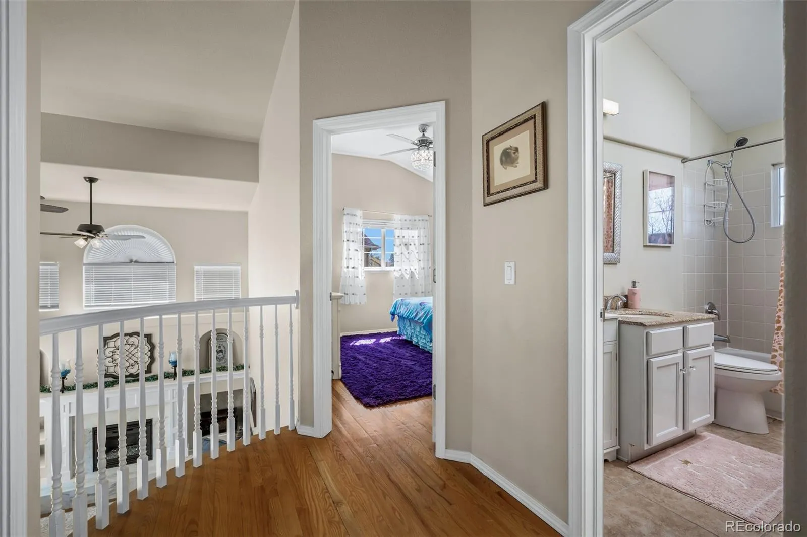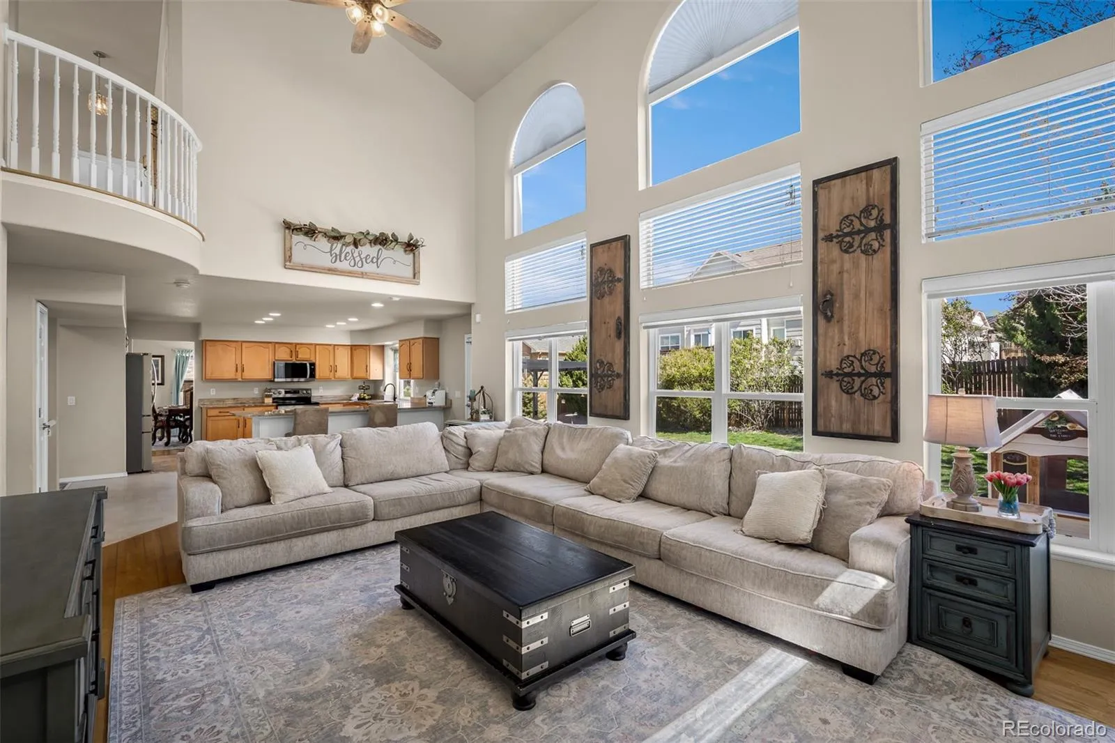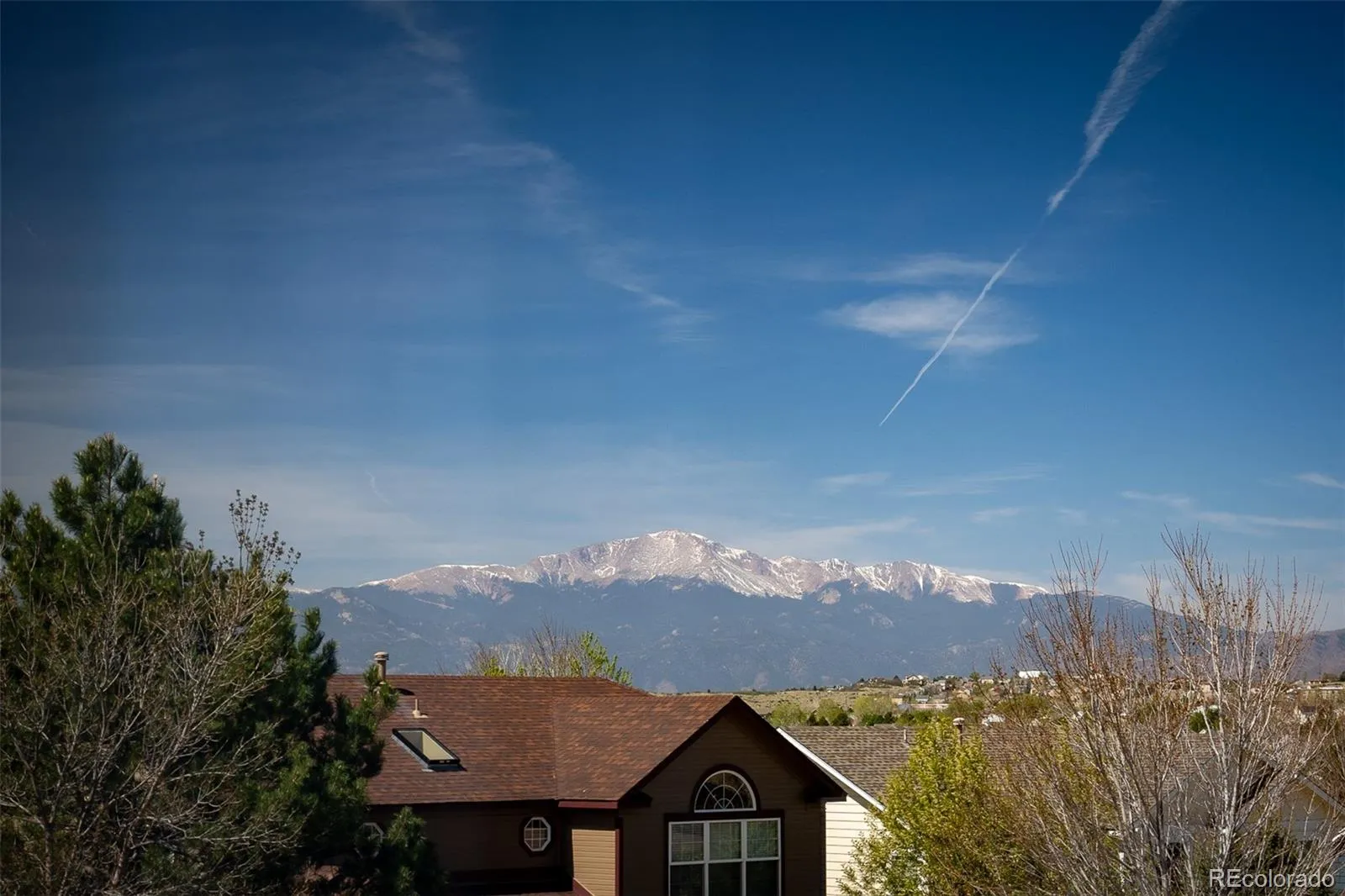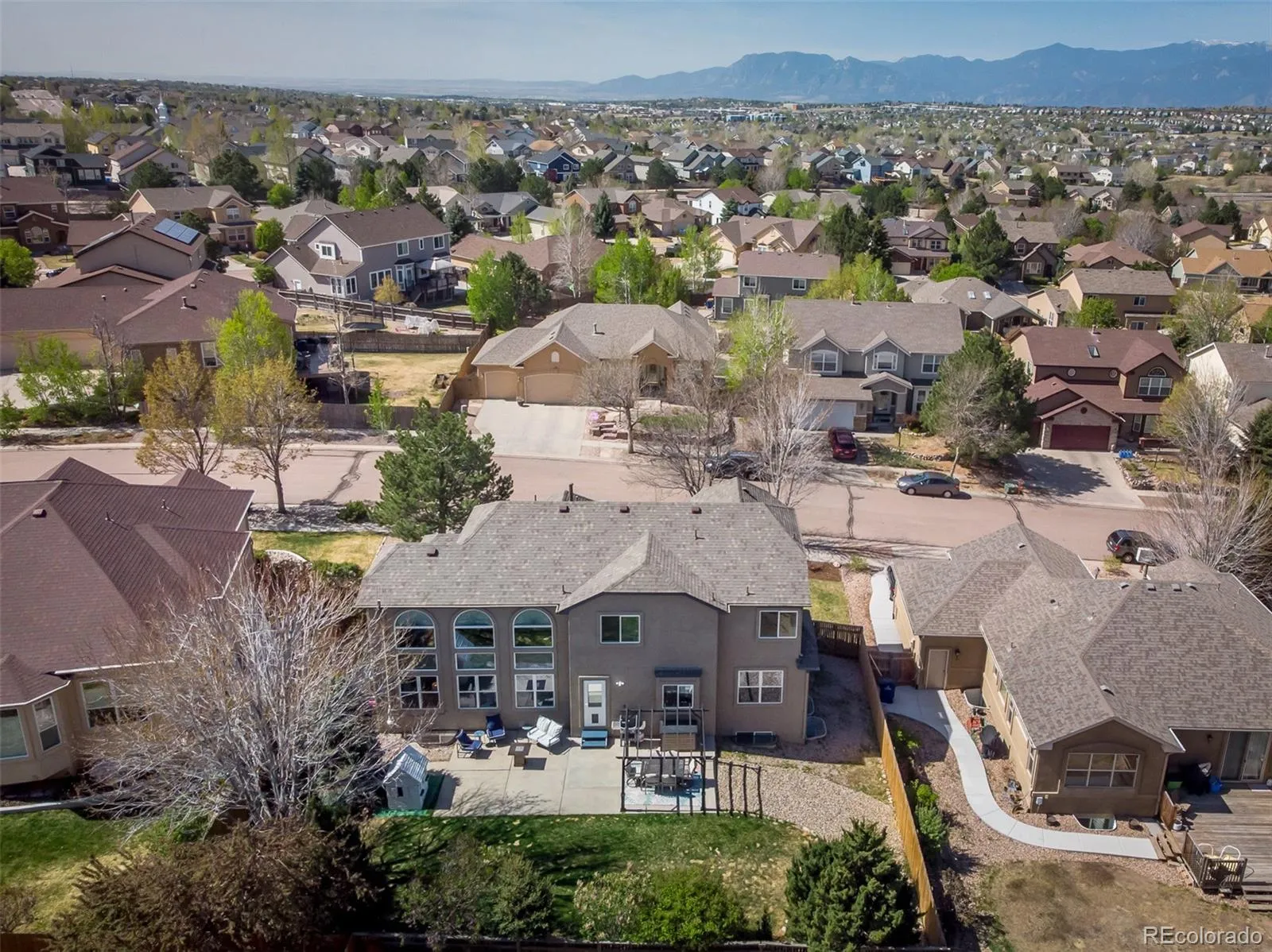 Step into this well-maintained south-facing stucco home in Indigo Ranch at Ridgeview, where mountain views welcome you from the front porch. A thoughtfully updated, spacious two-story offers a functional layout with inviting, well-connected living spaces throughout. The main level features hardwood floors, high ceilings, and updated finishes that create a clean, cohesive feel. The kitchen includes maple cabinetry, quartzite countertops, stainless steel appliances, and a pantry that flows seamlessly into the spacious great room, creating a layout that feels expansive and very functional. A wall of windows and 20-foot ceilings bring in abundant natural light, enhancing the sense of space, while built-ins and a gas fireplace with a custom mantle add comfortable everyday living. Convenient main-level powder room and laundry room. Upstairs, the vaulted primary suite includes hardwood flooring, a five-piece bath with soaking tub, dual vanities, and a walk-in closet. Two additional bedrooms and a loft-style balcony overlook into the great room, serving as a unique architectural feature and focal point. The finished basement offers 9-foot ceilings, a large recreation area, and a fourth bedroom with a walk-in closet and full bath, making it an ideal guest suite or private living space. The rear yard is private and fully fenced with mature landscaping and a large concrete patio, perfect for relaxing, enjoying summer BBQs, and hosting gatherings. Additional features include an oversized 3-car garage, central air, plantation shutters, updated lighting, a new roof installed in 2024, a radon mitigation system, some fresh interior paint, exterior repainted, and a newer kitchen floor. Located near parks, trails, schools, and shopping along the Powers Corridor with convenient access to Peterson and Schriever Space Force Bases. This home checks all the boxes with space, updates, and location—schedule your showing and see why this one stands out the moment you walk in!