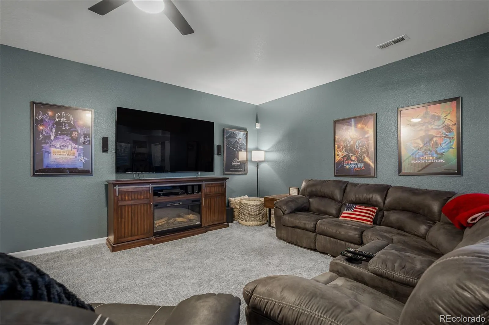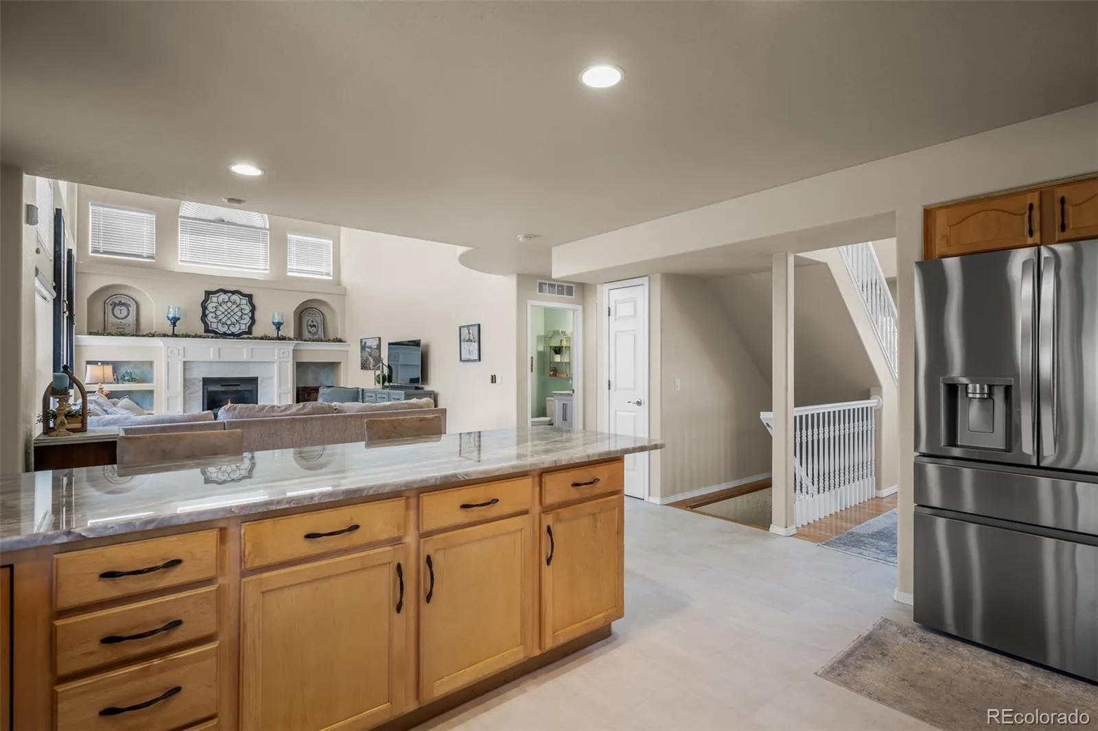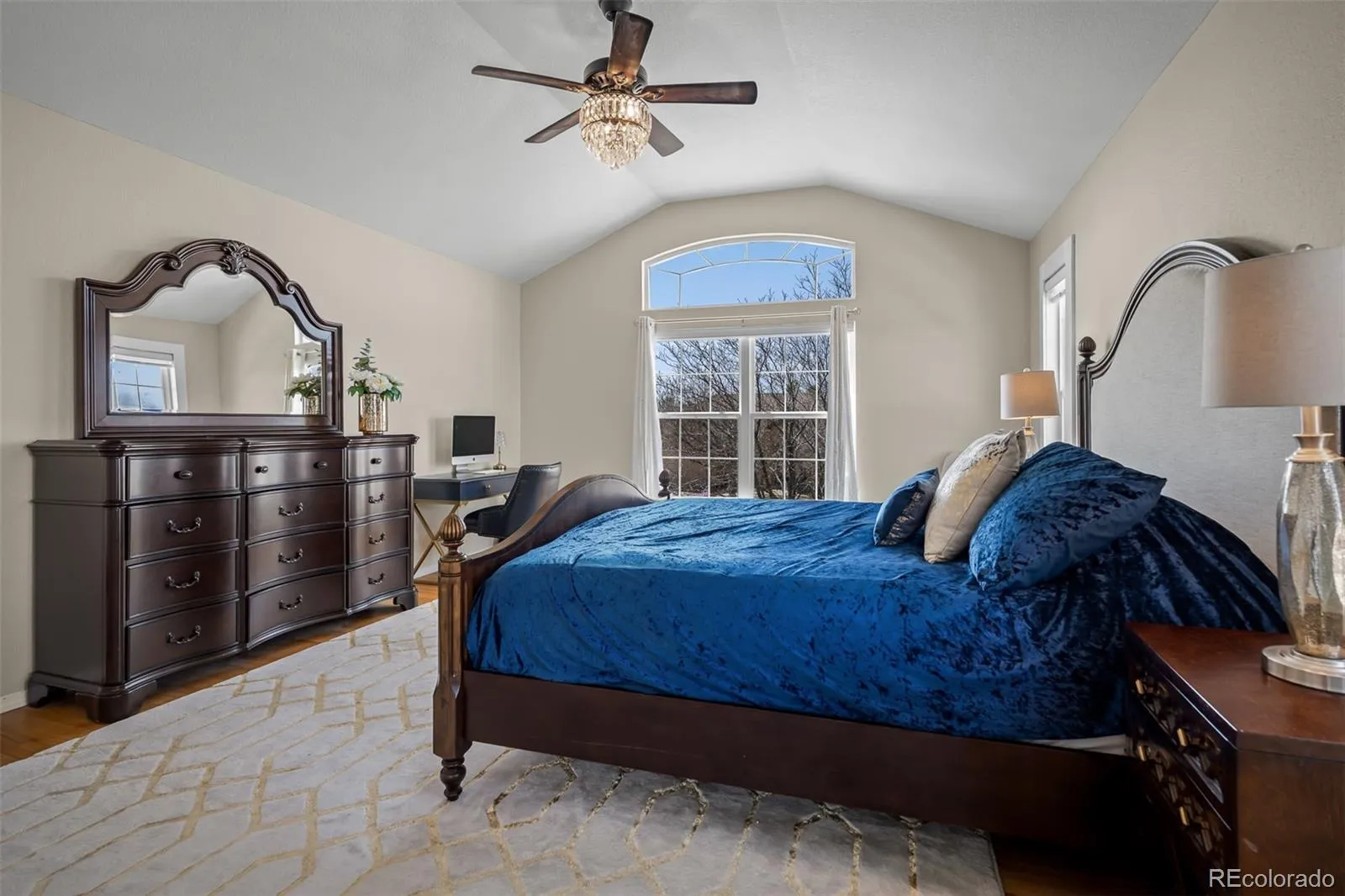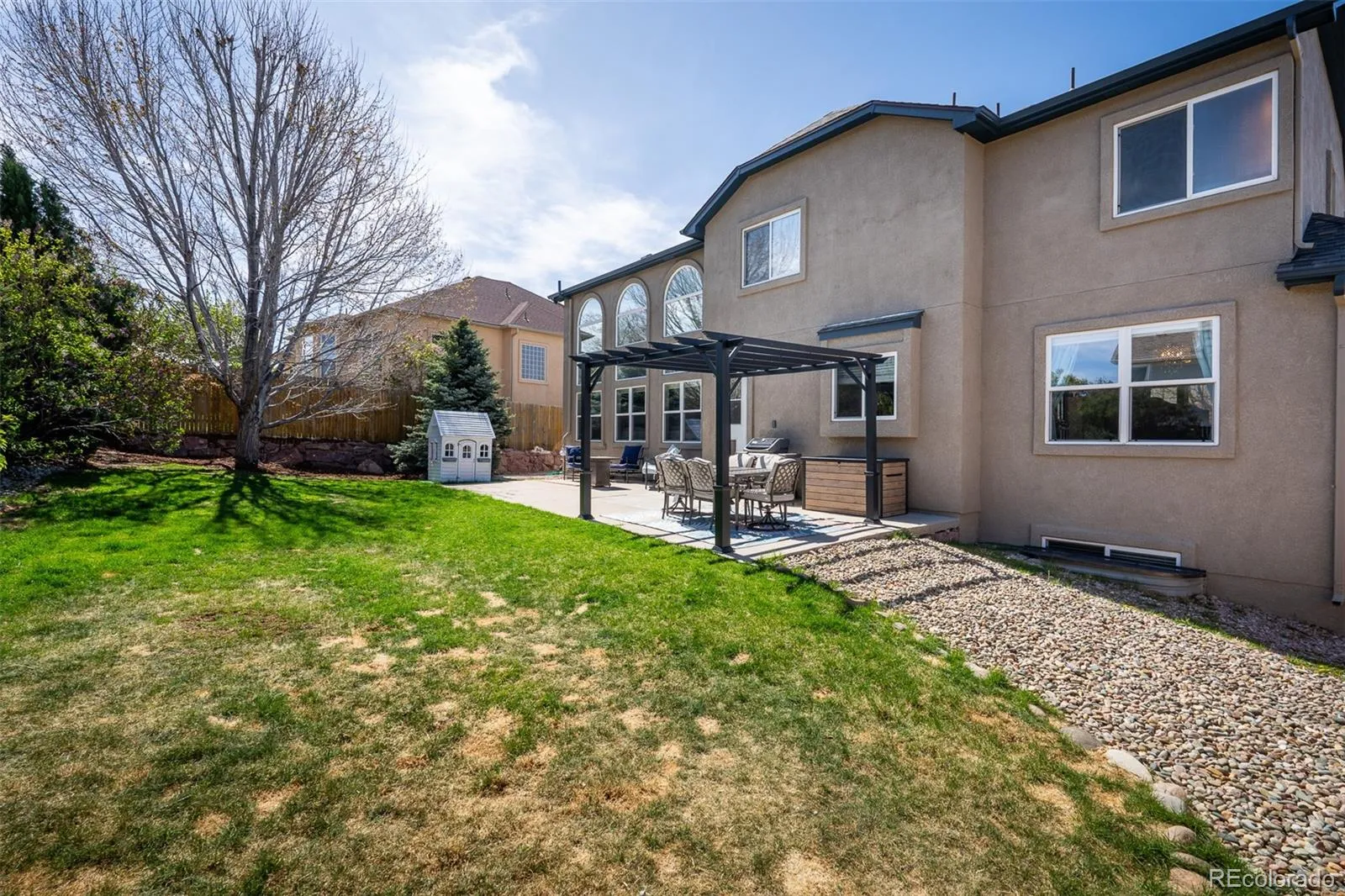 Step into this well-maintained south-facing stucco home in Indigo Ranch at Ridgeview, where mountain views welcome you from the front porch. A thoughtfully updated, spacious two-story offers a functional layout with inviting, well-connected living spaces throughout. The main level features hardwood floors, high ceilings, and updated finishes that create a clean, cohesive feel. The kitchen includes maple cabinetry, quartzite countertops, stainless steel appliances, and a pantry that flows seamlessly into the spacious great room, creating a layout that feels expansive and very functional. A wall of windows and 20-foot ceilings bring in abundant natural light, enhancing the sense of space, while built-ins and a gas fireplace with a custom mantle add comfortable everyday living. Convenient main-level powder room and laundry room. Upstairs, the vaulted primary suite includes hardwood flooring, a five-piece bath with soaking tub, dual vanities, and a walk-in closet. Two additional bedrooms and a loft-style balcony overlook into the great room, serving as a unique architectural feature and focal point. The finished basement offers 9-foot ceilings, a large recreation area, and a fourth bedroom with a walk-in closet and full bath, making it an ideal guest suite or private living space. The rear yard is private and fully fenced with mature landscaping and a large concrete patio, perfect for relaxing, enjoying summer BBQs, and hosting gatherings. Additional features include an oversized 3-car garage, central air, plantation shutters, updated lighting, a new roof installed in 2024, a radon mitigation system, some fresh interior paint, exterior repainted, and a newer kitchen floor. Located near parks, trails, schools, and shopping along the Powers Corridor with convenient access to Peterson and Schriever Space Force Bases. This home checks all the boxes with space, updates, and location—schedule your showing and see why this one stands out the moment you walk in!