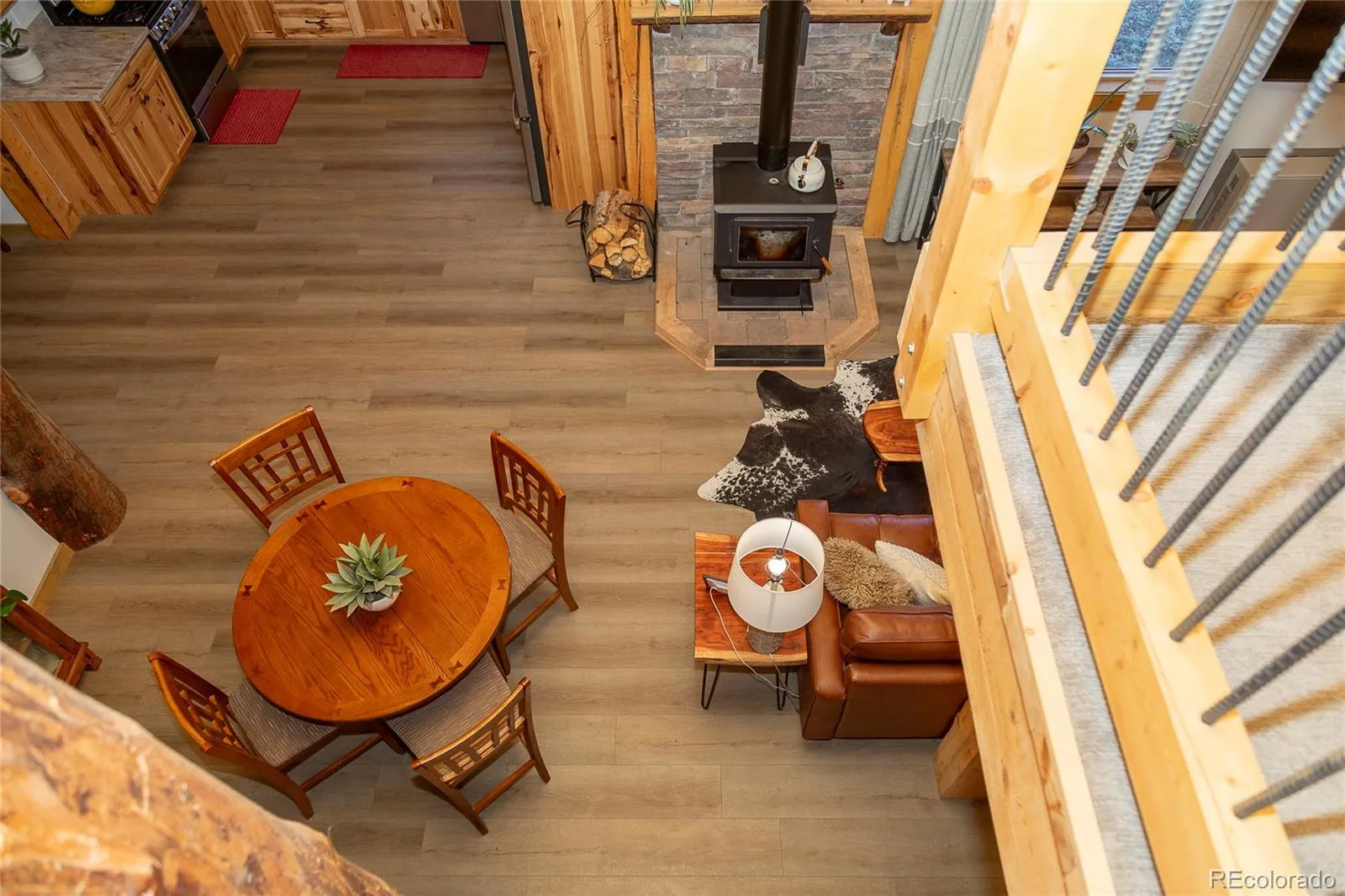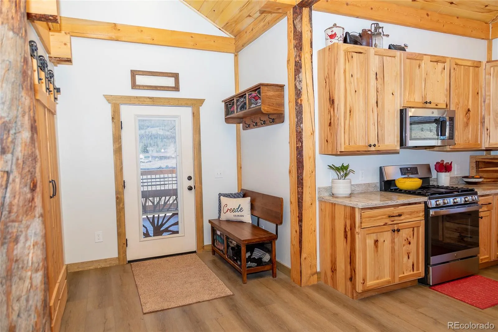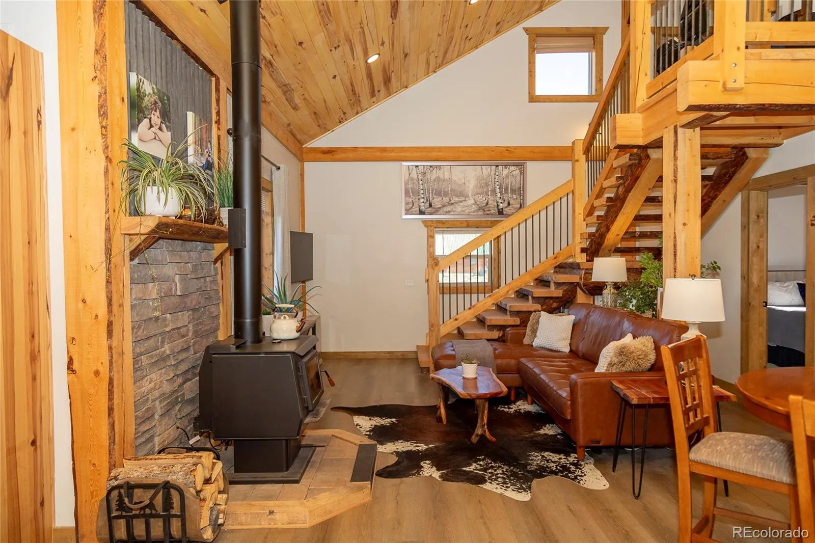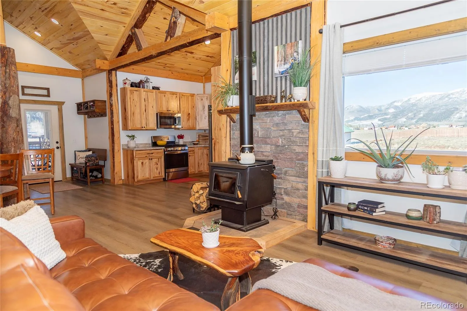 If you’re looking for a well-built mountain home with a true cabin feel, this one deserves a look. Quality craftsmanship shows throughout with tongue-and-groove ceilings, iron accents, and a solid wood staircase, along with hickory kitchen cabinets and locally sourced wood beams that add warmth. The living area centers around a charming wood-burning stove set against a stone hearth, creating a natural gathering space.
