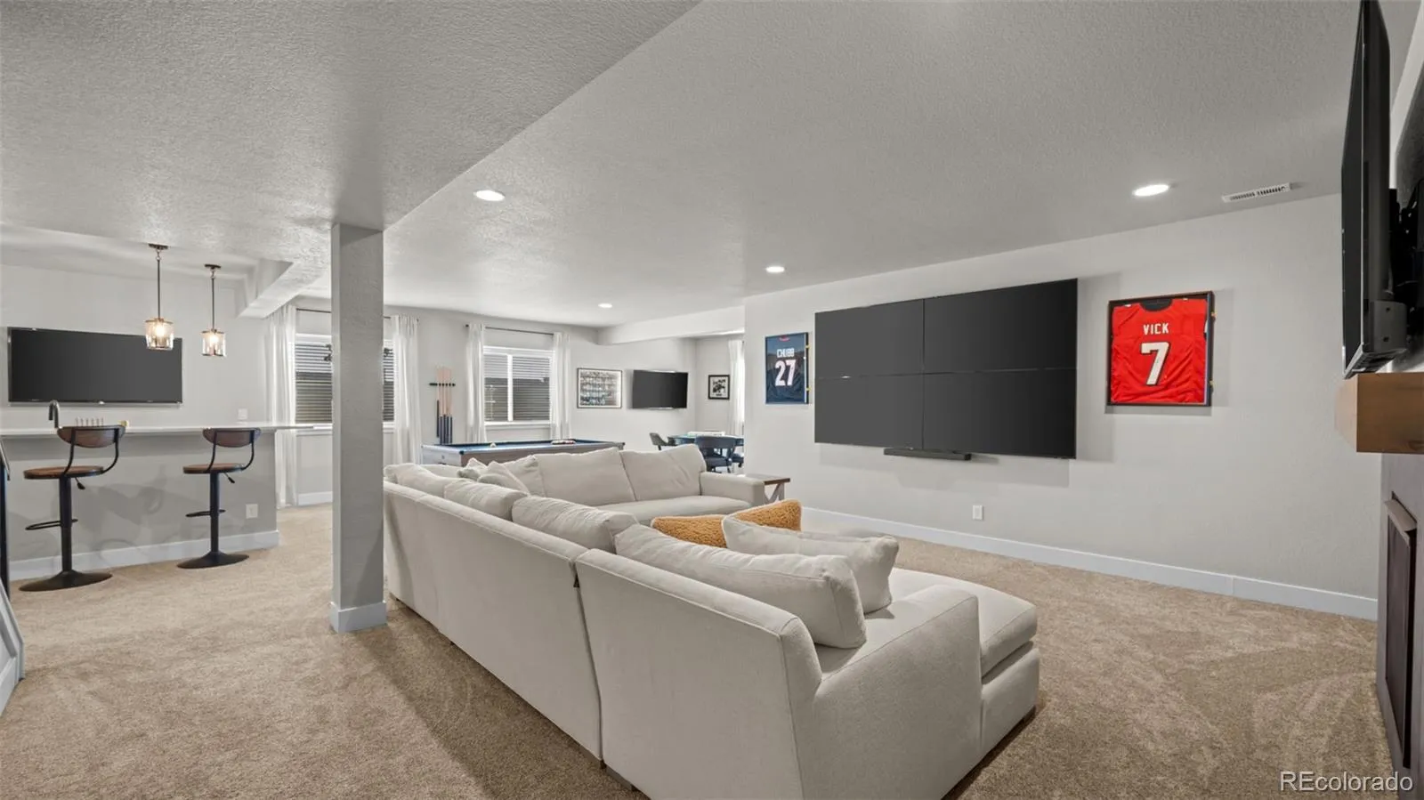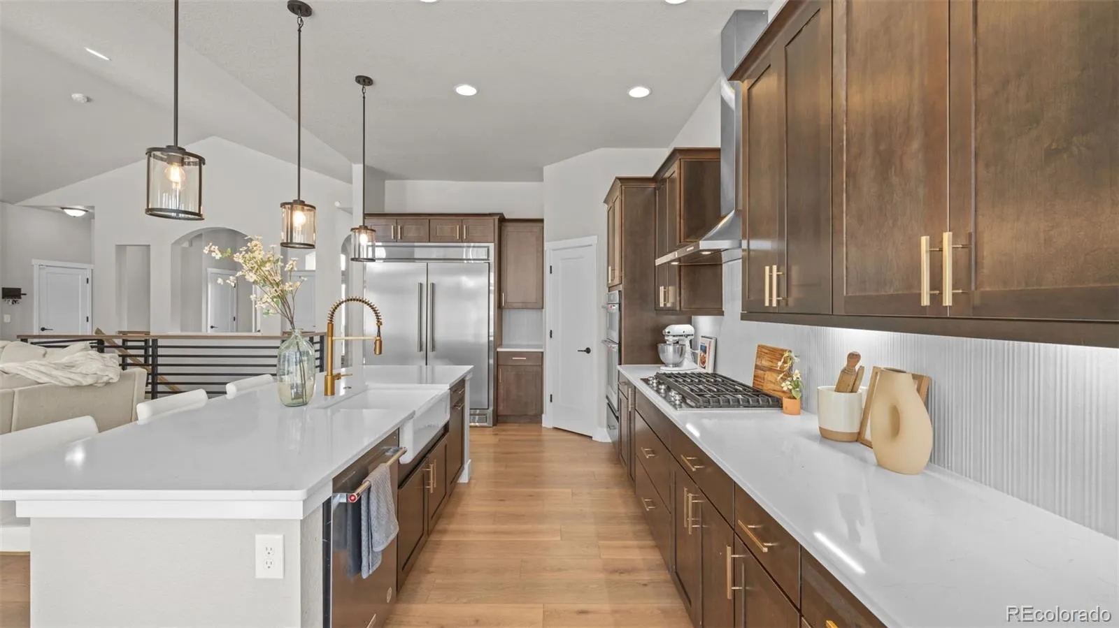 Located in the highly sought-after Flying Horse community, this stunning ranch-style home offers luxury, functionality, and thoughtful custom upgrades throughout. Featuring 5 bedrooms, 4 bathrooms, and over 4,000 finished square feet, this home blends modern design with elevated finishes. The main level showcases an open-concept layout with vaulted ceilings, a gas fireplace, and abundant natural light. The gourmet kitchen is equipped with quartz countertops, a large island, gas cooking, and a walk-out dining area, along with a custom oversized refrigerator framed by built-in cabinetry for a seamless, high-end look. The primary suite offers a spacious retreat with a 5-piece bath and walk-in closet, while a secondary main-level bedroom and dedicated office provide flexibility. The finished basement is designed for entertaining, featuring a custom wet bar with built-in shelving, expansive rec space, and a 110-inch movie wall. The lower level includes three additional bedrooms—two with adjoining baths and walk-in closets, plus a third bedroom with its own walk-in closet. Built-ins around both the upstairs and downstairs fireplaces add style and functionality, while a custom black metal safety gate enhances the stairway. The fully upgraded garage is a standout feature, offering insulated and fully finished walls, epoxy floors, heater with thermostat, 220V EV outlet, wall-mounted power washer, and a full dog wash station with hot and cold water—a rare and highly functional space. Situated on a corner cul-de-sac lot, the home also includes a covered patio and access to Flying Horse’s premier amenities, including golf, pools, fitness center, clubhouse, and more. This home offers a rare combination of luxury finishes, custom upgrades, and an unbeatable location.