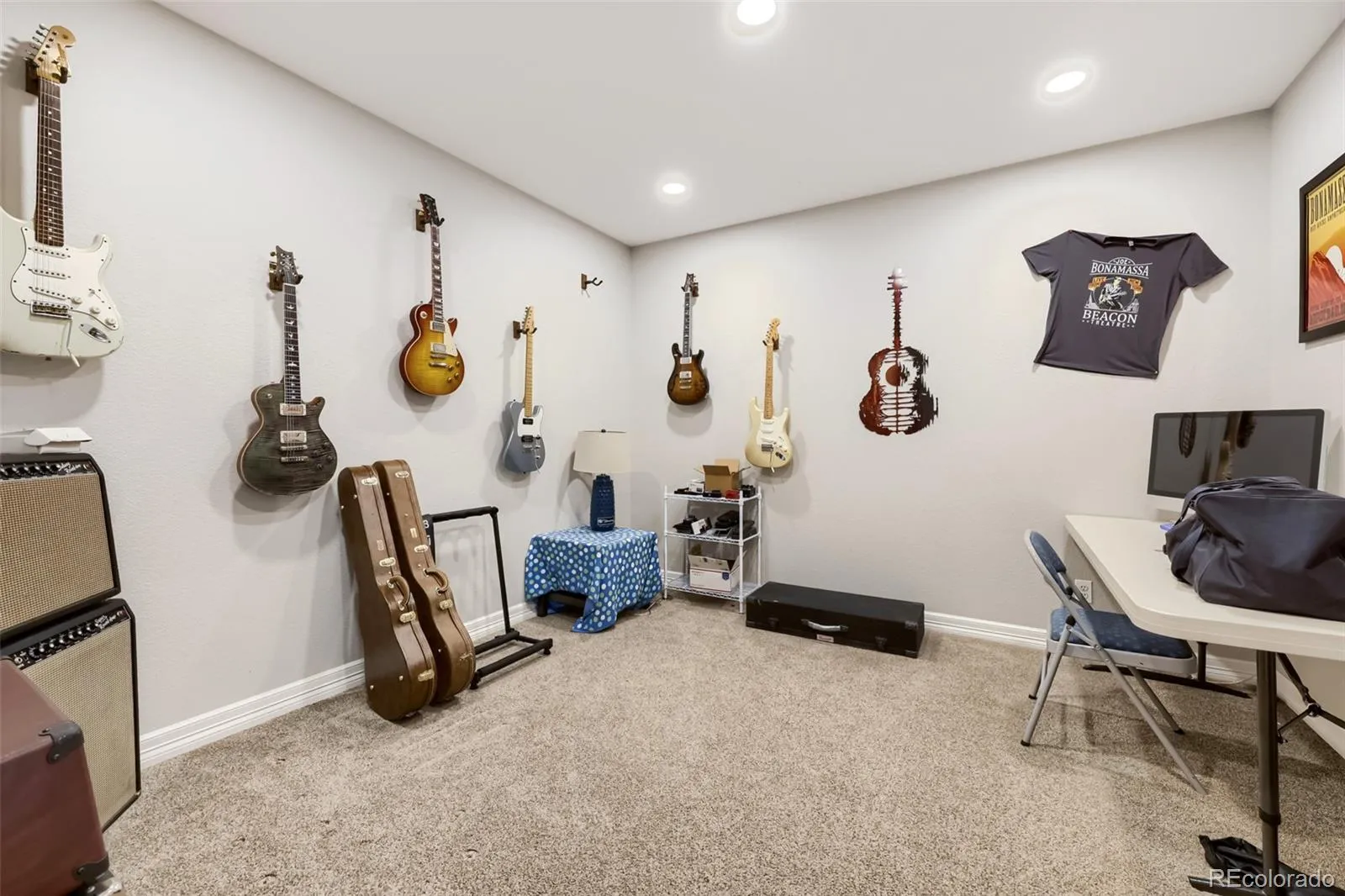 The garden-level basement is fully finished with an open, airy feel and includes an additional bedroom, a gym (or optional second bedroom, as both feature walk-in closets), a versatile bonus room currently used as a music room (originally designed as a wine room), and a large storage area.