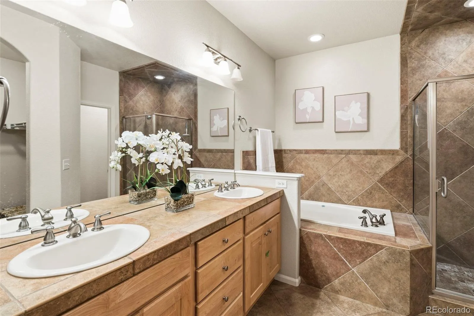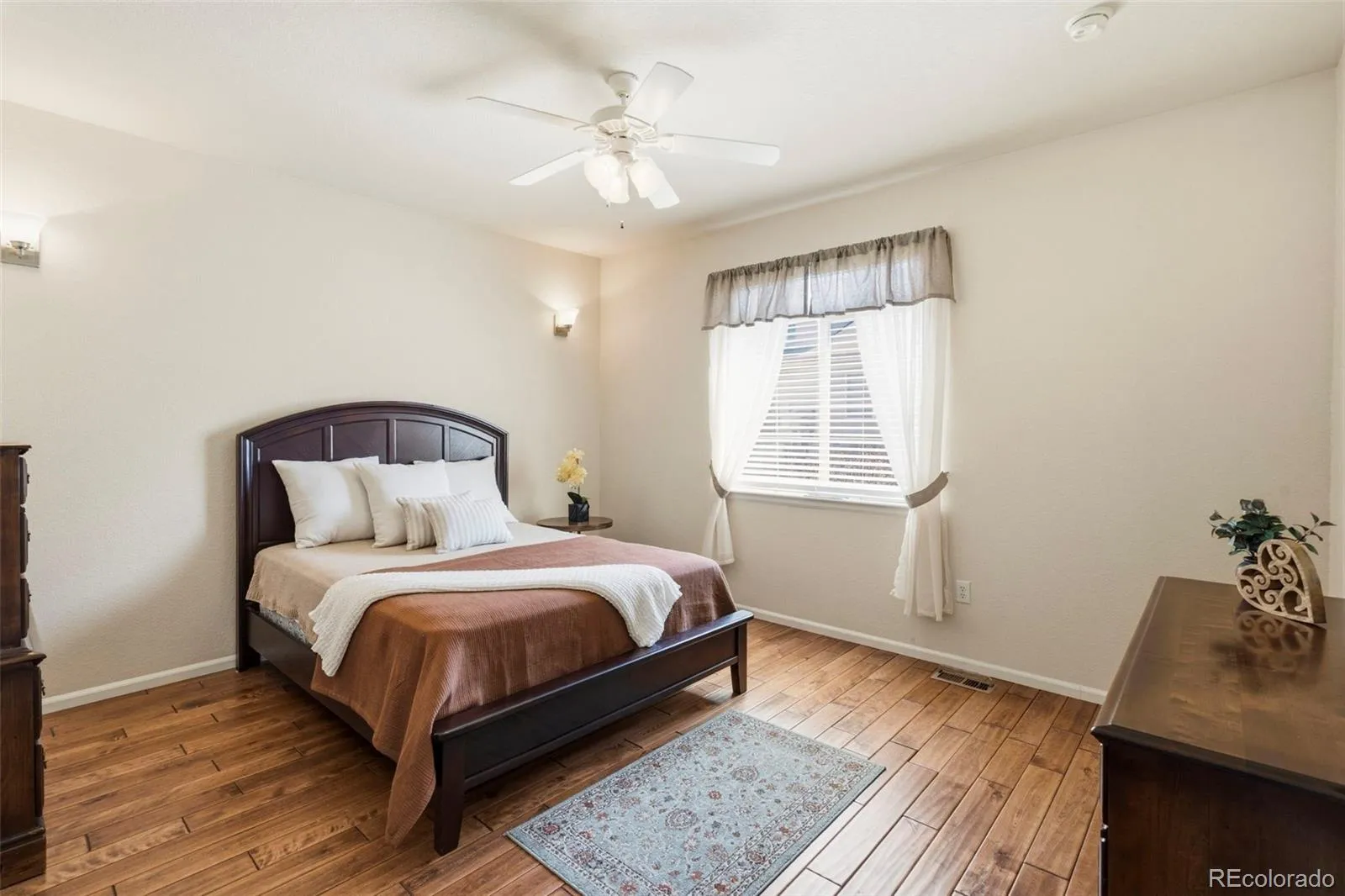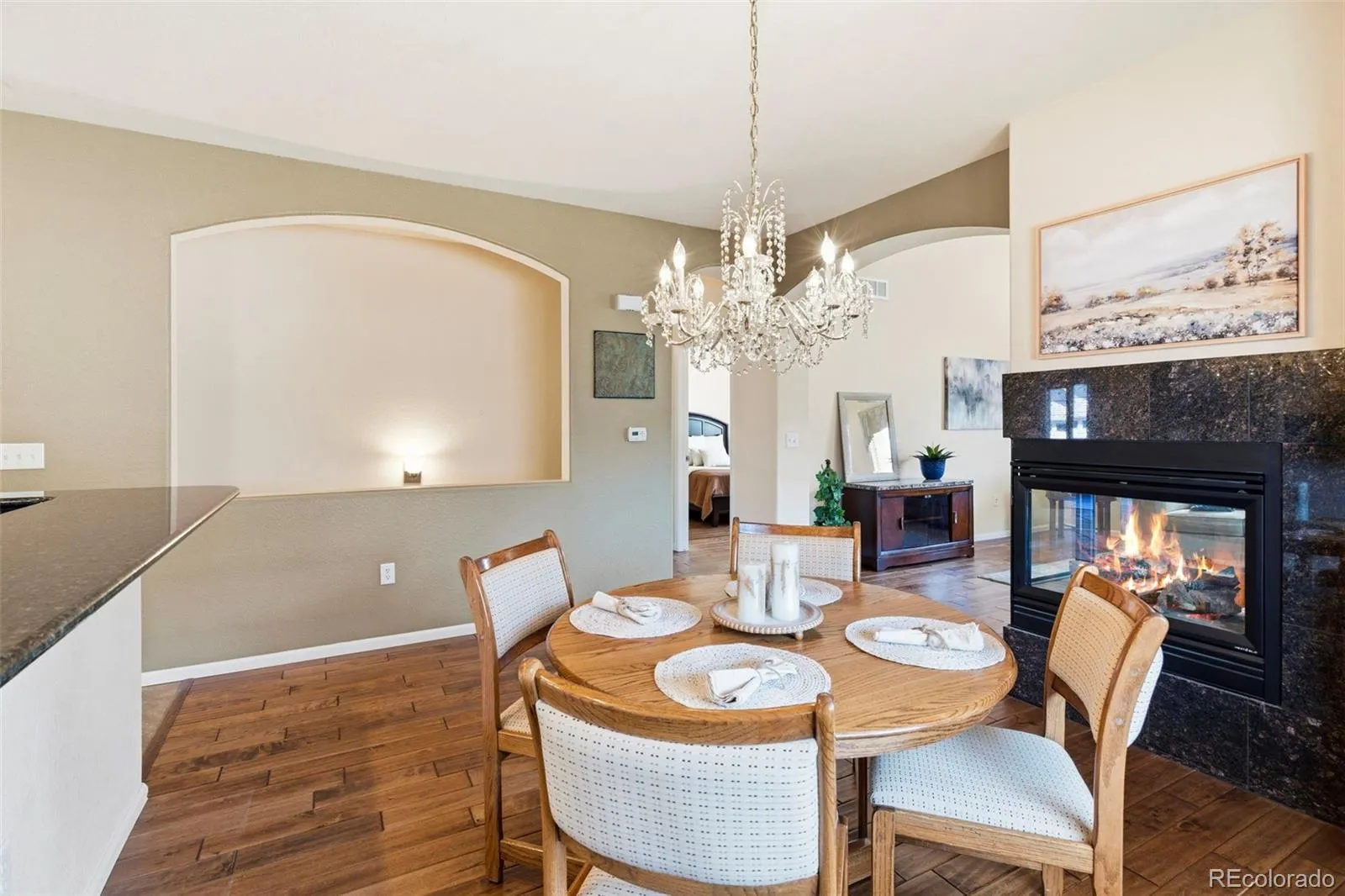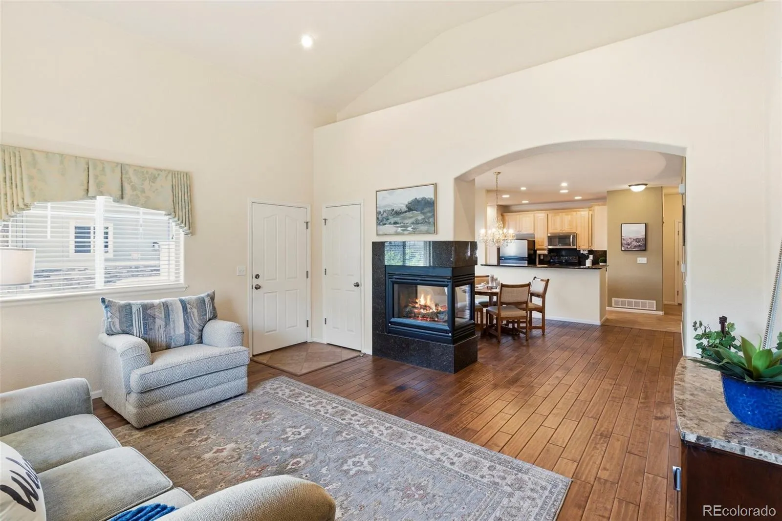 Luxury Ranch-Style Townhome near Buffalo Run Golf Course! This beautifully maintained home offers an open and inviting floor plan with rich hardwood flooring, vaulted ceiling in the living room and 9 foot ceilings throughout. The spacious living room features a stunning three-way fireplace that seamlessly connects to the dining area, creating the perfect space for entertaining. The open kitchen is well-appointed with granite countertops, a stylish backsplash, 36-inch maple cabinets, a large pantry, and oversized tile flooring, with easy access to the outdoor patio. The main level includes a generous primary suite with a walk-in closet and a luxurious five-piece bath, along with a second bedroom, a full bathroom, and convenient main-floor laundry. The finished basement expands your living space with a large family room complete with a wet bar, a third bedroom with a walk-in closet, and a second laundry room featuring a sink and built-in cabinetry. Offering exceptional value, this home combines comfort, functionality, and upscale finishes. Conveniently located with easy access to I-76, Denver International Airport (DIA), and E-470. Schedule your showing today!
