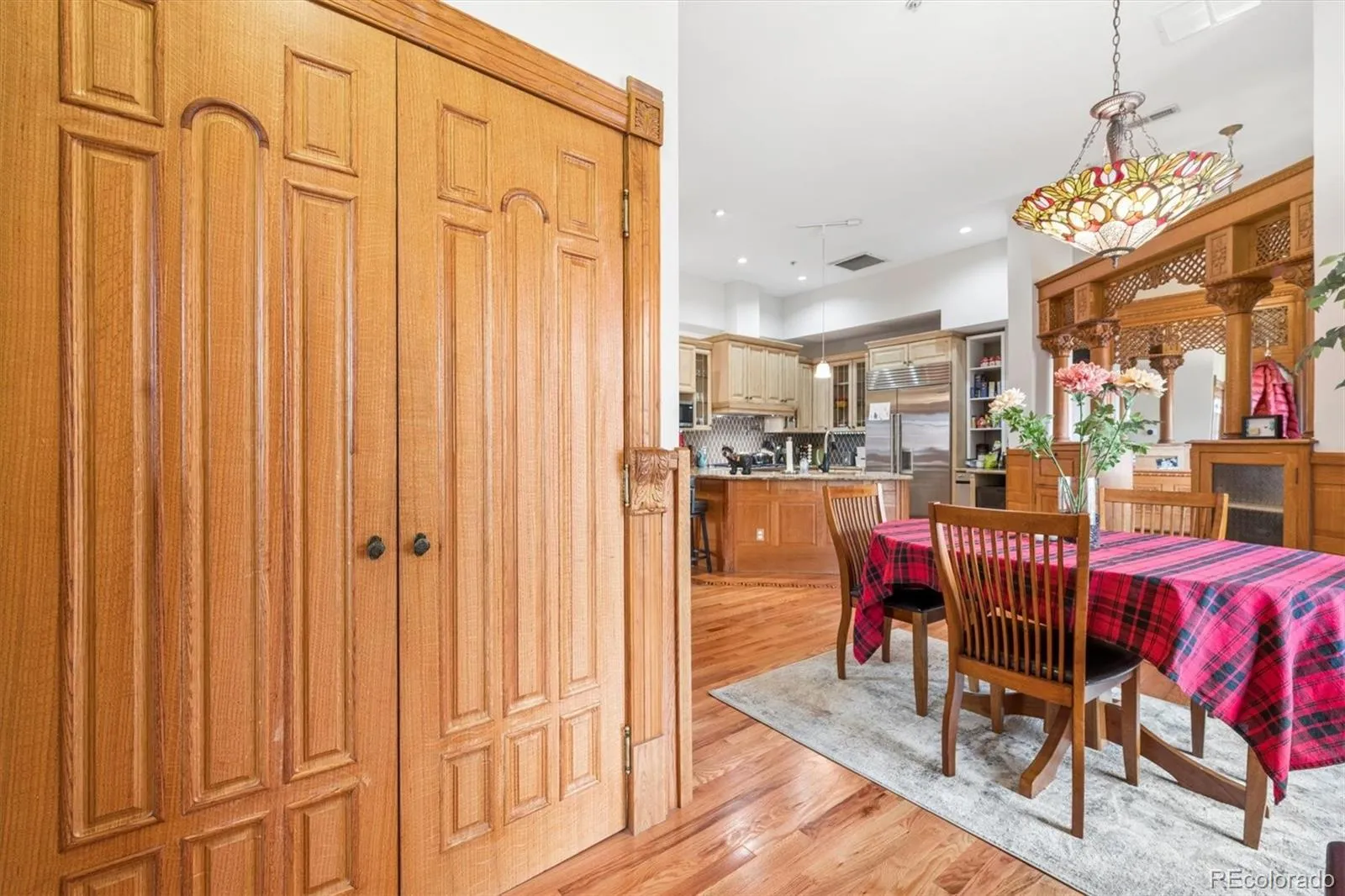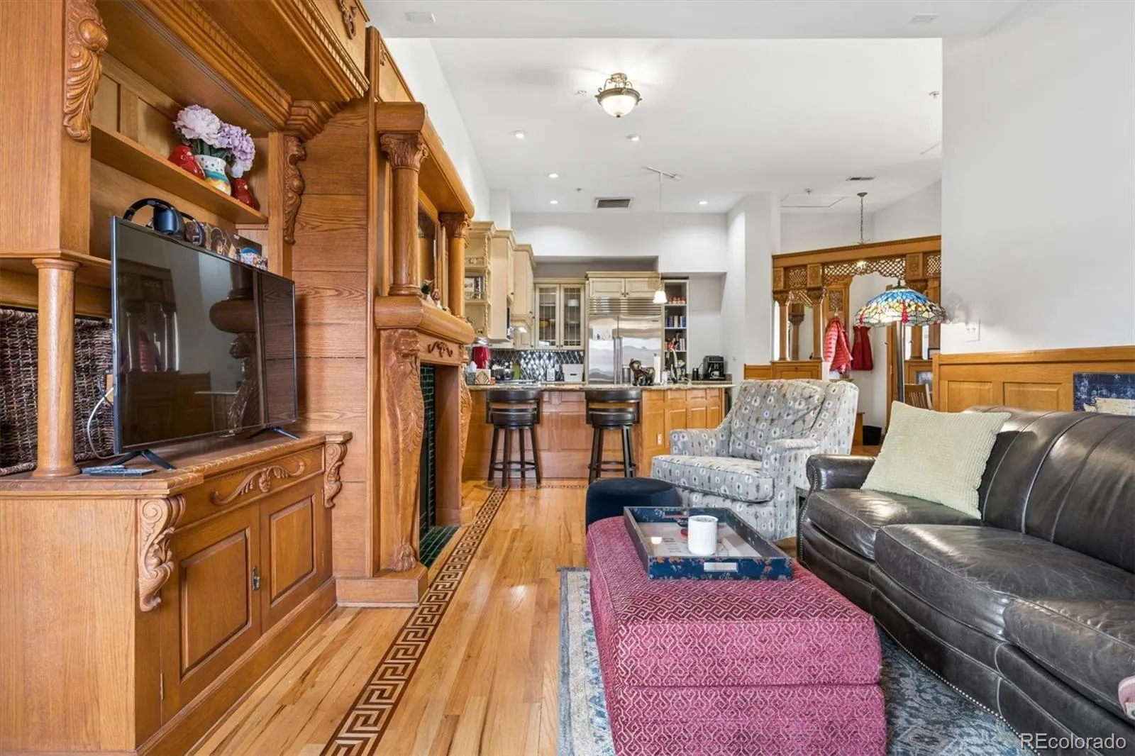 Hardwood floors with custom wood inlays, hand-carved wood built-ins from India, a tankless water heater, complete this exceptional two-bedroom, two-bath home.