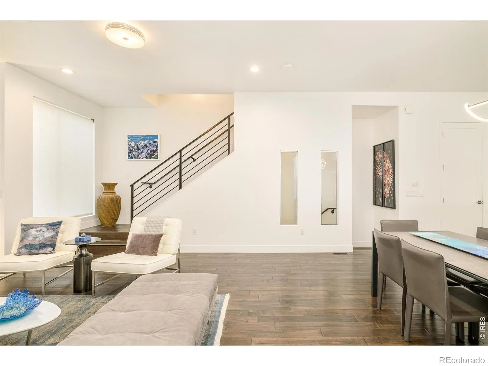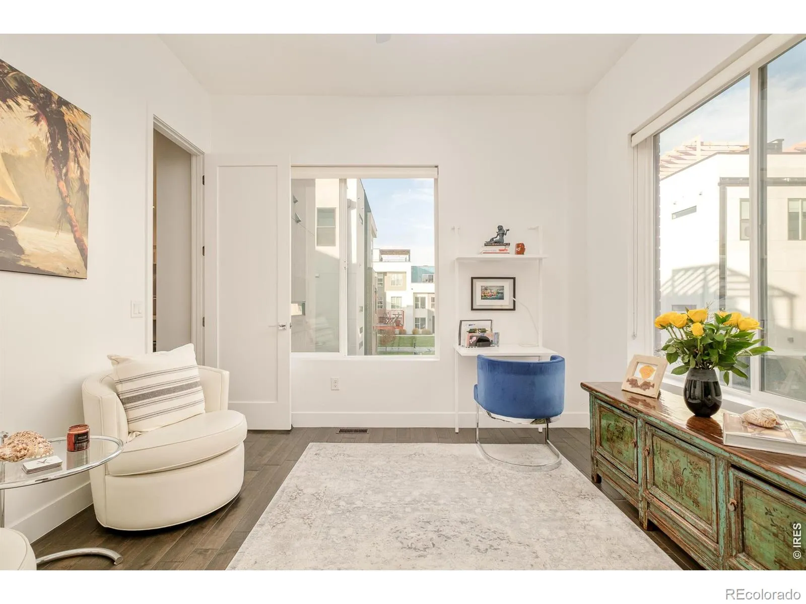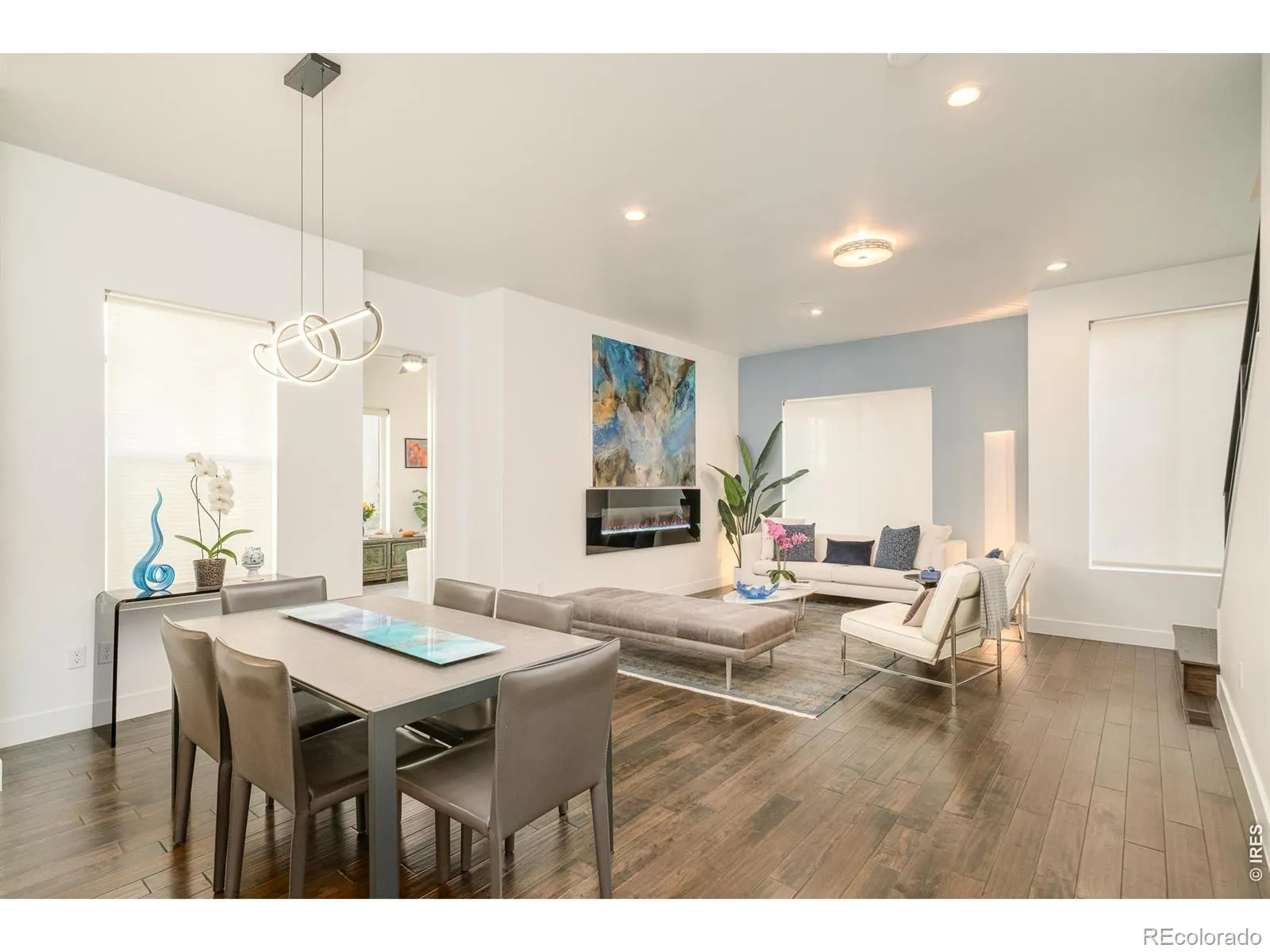 This immaculate end unit tells a story of light, space, and sweeping mountain views. Four en-suite bedrooms, five baths, and a floor plan wider than most-designed for the way you actually live. The entry level welcomes you with a versatile bedroom or den featuring an electric fireplace, wet bar, walk-in closet, and direct access to a generous 10×15 patio. Upstairs, the main level unfolds into an open great room where the kitchen takes center stage: a 64″ double-wide refrigerator, high-gloss cabinetry, quartz countertops, and a 36″ Italian range that commands attention. Dining and living spaces flow effortlessly, accented by designer lighting and a statement fireplace. A sun-drenched ensuite bedroom-ideal as a home office-completes this level. The top residential floor is home to the primary suite, a private sanctuary with balcony, walk-in closet with custom built-ins, and a spa-inspired bath finished in marble tile. A guest suite and laundry round out the level. Throughout, you’ll find hardwood floors and Level 4 hand-trowel wall finishes-details that elevate the everyday. Crowning it all, a rooftop deck offers sweeping mountain views and space to entertain or simply breathe, prepped for a hot tub and built for Colorado living. An attached two-car garage with epoxy flooring and storage cabinets completes the home. In close proximity to City Park, City Park Golf Course, Denver Zoo and RINO with fabulous local amenities, this is modern Denver at its finest. The home is awesome as a primary residence and is an easy lock-and-leave option for those who travel on a regular basis. Buyer to verify square footage and schools. Furniture is negotiable.