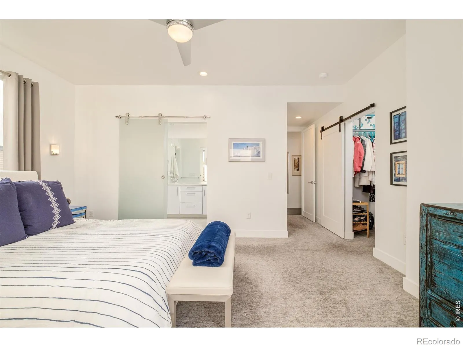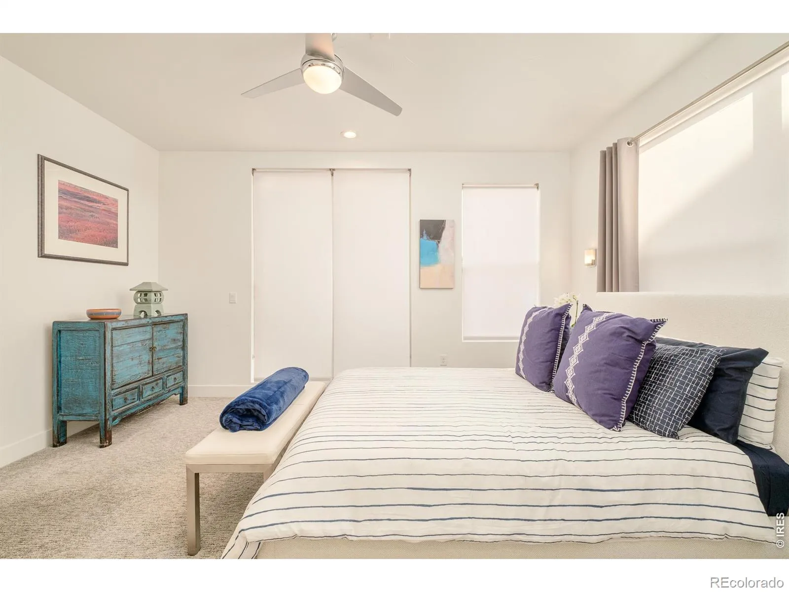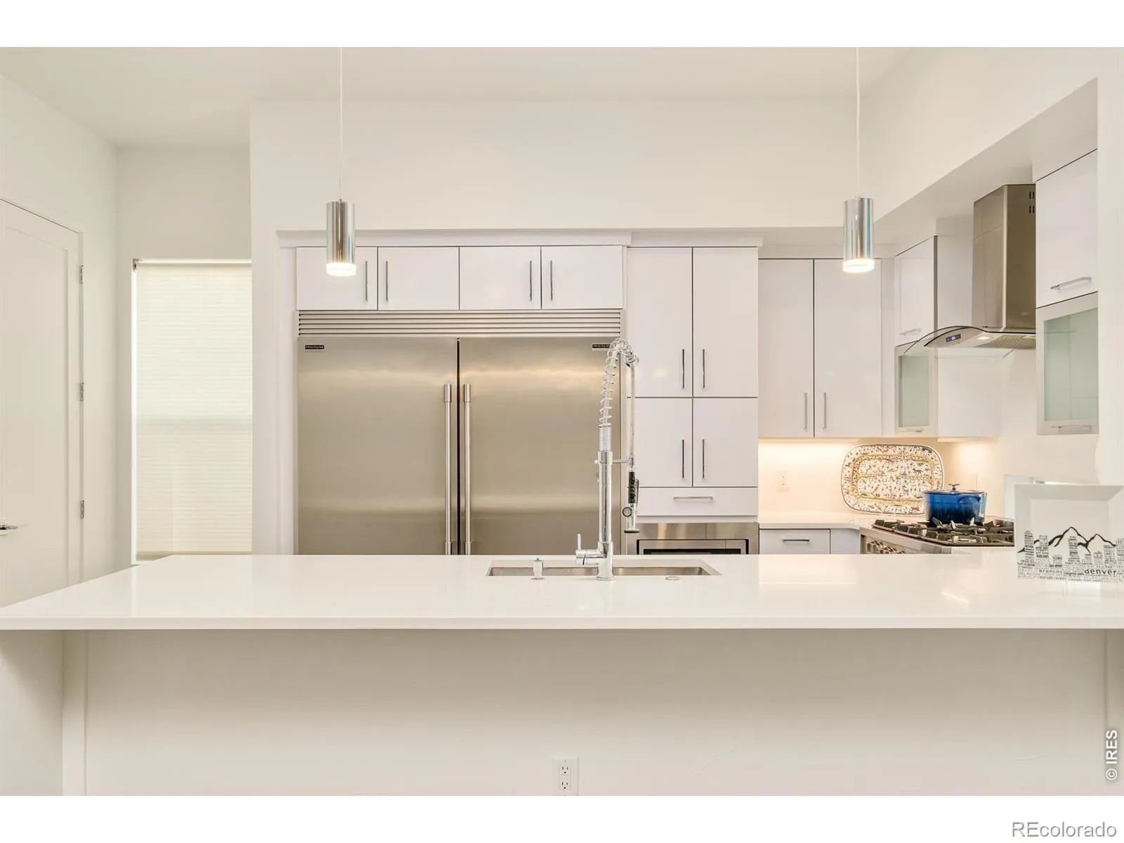 This immaculate end unit tells a story of light, space, and sweeping mountain views. Four en-suite bedrooms, five baths, and a floor plan wider than most-designed for the way you actually live. The entry level welcomes you with a versatile bedroom or den featuring an electric fireplace, wet bar, walk-in closet, and direct access to a generous 10×15 patio. Upstairs, the main level unfolds into an open great room where the kitchen takes center stage: a 64″ double-wide refrigerator, high-gloss cabinetry, quartz countertops, and a 36″ Italian range that commands attention. Dining and living spaces flow effortlessly, accented by designer lighting and a statement fireplace. A sun-drenched ensuite bedroom-ideal as a home office-completes this level. The top residential floor is home to the primary suite, a private sanctuary with balcony, walk-in closet with custom built-ins, and a spa-inspired bath finished in marble tile. A guest suite and laundry round out the level. Throughout, you’ll find hardwood floors and Level 4 hand-trowel wall finishes-details that elevate the everyday. Crowning it all, a rooftop deck offers sweeping mountain views and space to entertain or simply breathe, prepped for a hot tub and built for Colorado living. An attached two-car garage with epoxy flooring and storage cabinets completes the home. In close proximity to City Park, City Park Golf Course, Denver Zoo and RINO with fabulous local amenities, this is modern Denver at its finest. The home is awesome as a primary residence and is an easy lock-and-leave option for those who travel on a regular basis. Buyer to verify square footage and schools. Furniture is negotiable.