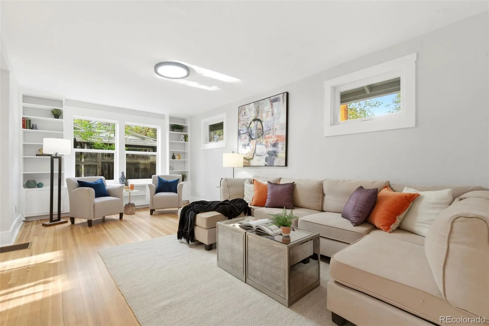 Inside, an open living space with original hardwood floors is anchored by a cozy built-in bookcase. The updated kitchen features quartz countertops with breakfast bar, modern cabinetry, and stainless steel appliances, flowing seamlessly into the dining area—ideal for everyday living and entertaining.