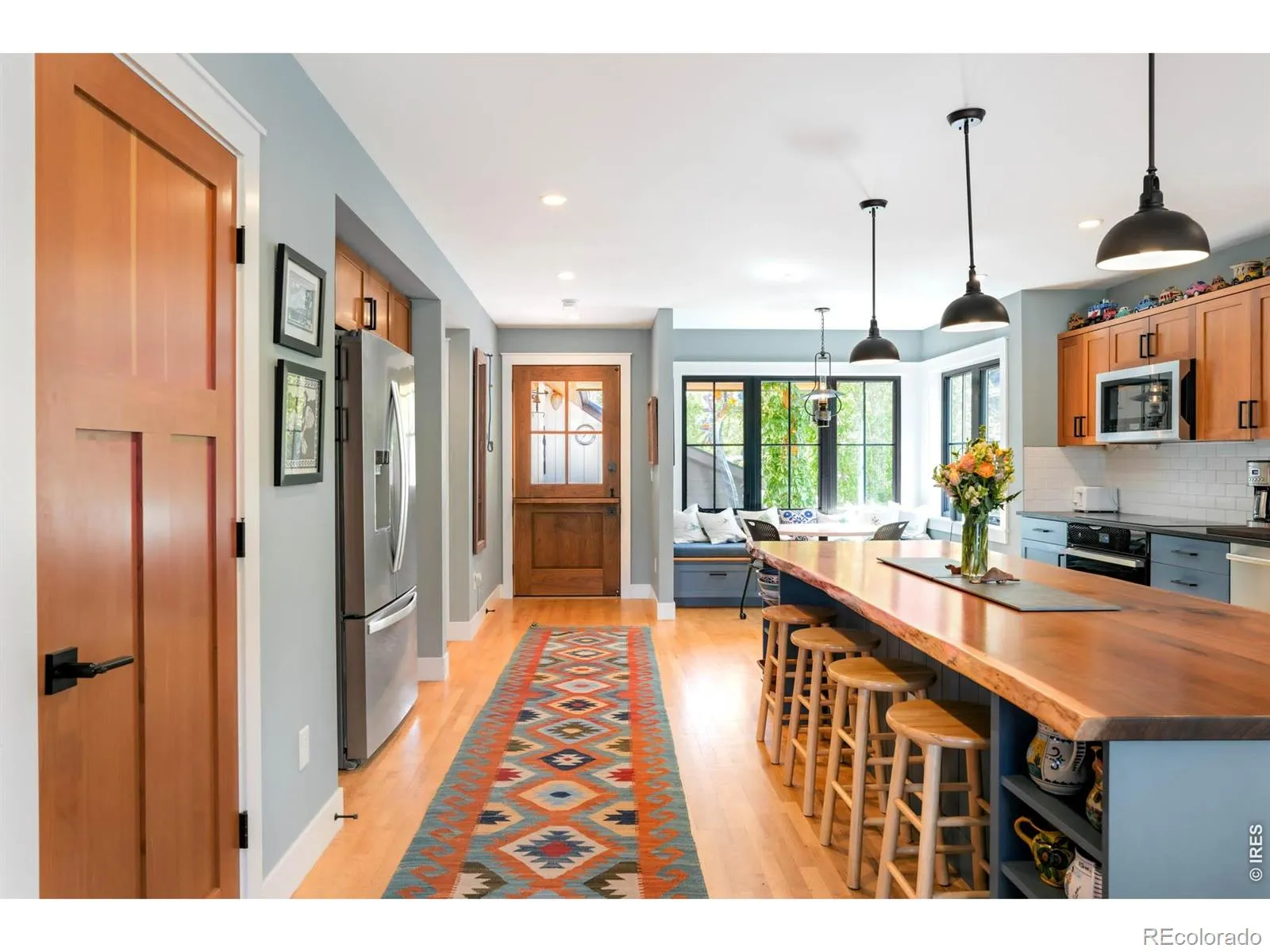 This architect-designed modern farmhouse offers a rare blend of privacy, income potential and iconic Boulder views in the heart of University Hill. Thoughtfully reconstructed and set back from the street, this home backs to protected Open Space and Mountain Parks land, ensuring unobstructed vistas of the Flatirons and foothills. A white board-and-batten exterior with black trim is complemented by mature landscaping, a gated, arched entryway to a flagstone walkway and a custom sculpture. A covered front patio introduces interiors defined by an open main level with quarter-sawn oak floors. The chef’s kitchen features a live-edge walnut island, induction range and custom cabinetry, flowing into a vaulted living space and dining area opening to a flagstone patio. The upper-level primary suite boasts a private west-facing balcony, five-piece bath and dual walk-in closets, while a dedicated office with built-ins captures mountain views. A lower-level licensed ADU with a private entry offers rental income or multigenerational flexibility. With PV solar, all-electric efficiency and proximity to Pearl Street and CU Boulder, this home defines elevated living in Boulder.
