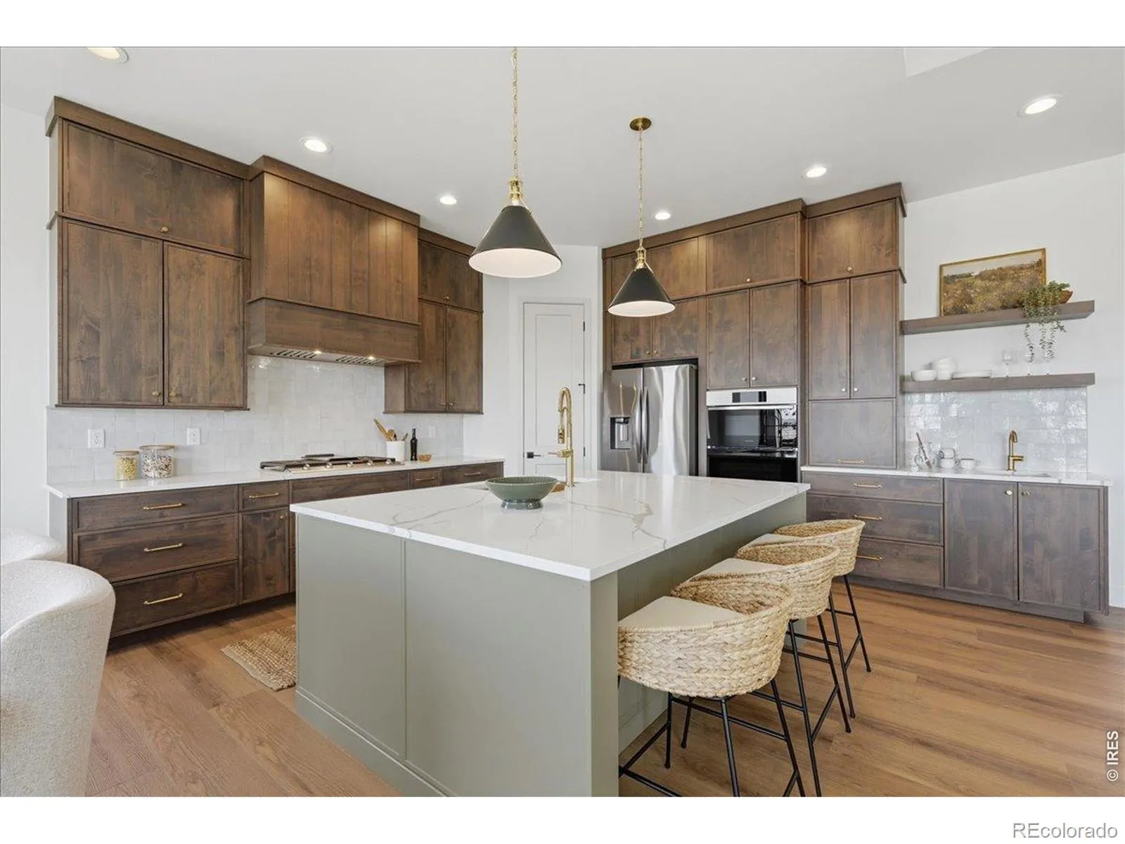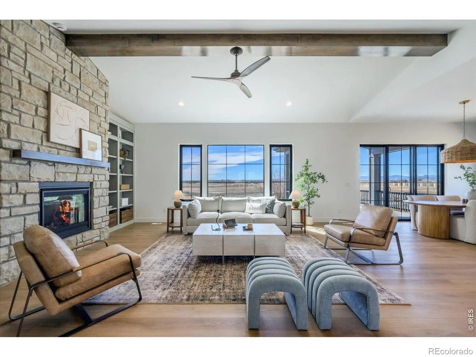 This custom-designed ranch-style home sits on a premium south-facing garden-level lot in Greenspire at Windsor Lake, backing to a greenbelt with added privacy and mountain views from the covered patio. With close proximity to Windsor Lake, downtown Windsor, and community events, the location offers an easy connection to both outdoor living and everyday convenience. Inside, double front doors open to a dramatic 16-foot entry, where vaulted ceilings with exposed beams and expansive windows create a bright, open feel from the moment you walk in. The main living area is designed for both comfort and function, anchored by a stone-wrapped fireplace and custom floor-to-ceiling built-ins that add warmth, character, and practical storage. The kitchen is a standout feature, thoughtfully designed with rich brown cabinetry, quartz countertops, gold fixtures, an oversized island, and a secondary prep sink. Whether you are hosting friends, gathering for holidays, or just moving through a normal weeknight, the layout works beautifully for both entertaining and everyday life. Privately tucked away, the primary suite offers a true retreat with a spa-like bath that includes dual vanities, a freestanding soaking tub, and a walk-in shower. The garden-level basement is another major highlight, bringing in natural light that is rarely found in lower-level living spaces. It offers a spacious recreation room, wet bar, two additional bedrooms, a full bath, and a dedicated theater room, giving the home flexibility for guests, entertaining, or relaxing at home.An oversized 3-car garage with a half tandem bay provides plenty of room for storage, hobbies, and outdoor gear. Landscaping and fencing are already included, creating a move-in ready experience inside and out. This is a rare opportunity to enjoy thoughtful design, natural light on every level, privacy, views, and one of Windsor’s most desirable communities.