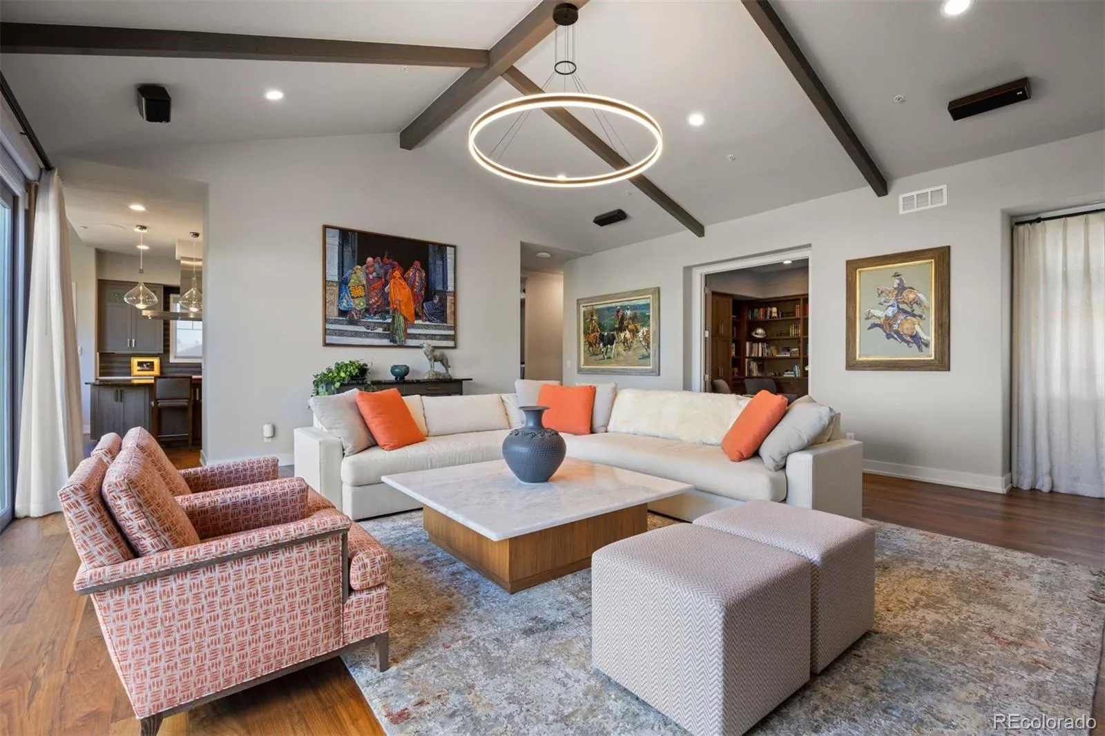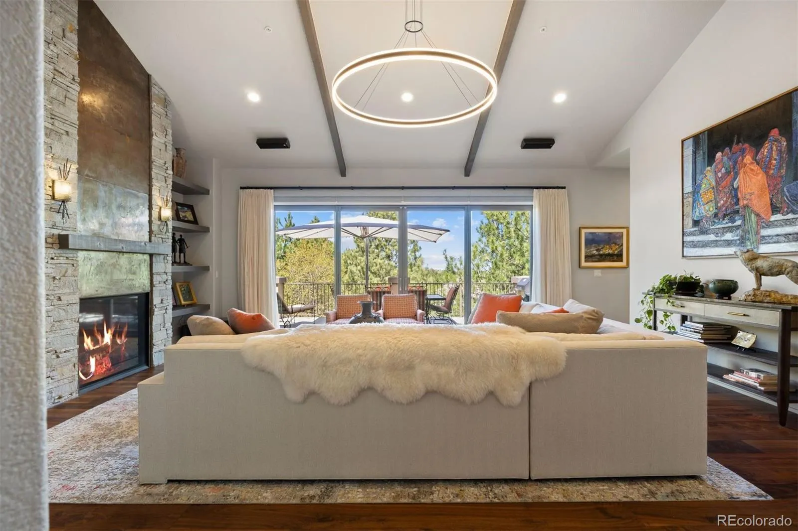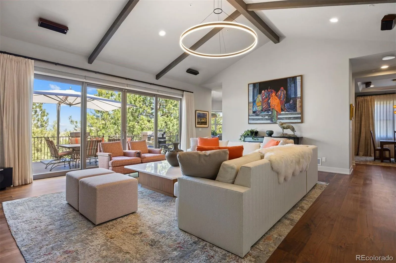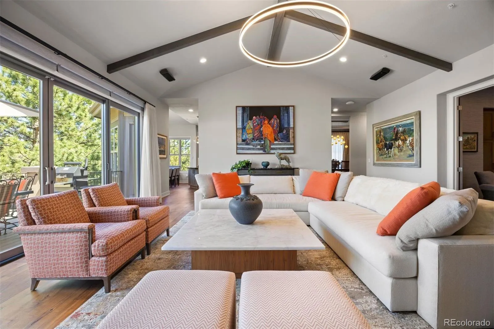 Completely reimagined and meticulously updated, this exceptional residence in The Village at Castle Pines showcases remarkable quality, craftsmanship, and sophisticated design at every turn. Every surface has been thoughtfully transformed with top-of-the-line finishes, creating a home that feels both luxurious and inviting, with light-filled spaces and timeless style throughout. The main level is designed for effortless living and entertaining, featuring stunning walnut floors, soaring cathedral ceilings with architectural beams, and expansive windows and sliding glass doors that open to a private deck with glimpses of mountain views and serene pine tree surroundings. The beautifully appointed kitchen is truly the heart of the home, offering premium appliances, custom cabinetry, and an inviting dining area perfectly suited for both everyday living and memorable gatherings. A richly appointed executive-style office, elegant dining room, and well-designed mudroom and laundry area add both comfort and functionality. The main-floor primary suite is a luxurious retreat, complete with a cozy fireplace, bay window, spa-inspired bath, and generous walk-in closets with custom built-ins. The fully finished lower level continues the home’s exceptional design, featuring high ceilings, a spacious family room with fireplace, and seamless indoor-outdoor living with direct access to a patio with dry below covering and beautifully private yard. A well-equipped entertaining bar, multiple guest bedrooms, and abundant storage provide flexibility for hosting family and friends. Situated on a quiet cul-de-sac with a three-car garage, this home offers a rare combination of refined elegance and everyday livability—all within the gated community of The Village at Castle Pines, known for its natural beauty, privacy, and premier amenities.