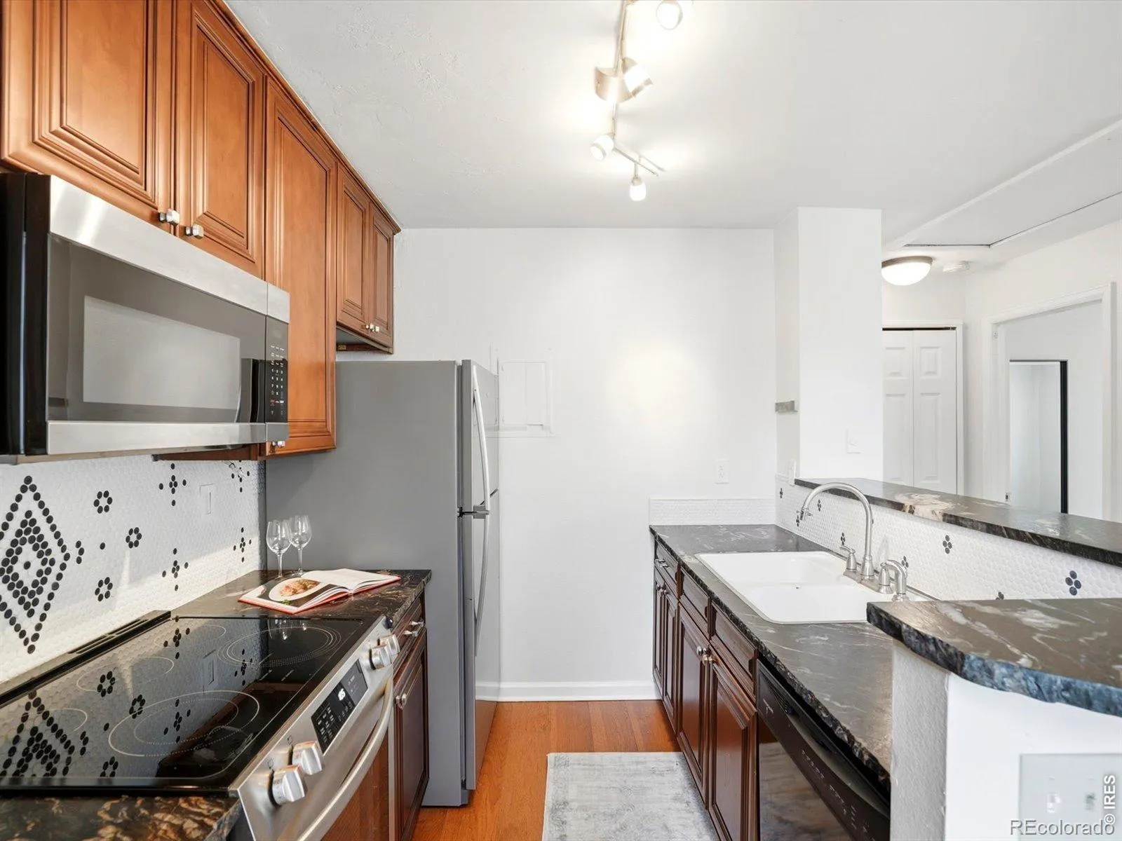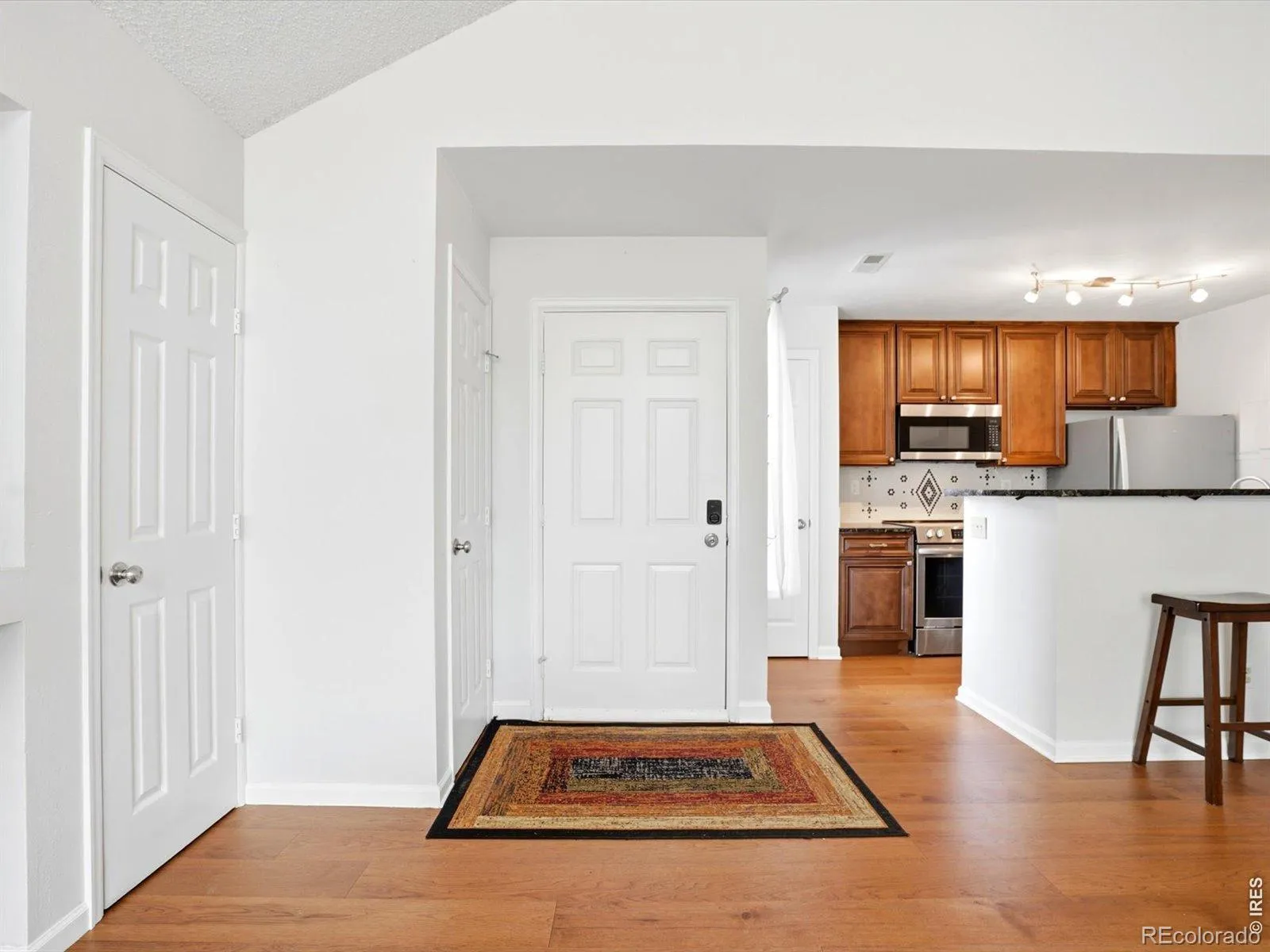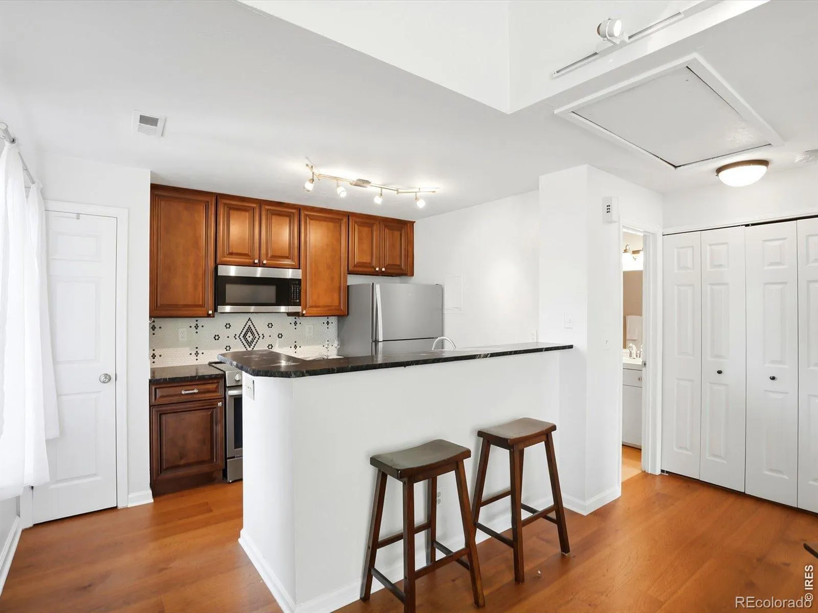 Top-floor, sunlit, and thoughtfully upgraded, this exceptional Powderhorn Condos one-bedroom, one-bath condo offers comfort, style, and an ideal Gunbarrel location. Soaring 20-foot vaulted ceilings in the main living area create dramatic volume and natural light, while engineered hickory hardwood floors, a cozy fireplace, and a private deck nestled among mature trees deliver warmth and charm rarely found in this price point.The fully renovated kitchen is a standout feature, designed with custom solid maple cabinetry extended to the ceiling, granite countertops with a hand-chiseled edge and leathered finish, premium stainless appliances, and a hand-laid penny tile backsplash that gives the space a true custom-home feel. Popcorn ceilings have been removed in both the kitchen and bedroom, enhancing the clean, modern aesthetic.The spacious bedroom includes new carpet and a ceiling fan, while the updated bathroom and fresh interior paint make this home move-in ready. Additional value includes a newer water heater and top-floor privacy. Residents of Powderhorn enjoy beautifully maintained grounds, access to a large private park, and HOA management focused on value, with recent dues reduced to $485/month. Conveniently located near everyday essentials including King Sooper, and popular dining destinations such as Avery Brewing Company, with quick access to trails, parks, downtown Boulder, Louisville, and Longmont. Ideal for first-time buyers, investors, or anyone seeking a move-in-ready Boulder condo with vaulted ceilings, updated finishes, and a private outdoor retreat in one of Gunbarrel’s most convenient communities.