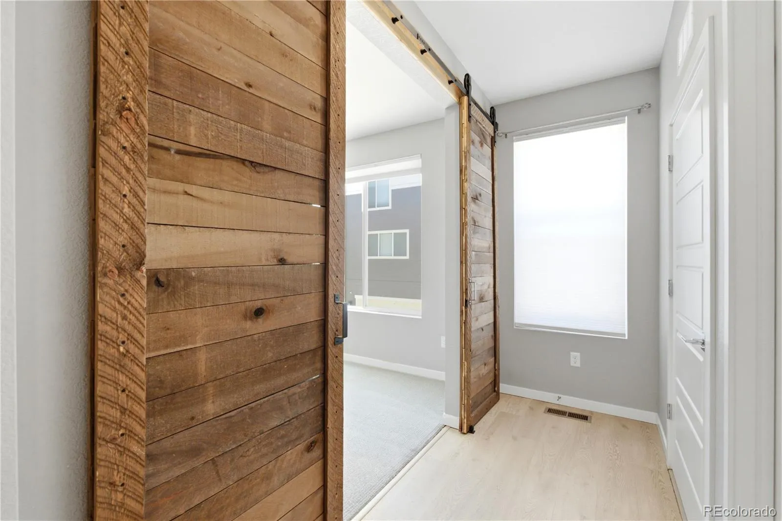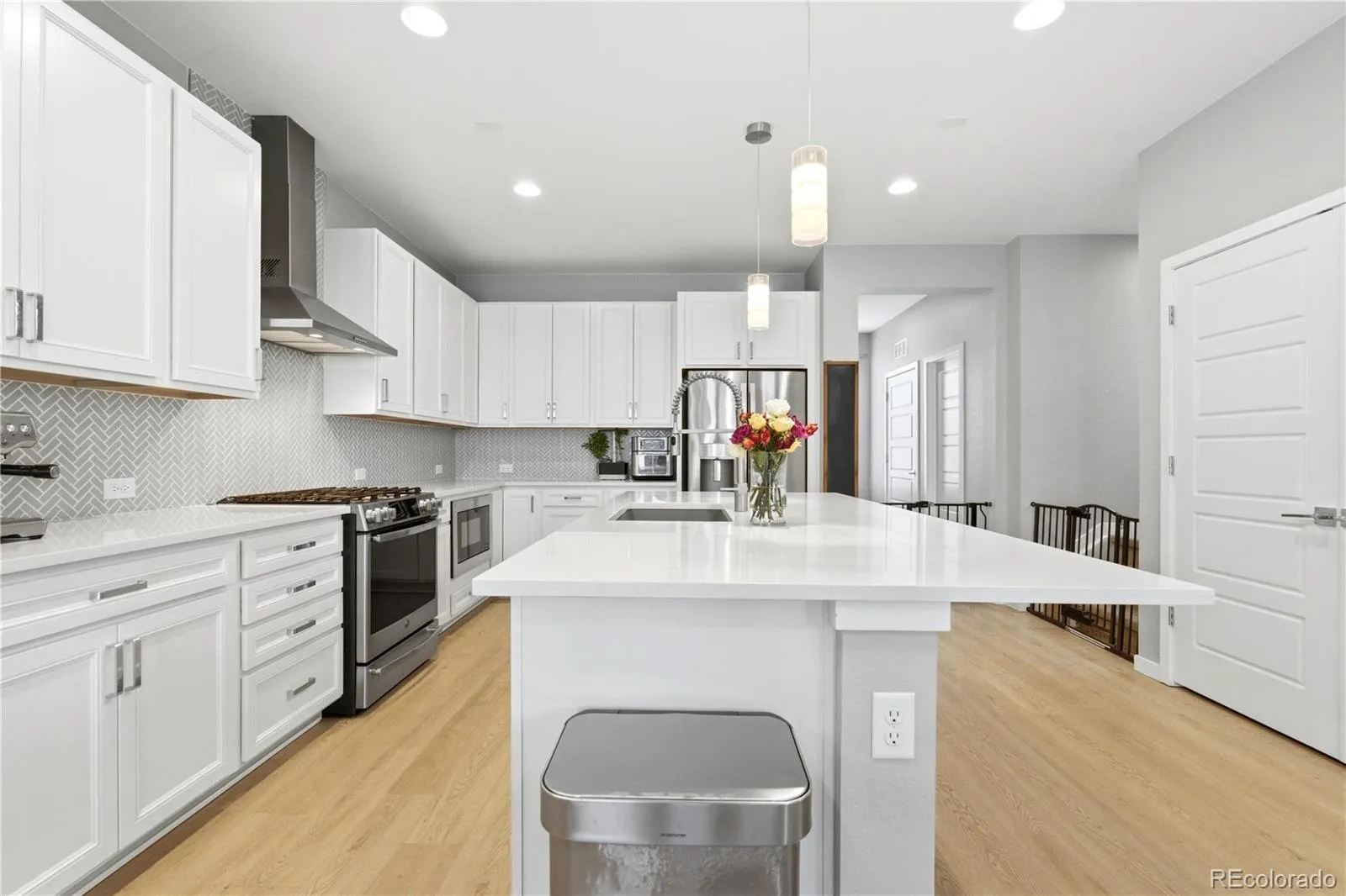 The main level impresses with a combined gourmet kitchen, dining area, and great room, all featuring high ceilings. The kitchen is outfitted with a designer GE Profile stainless-steel package, including a gas stove and hood, 42” tall cabinets, a full pantry, custom pulls, tile backsplash, quartz countertops, and an in-cabinet microwave oven. The great room provides ample space for entertaining and is pre-wired for surround sound. Additionally, the main floor includes a half bath, an oversized laundry closet, and a full-sized home office, currently used as an additional bedroom, with a custom barn door.