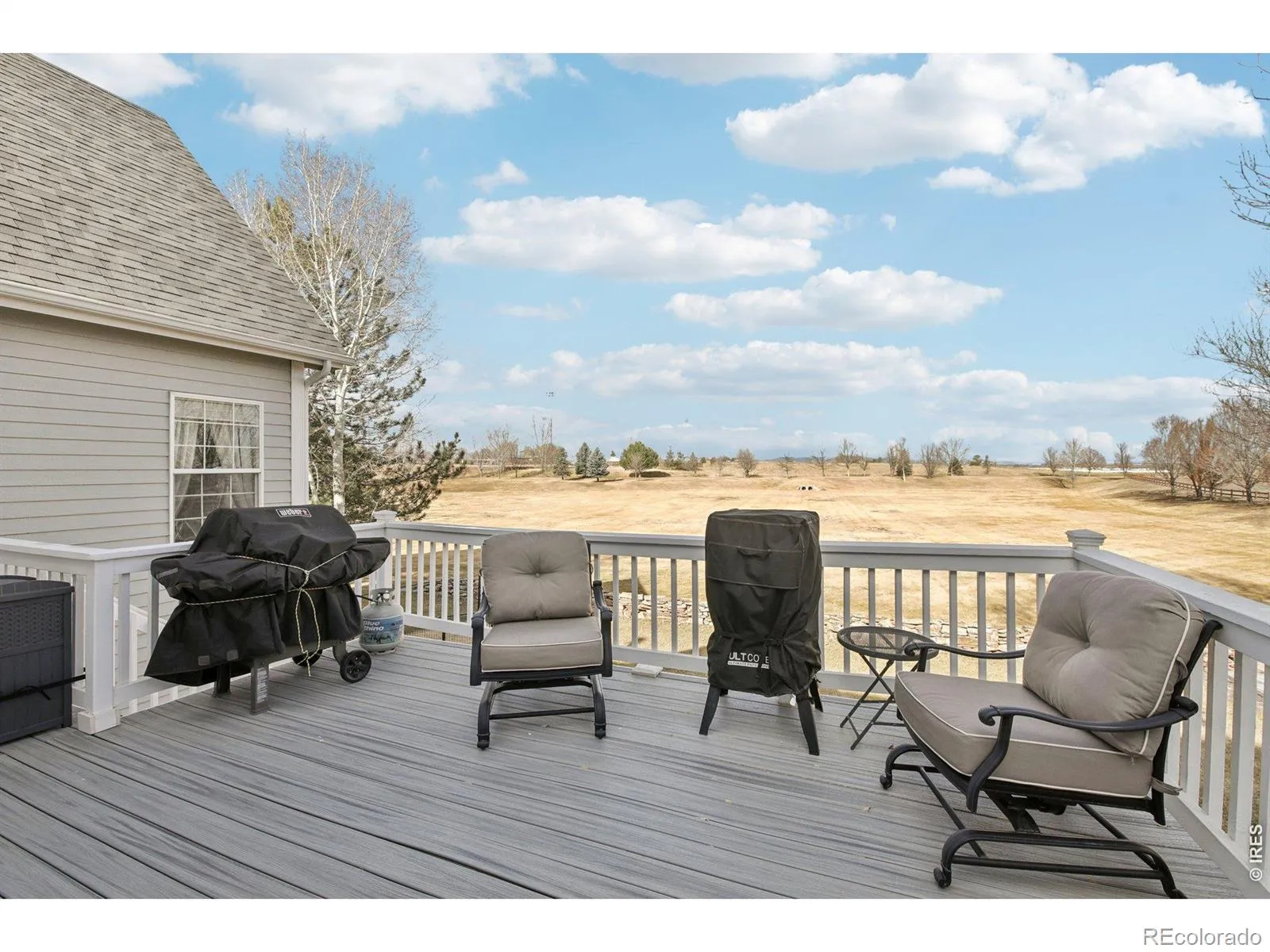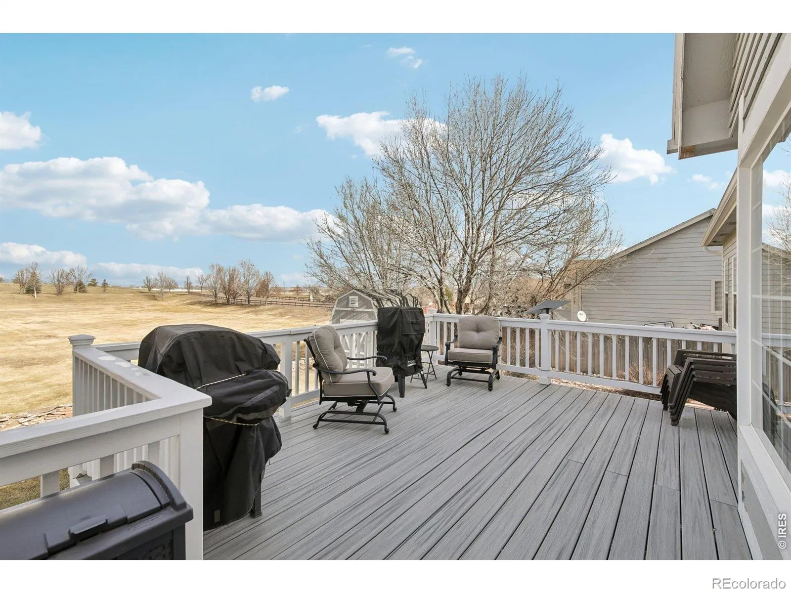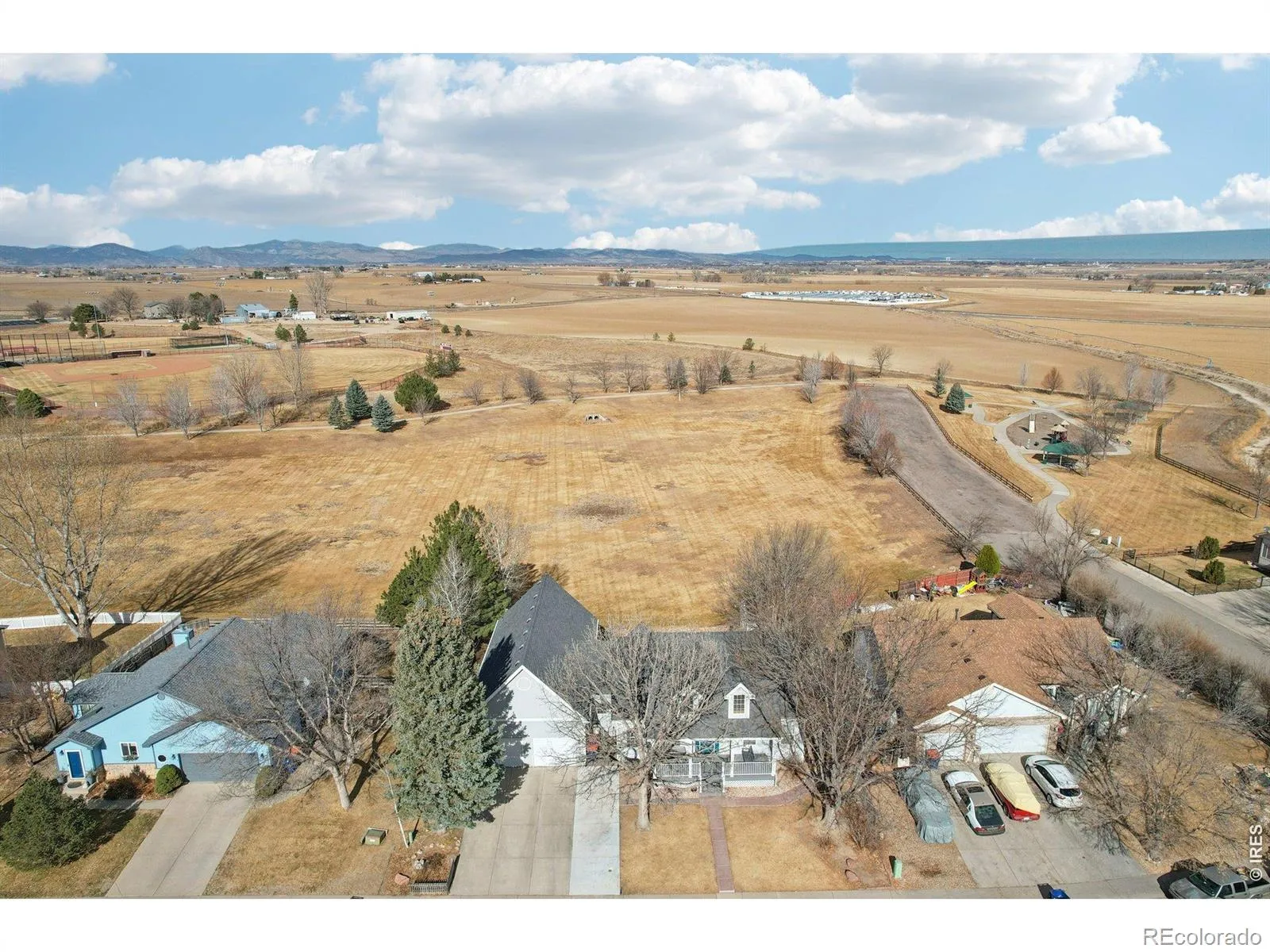 Ranch style home backing to protected greenspace, with mountain views, no HOA, no Metro District. Main floor primary bedroom plus additional large loft/bedroom above garage. Assumable VA loan, Seller will allow non-Veterans to assume loan. Designed for both comfort & flexibility, the home offers bright main-level living, a spacious primary retreat, expansive lower-level living space, & room for all. Experience the best of Colorado living in this peaceful Johnstown setting, where a charming front porch with premium composite decking & metal railings welcomes you home. This is the kind of property that would be priced dramatically higher in many neighboring markets: expansive, flexible, & set in a community that offers breathing room, growing appeal, & everyday convenience. Enjoy a rural-feeling setting without sacrificing the suburban amenities buyers actually use. Inside, natural light brightens a thoughtfully designed interior with welcoming living spaces. Just off the foyer, a sunny flex room works as a home office or formal dining space, while the living room offers warmth with a beautifully redone fireplace, updated mantle, & built-in bookshelves, all framed by huge picture windows that capture the mountain view. The eat-in kitchen features granite countertops, S.S. appliances, & access to the back deck, where protected greenspace, a walking path, & mountain views create an exceptional backdrop. The main floor is thoughtfully designed, with a spacious primary suite featuring a large walk-in shower & walk-in closet, plus 2 additional bedrooms separated by a full bath. Upstairs, a massive non-conforming bedroom adds even more flexibility. The finished basement expands the home with a large family room, 2 additional bedrooms, a 3/4 bath, workshop & storage space. A brand-new furnace adds peace of mind. Mature trees, professional landscaping, a large lawn, a large shed, & gutter covers support easy outdoor living.