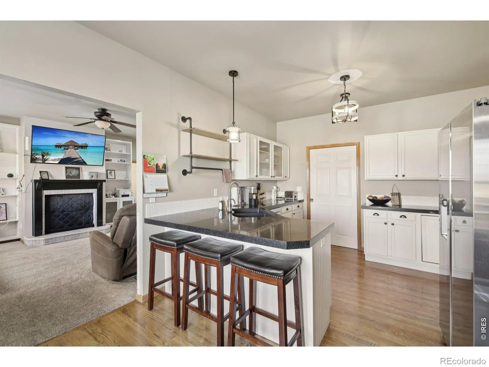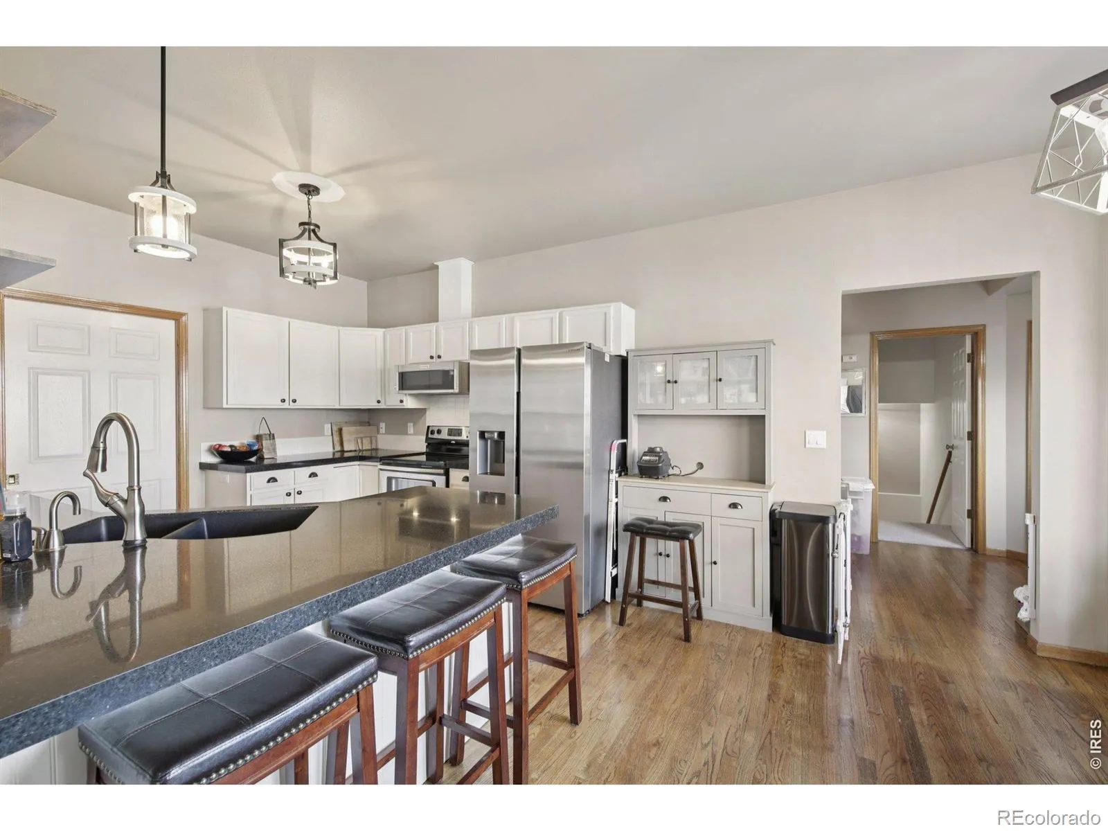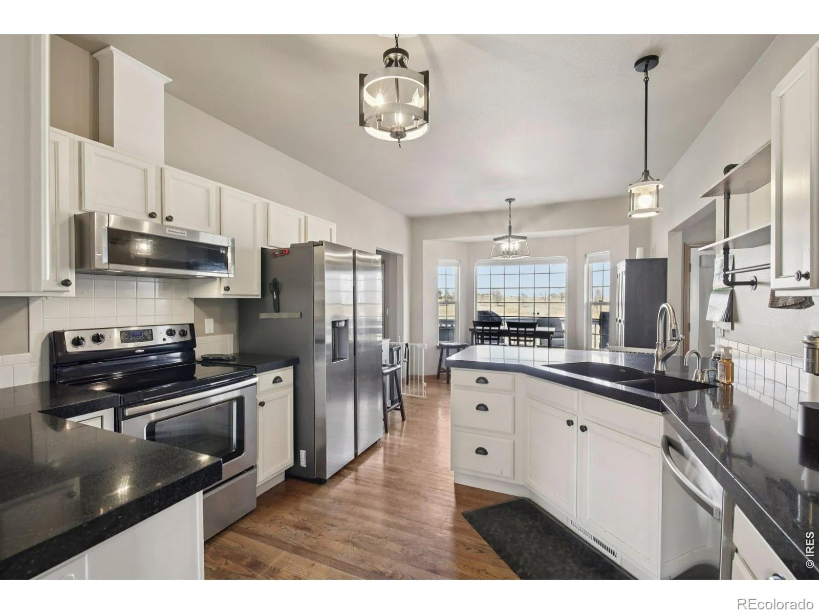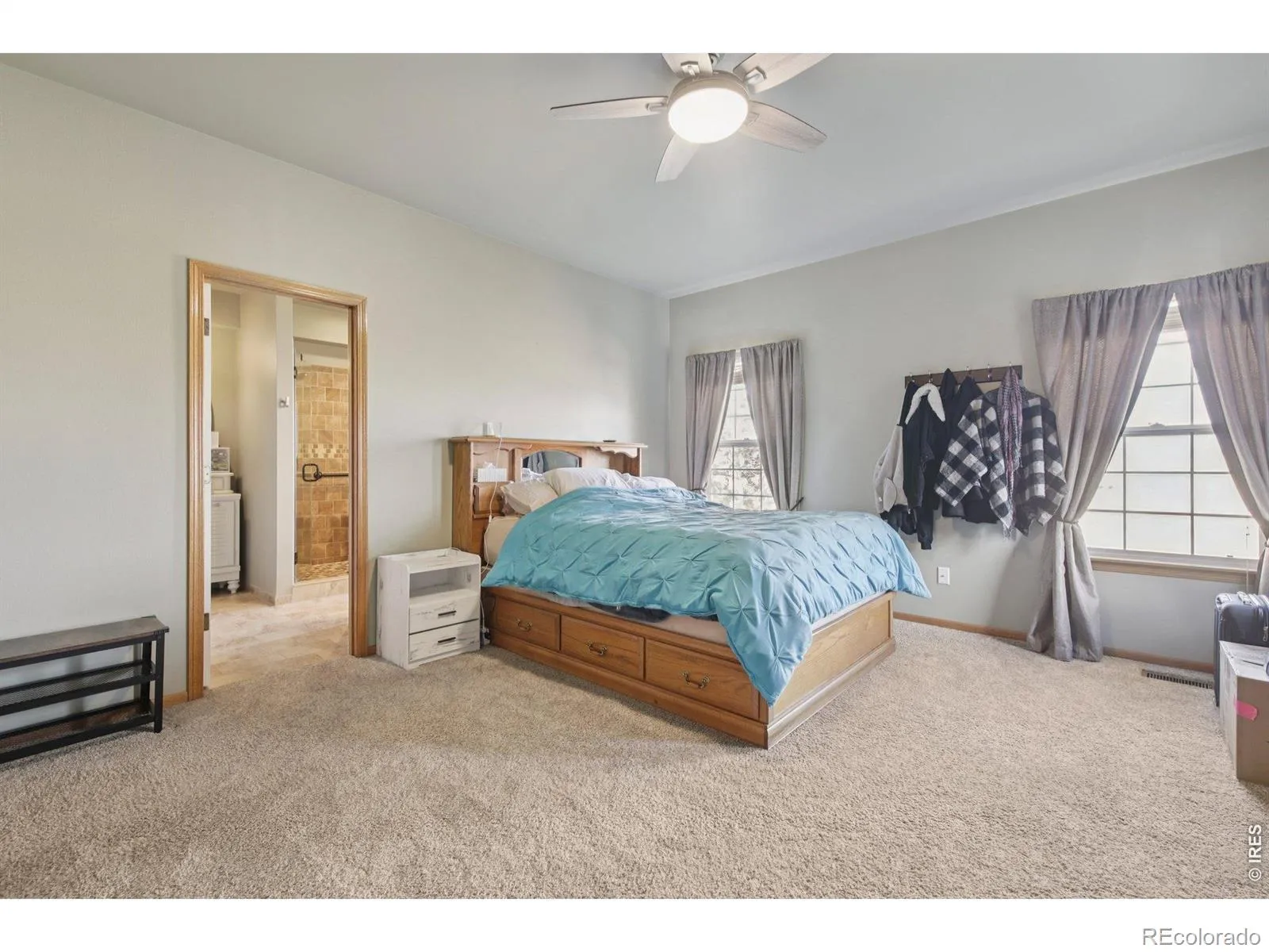 Ranch style home backing to protected greenspace, with mountain views, no HOA, no Metro District. Main floor primary bedroom plus additional large loft/bedroom above garage. Assumable VA loan, Seller will allow non-Veterans to assume loan. Designed for both comfort & flexibility, the home offers bright main-level living, a spacious primary retreat, expansive lower-level living space, & room for all. Experience the best of Colorado living in this peaceful Johnstown setting, where a charming front porch with premium composite decking & metal railings welcomes you home. This is the kind of property that would be priced dramatically higher in many neighboring markets: expansive, flexible, & set in a community that offers breathing room, growing appeal, & everyday convenience. Enjoy a rural-feeling setting without sacrificing the suburban amenities buyers actually use. Inside, natural light brightens a thoughtfully designed interior with welcoming living spaces. Just off the foyer, a sunny flex room works as a home office or formal dining space, while the living room offers warmth with a beautifully redone fireplace, updated mantle, & built-in bookshelves, all framed by huge picture windows that capture the mountain view. The eat-in kitchen features granite countertops, S.S. appliances, & access to the back deck, where protected greenspace, a walking path, & mountain views create an exceptional backdrop. The main floor is thoughtfully designed, with a spacious primary suite featuring a large walk-in shower & walk-in closet, plus 2 additional bedrooms separated by a full bath. Upstairs, a massive non-conforming bedroom adds even more flexibility. The finished basement expands the home with a large family room, 2 additional bedrooms, a 3/4 bath, workshop & storage space. A brand-new furnace adds peace of mind. Mature trees, professional landscaping, a large lawn, a large shed, & gutter covers support easy outdoor living.