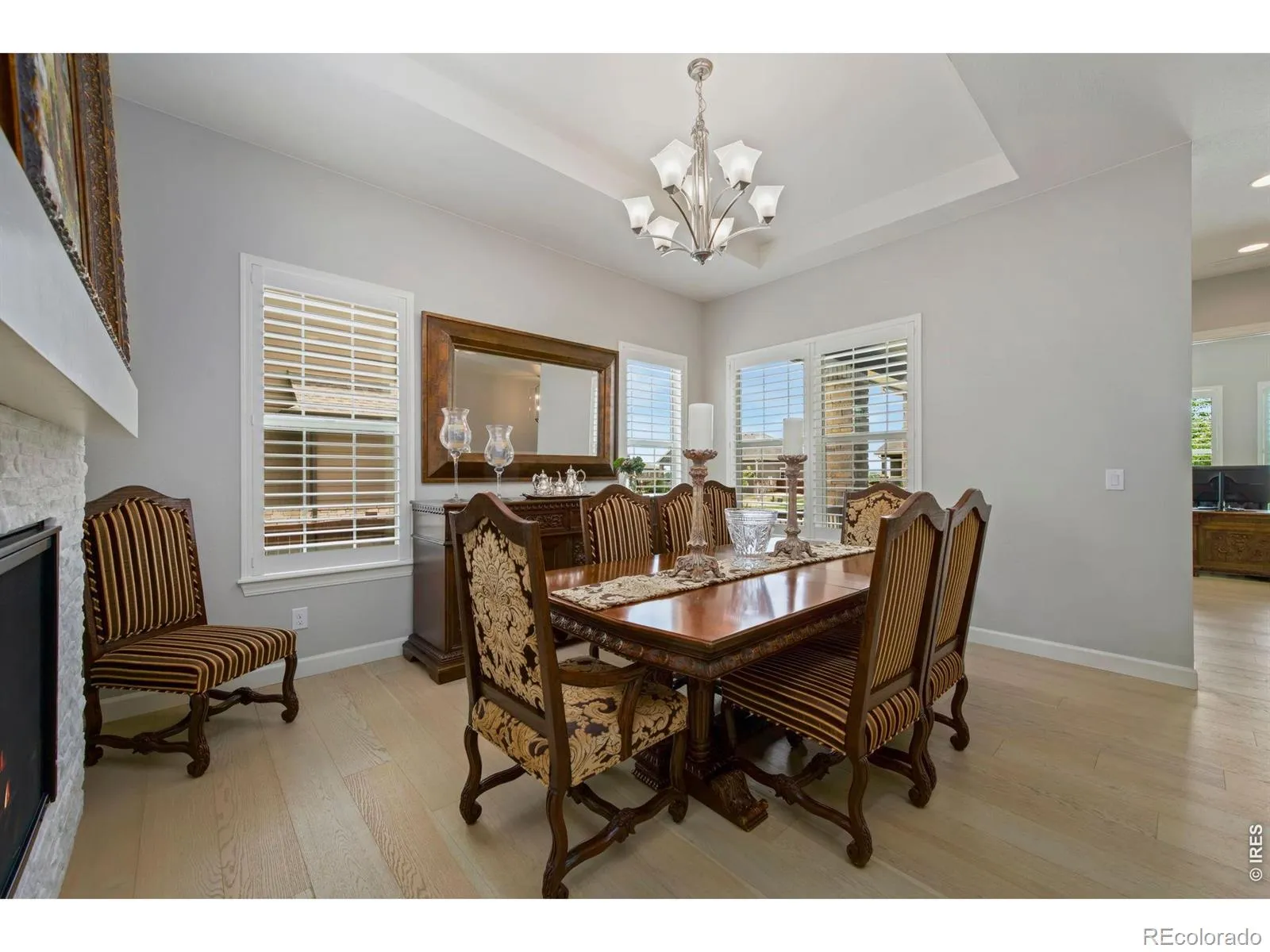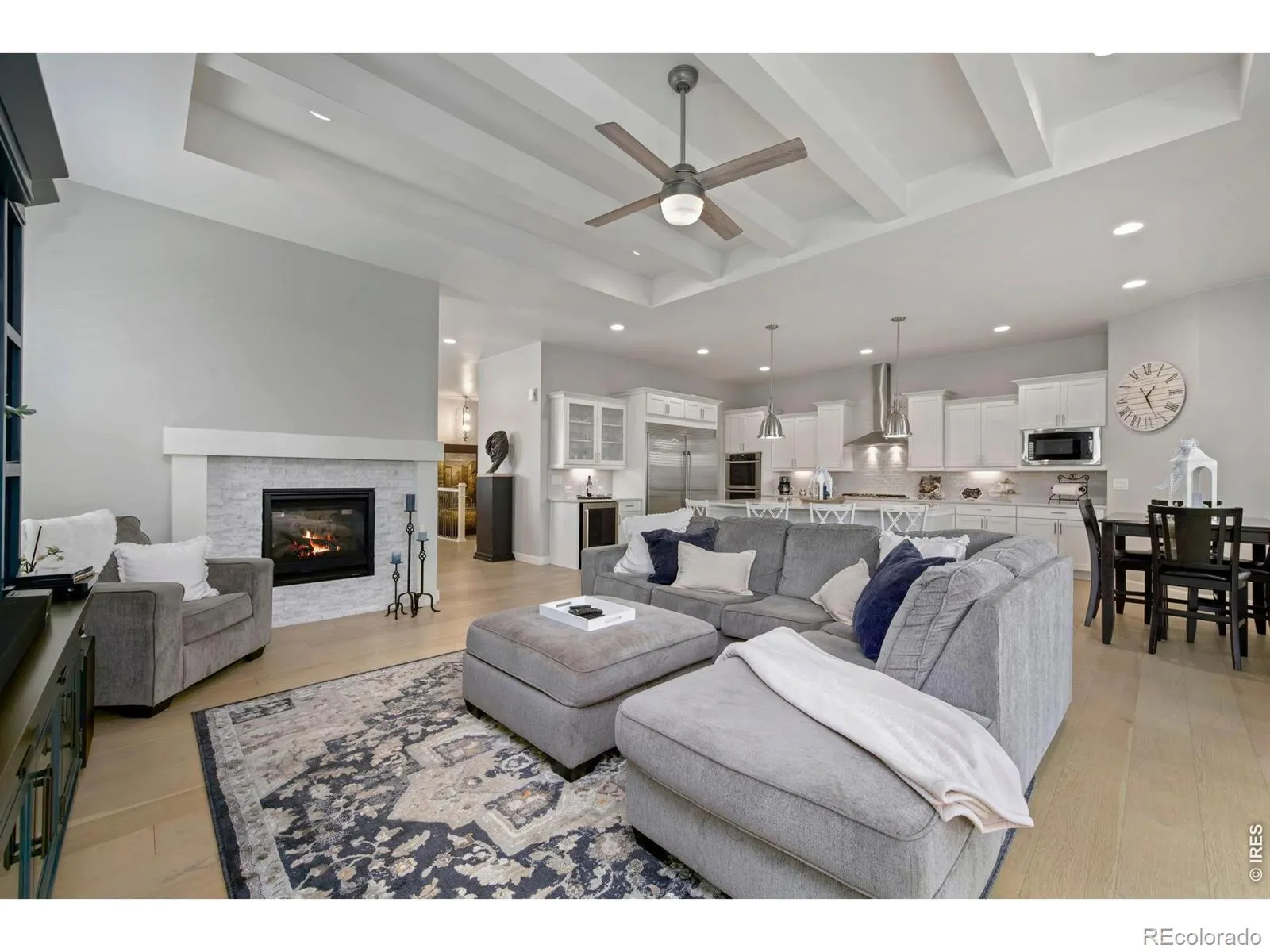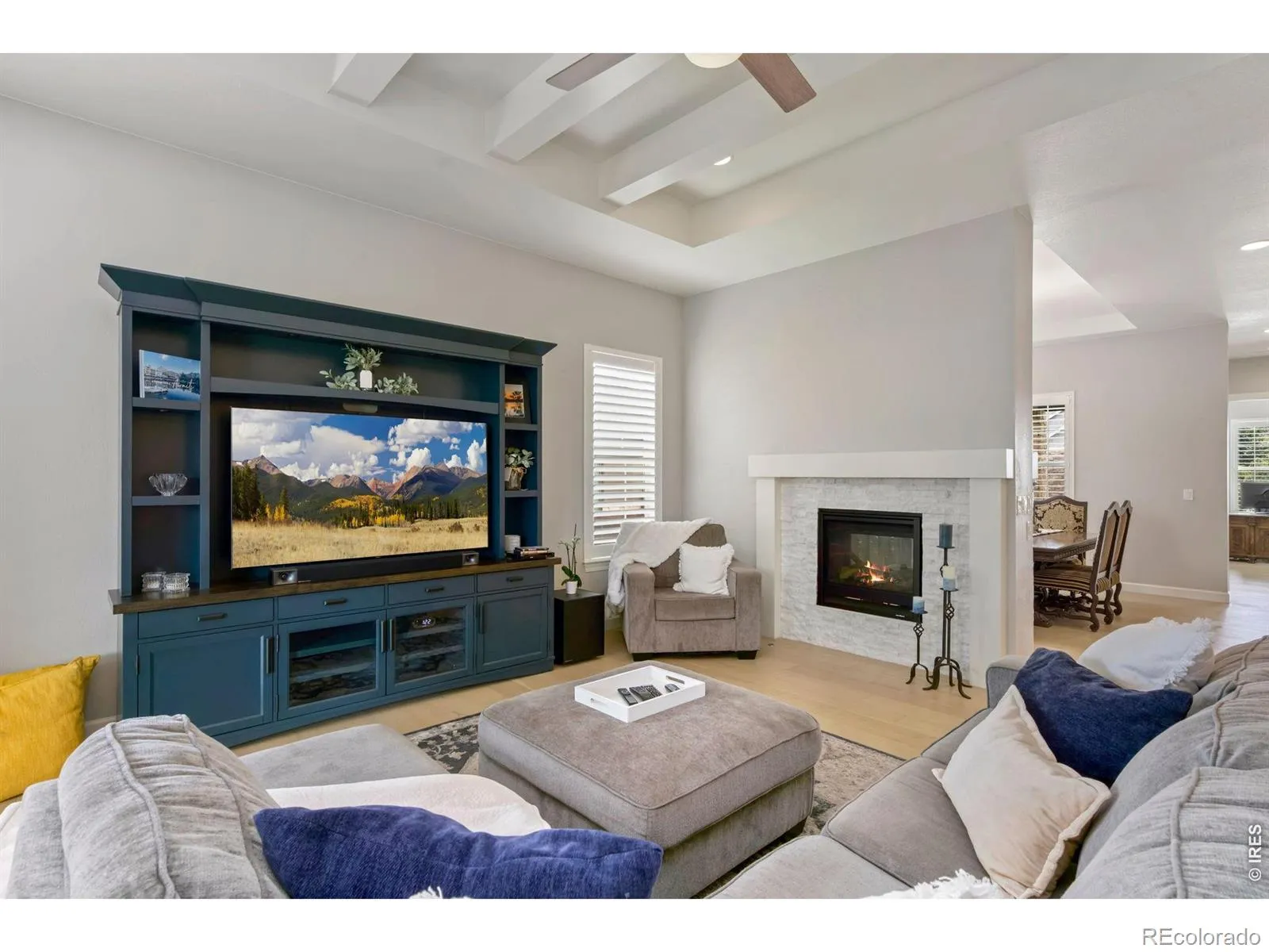Colorado outdoor living, done right. Stylish custom ranch backing to private open space in coveted Timnath Ranch. The covered patio with granite grilling station, outdoor fireplace, extends your living space across the seasons. Inside, beam ceilings, wide-plank wood floors, and a double-sided fireplace set the tone. The chef’s kitchen features a centerpiece gas range, double oven, and massive quartz island – a layout that keeps the cook in the conversation. Retreat to the main-level primary suite with a spa-inspired 5-piece bath and freestanding soaking tub. The finished basement delivers a rec room, wet bar, workout room, guest bedroom, and 3/4 bath – flex space works as a 5th bedroom or home office. 3-car garage, fenced in dedicated pet space & yard, and professional landscaping complete the package. Clubhouse, pool, fitness center, and pond just steps away. Minutes to I-25, Fort Collins, top-rated Poudre schools, and shopping.